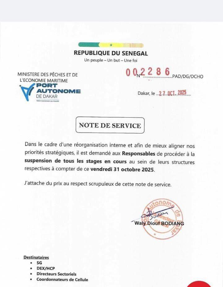 Dans le cadre de la réorganisation interne du Port Autonome de Dakar, le Directeur a demandé aux responsables de procéder a la suspension de tous les stages en cours.