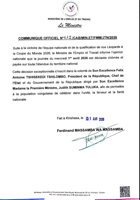 Dans un communiqué officiel signé par le ministre de l’Emploi et du Travail, Ferdinand Massamba Wa Massamba, la journée du mercredi 1er avril 2026 est déclarée chômée et payée sur l’ensemble du territoire national. Une décision qui vise à permettre à la population de vivre pleinement ce moment de fierté collective.