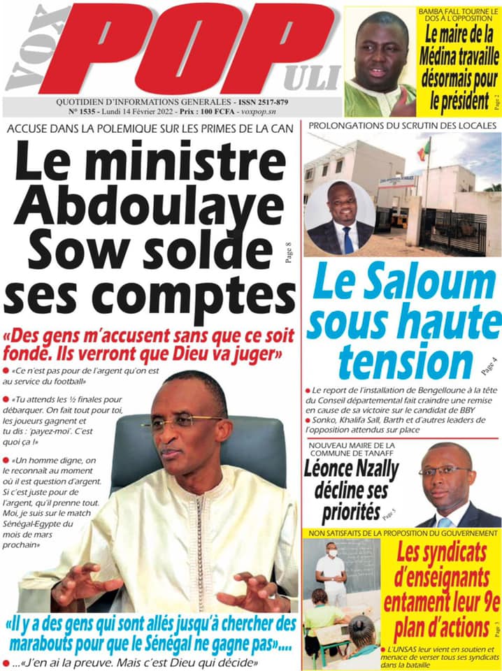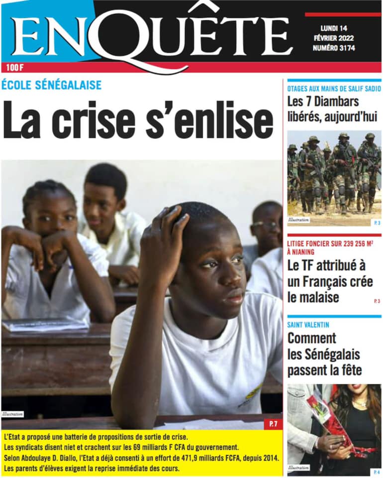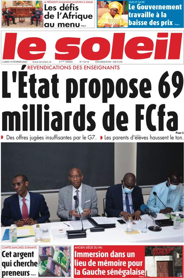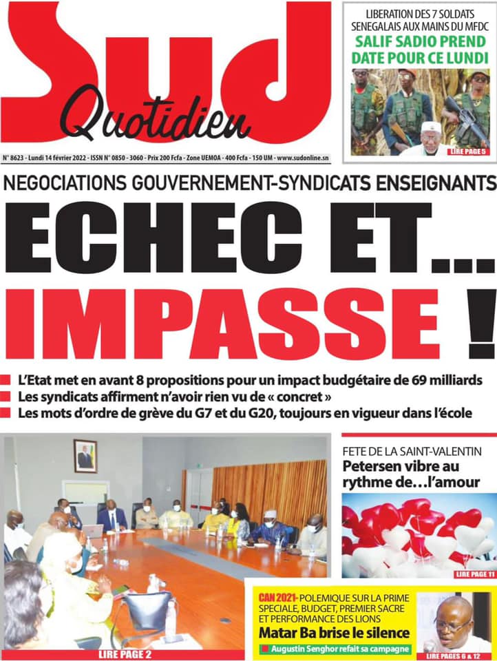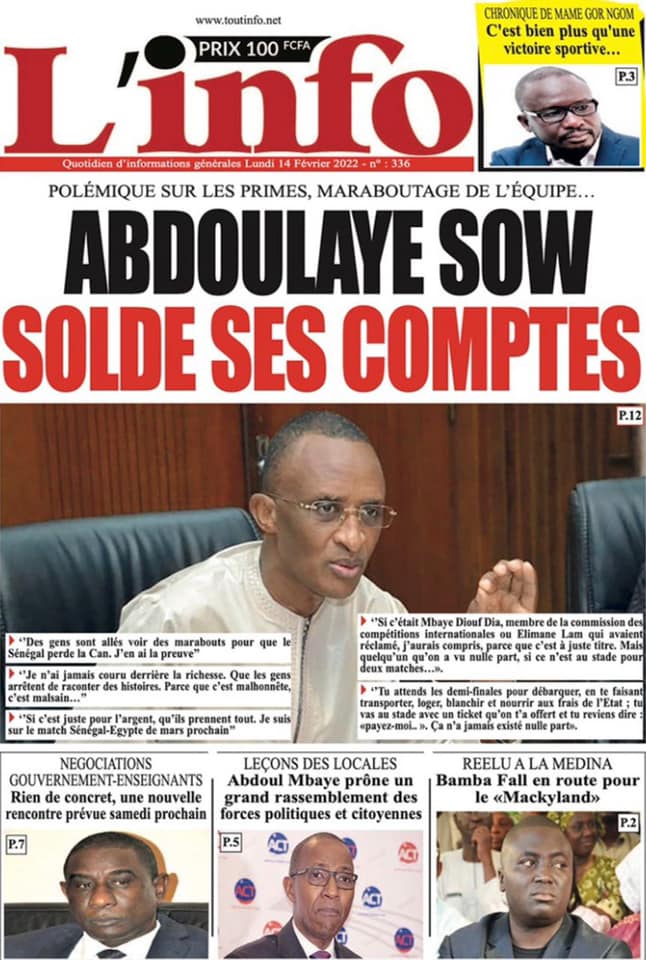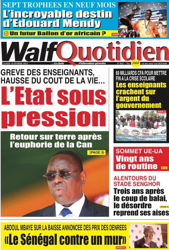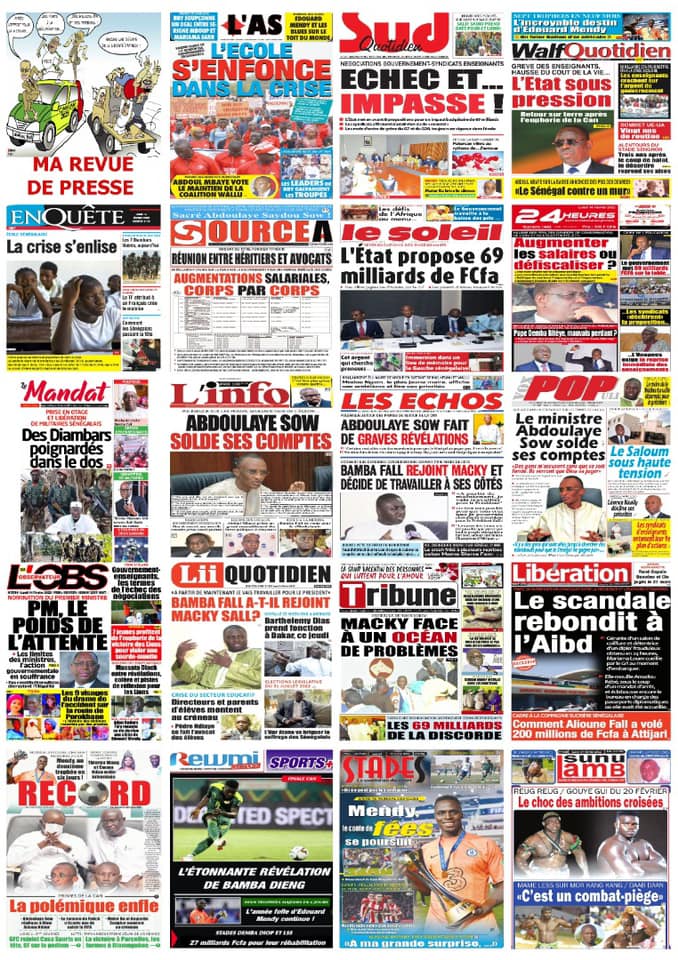 Les quotidiens s’époumonent à la Une ce lundi 14 février et sur les primes spéciales allouées aux Lions du football qui font désordre et sur cette masse d’argent déposée par le Gouvernement sur la table des enseignants toujours hors des classes.