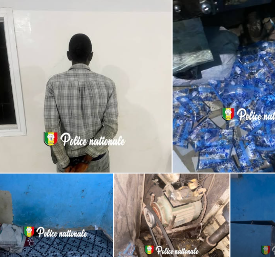 Sur la base d’un « renseignement opérationnel », les policiers ont localisé le suspect à son domicile ce 5 décembre vers 20h. La descente a révélé son autre activité : ils l’ont « surpris en pleine activité autour de sa fabrique de sachets d’eaux ». Les enquêteurs ont constaté « dans un local dégageant une mauvaise odeur », la présence d’un réservoir et d’une machine, ainsi qu’« une pile de cinquante-six (56) paquets de sachets d’eaux à l’enseigne « Si bon Zam Zam » jonchant le sol ».