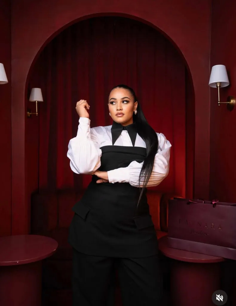 Dans une série de clichés, Faynara se présente avec une tenue structurée alliant le noir et le blanc. La mise en scène est accentuée par un décor au ton rouge profond, créant un contraste visuel qui met en valeur sa silhouette. Cette apparition confirme son positionnement en tant que figure de la mode sur la scène sénégalaise.
