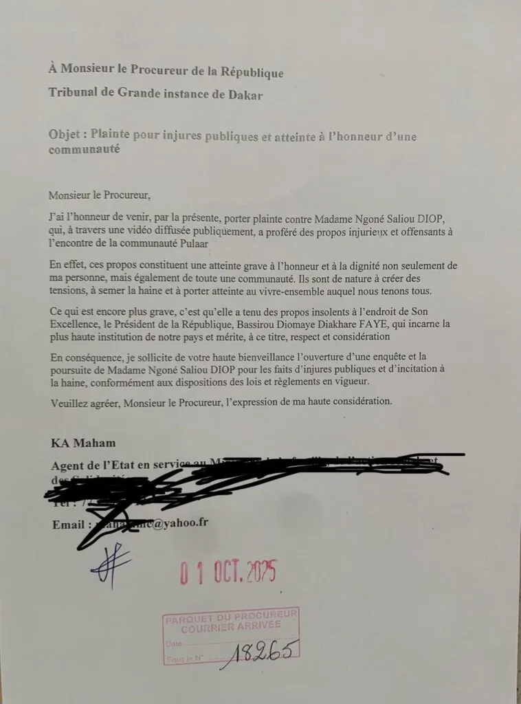 Une plainte a été déposée ce 1er octobre 2025 à l’encontre de Ngoné Saliou Diop, de la chaîne en ligne Sans Limites Tv. Le syndicaliste Maham Ka l’accuse d’injures publiques et d’atteinte à l’honneur de la communauté Pulaar, suite à la diffusion d’une vidéo.