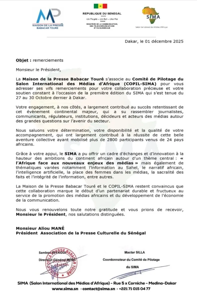 Dans un courrier officiel, les organisateurs ont souligné l’importance de la contribution de M. Mané. Selon les informations rapportées par Kawtef, sa « disponibilité, la détermination et l’accompagnement » ont été jugés essentiels à la réussite de cet événement continental. Cette implication a permis de positionner le SIMA comme un rendez-vous majeur pour la réflexion et l’innovation dans le secteur.