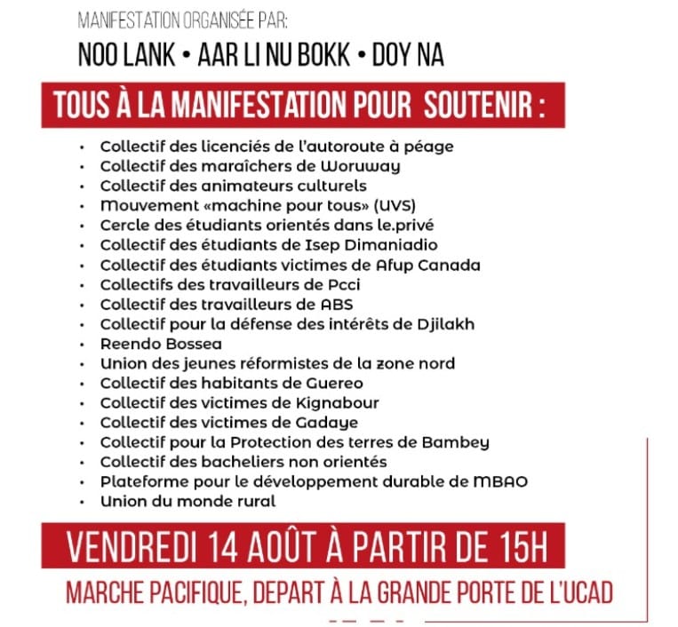Ainsi, Guy Marius Sagna était en compagnie des membres des mouvements Aar Li Nu Bokk, No Lank et Doy Na. Ils exigent un meilleur traitement des étudiants orientés dans le privé, des ordinateurs pour les étudiants de l’UVS, le paiement des 14 mois d’arriérés que Pcci et Sonatel doivent aux travailleurs de Pcci, entre autres revendications au nombre de 25.