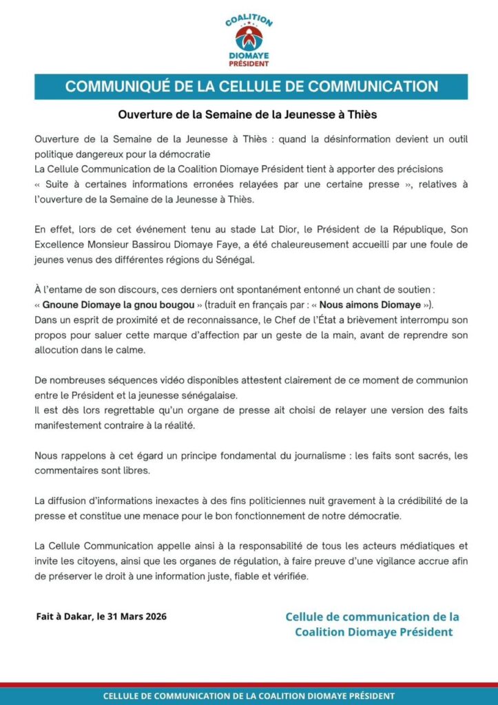 La cellule de communication de la coalition Diomaye Président tient à apporter des précisions « suite à certaines informations erronées relayées par une certaine presse », relatives à l’ouverture de la Semaine de la Jeunesse à Thiès.