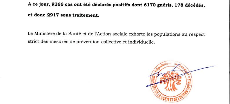 Au jeudi 23 juillet 2020, le Sénégal comptabilisait 9 266 cas déclarés positifs, dont 6 170 guéris, 178 décédés et 2 917 sous traitement.