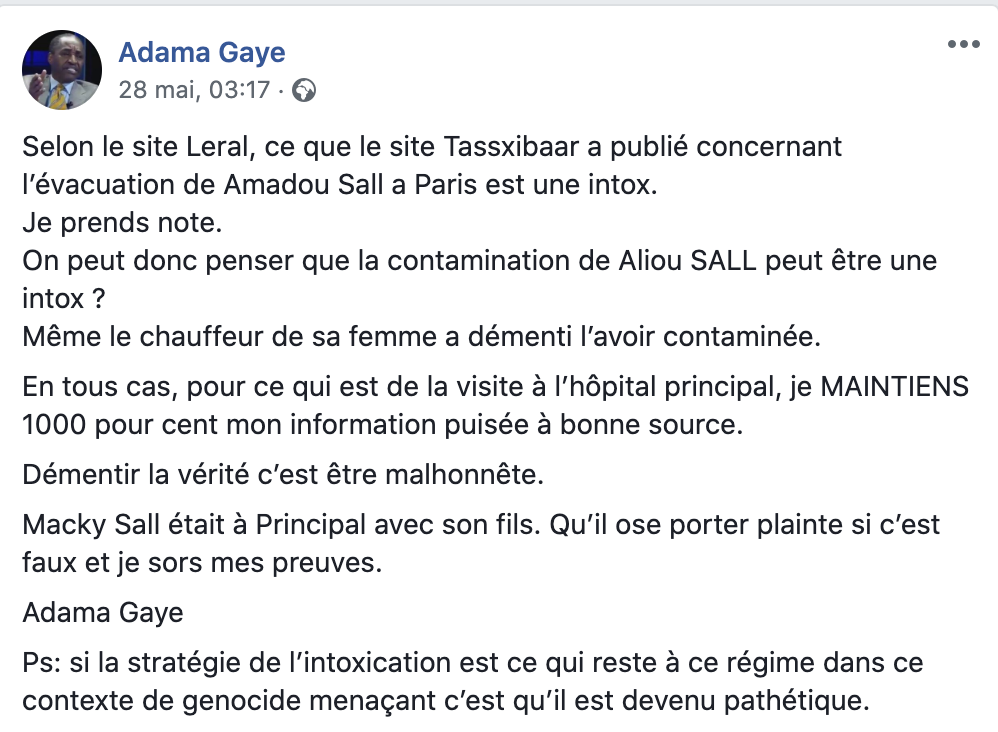 Le fils aîné du chef de l’Etat Macky Sall était annoncé dans la liste des personnes infectées par le Covid-19 au sein de la famille présidentielle, comme le cas du frangin Aliou Sall qui est déjà sujette à controverse. Amadou Sall a démenti le journaliste Adama Gaye qui avait fait un post sur facebook, reproduit par Senego. Regardez !