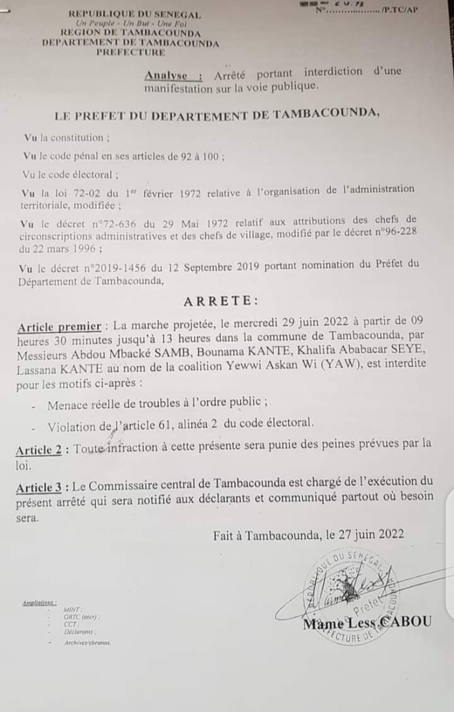 Le préfet de Tambacounda a interdit la marche projetée ce mercredi 29 juin, par la coalition Yewwi Askan Wi. Mame Less Cabou évoque les menaces réelles de troubles à l’ordre public et le violation de l’article L.61 du Code électoral.