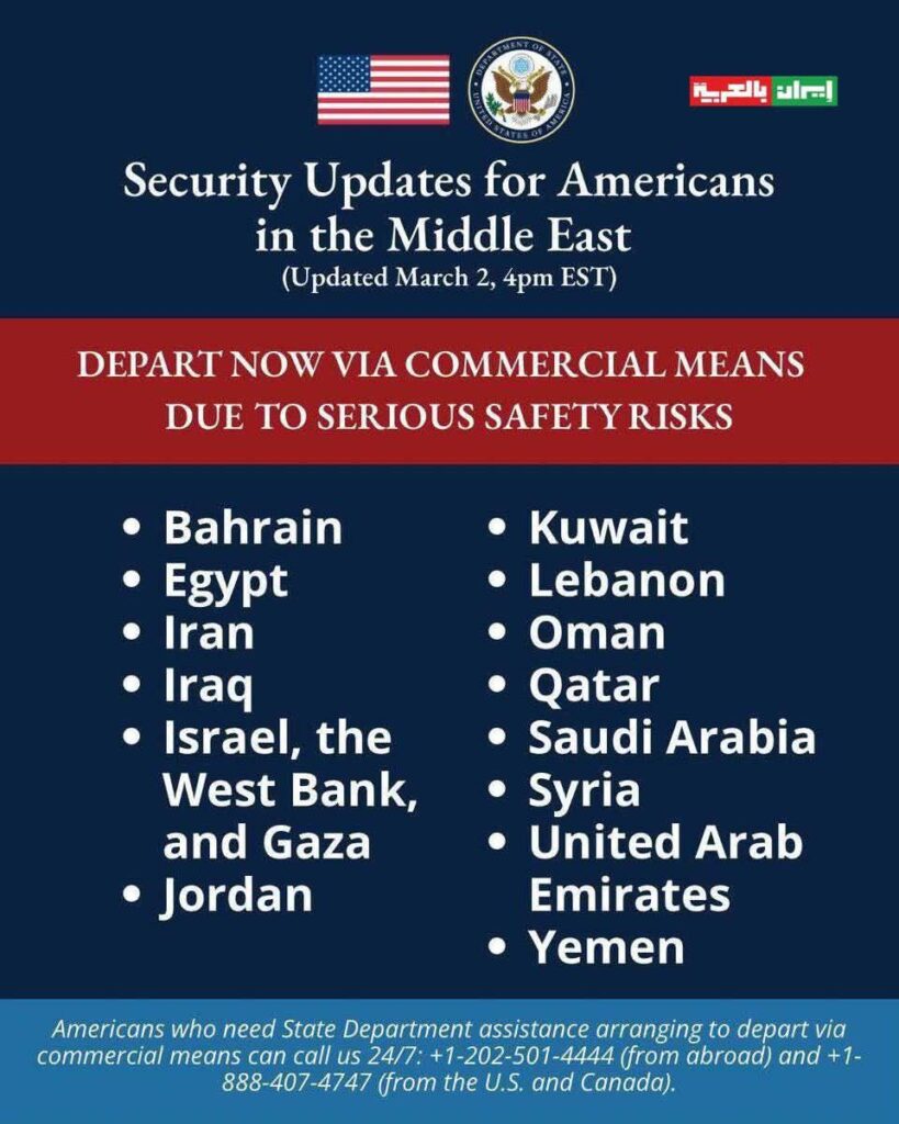 Le département d’État américain recommande à ses ressortissants de quitter rapidement les pays suivants en raison de graves risques pour la sécurité : Bahreïn, Égypte, Iran, Irak, Israël, Cisjordanie, Gaza, Jordanie, Koweït, Liban, Oman, Qatar, Arabie saoudite, Syrie, Émirats arabes unis et Yémen.