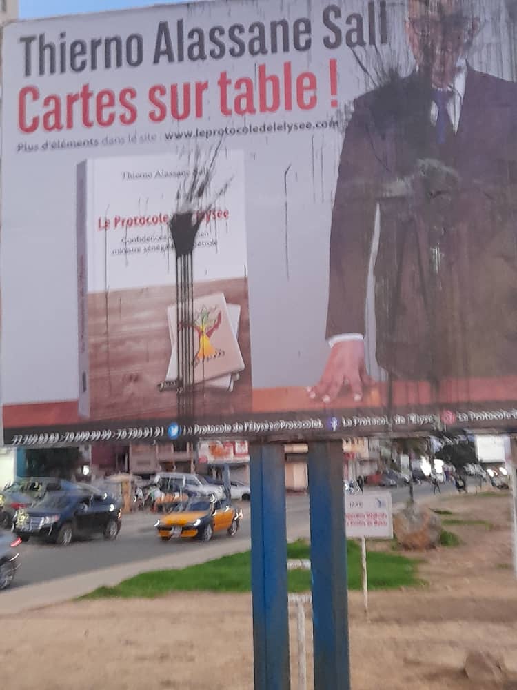 Le livre parle de scandales sur le pétrole senegalais et la on voit les affiches vandalisés avec de l huile moteur….