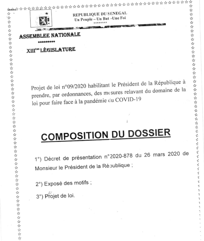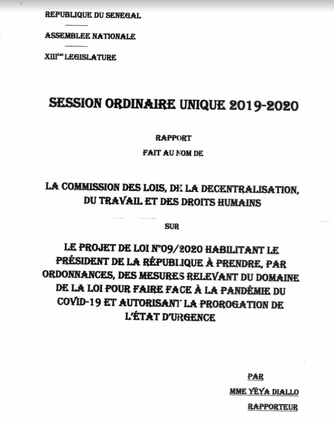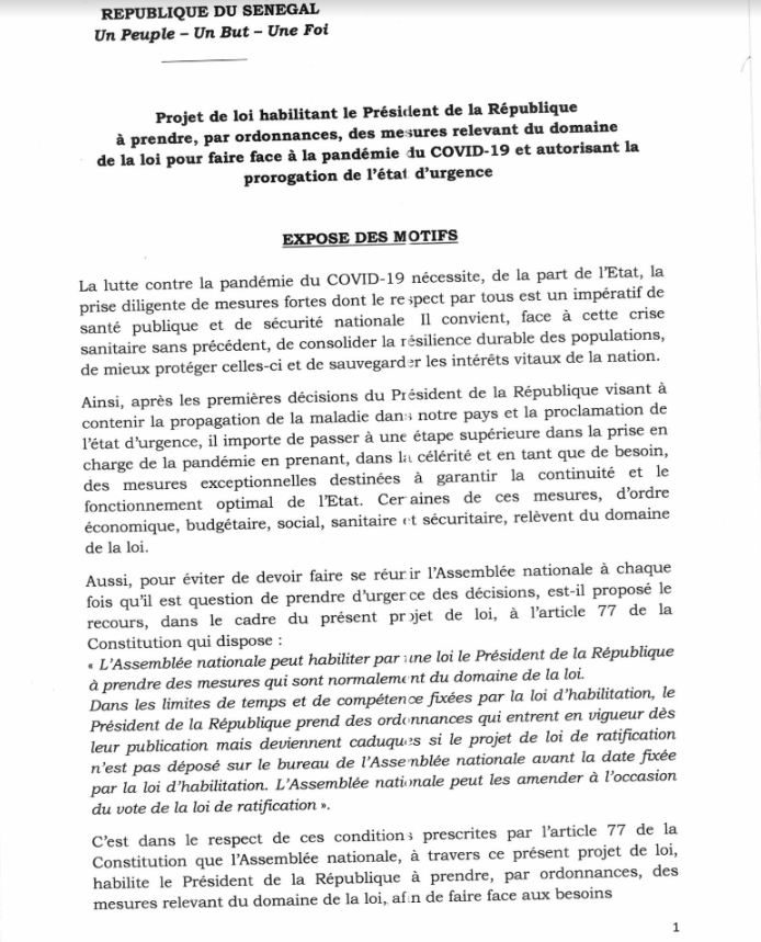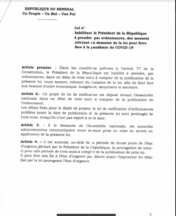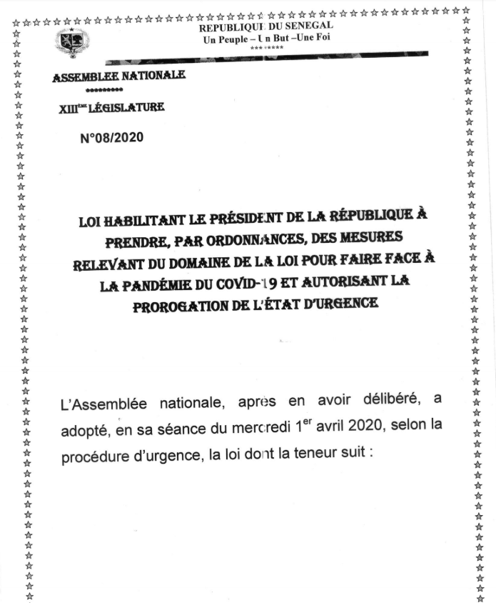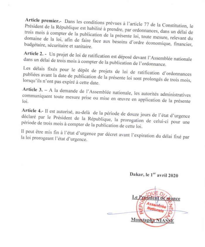 Pour proroger l’état d’urgence, Macky Sall a saisi l’assemblée nationale, conformément à l’alinéa 2 de l’article 69 de la Constitution. Le 01 avril 2020, l’assemblée nationale a adopté la loi d’habilitation, autorisant la prorogation de l’état d’urgence pour une durée de 3 mois. L’article 4 de la loi d’habilitation dispose « qu’il peut être mis fin à l’état d’urgence par décret avant l’expiration du délai fixé par la loi prorogeant l’état d’urgence ».