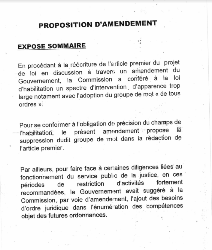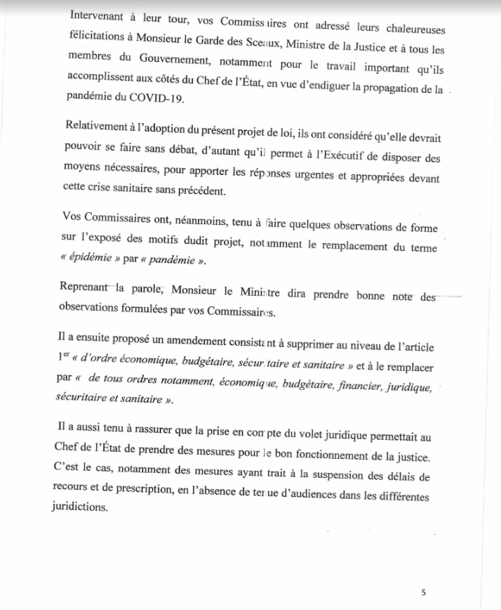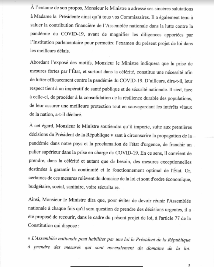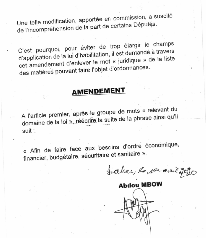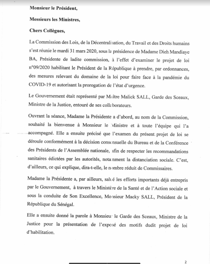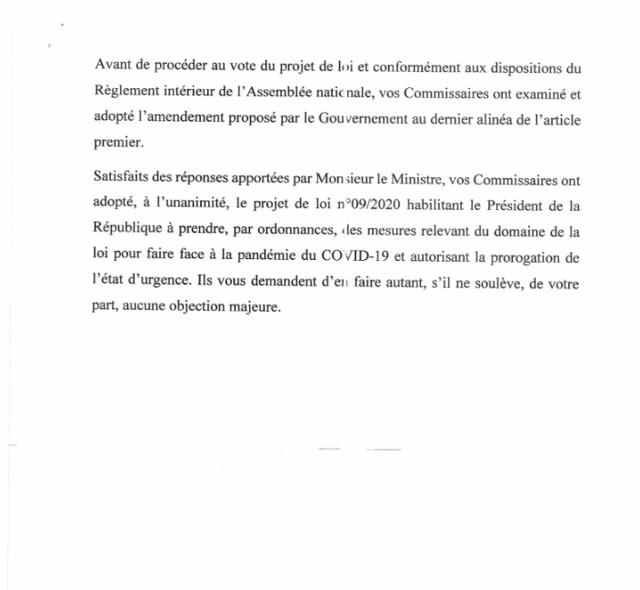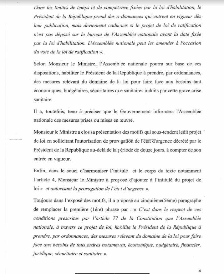 Pour proroger l’état d’urgence, Macky Sall a saisi l’assemblée nationale, conformément à l’alinéa 2 de l’article 69 de la Constitution. Le 01 avril 2020, l’assemblée nationale a adopté la loi d’habilitation, autorisant la prorogation de l’état d’urgence pour une durée de 3 mois. L’article 4 de la loi d’habilitation dispose « qu’il peut être mis fin à l’état d’urgence par décret avant l’expiration du délai fixé par la loi prorogeant l’état d’urgence ».