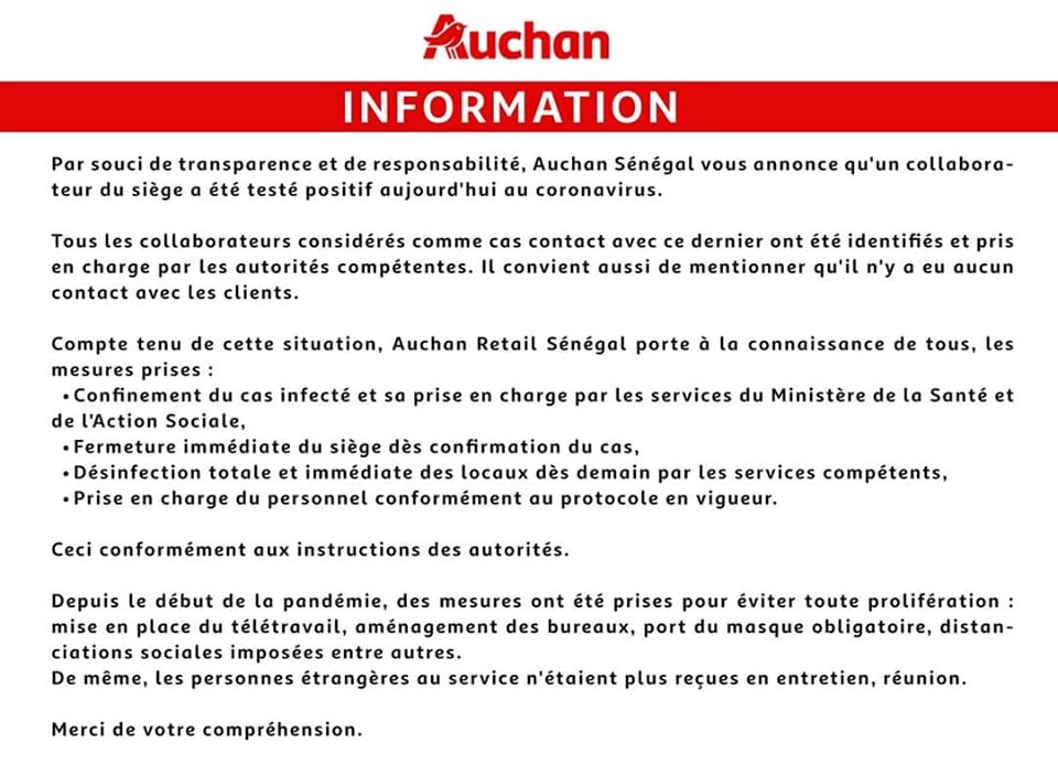 « Par souci de transparence et de responsabilité, Auchan Sénégal vous annonce qu’un collaborateur du siège a été testé positif au coronavirus ce vendredi.  Tous les collaborateurs considérés comme cas contact avec ce dernier ont été identifiés et pris en charge par les autorités  compétentes. Il convient aussi de mentionner qu’il n’y a eu aucun cas contact avec les clients.