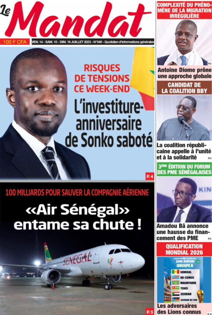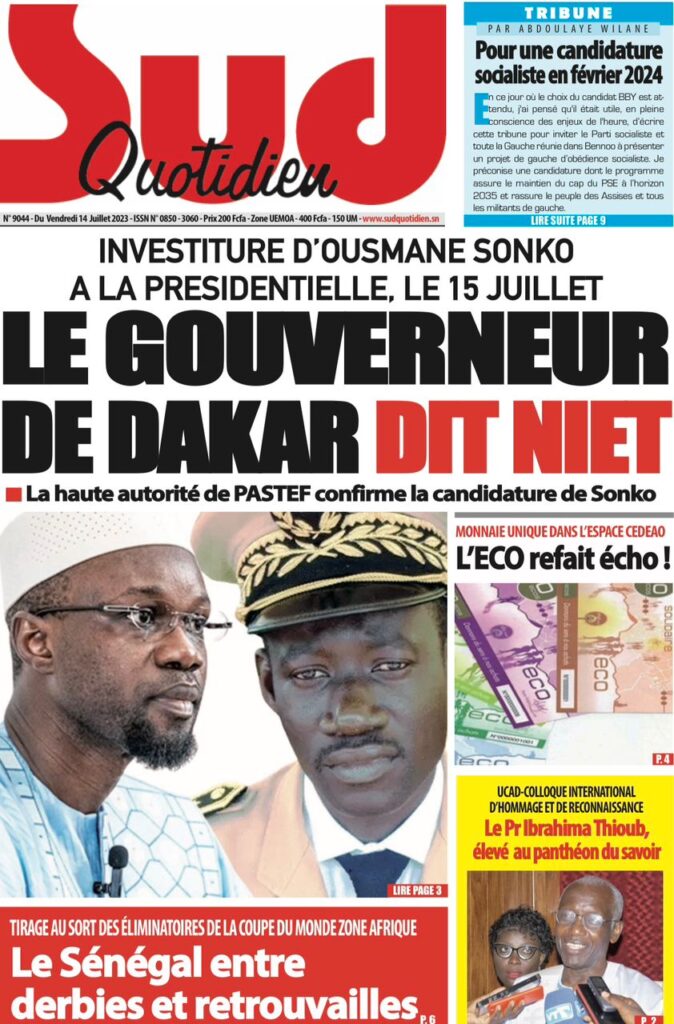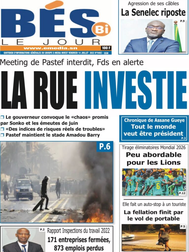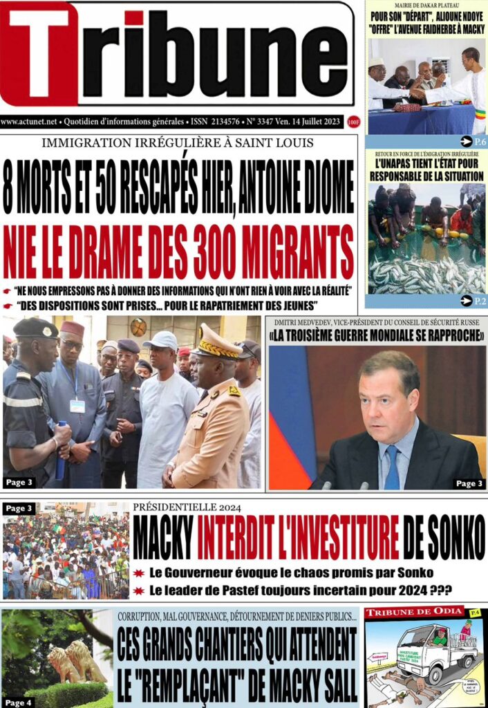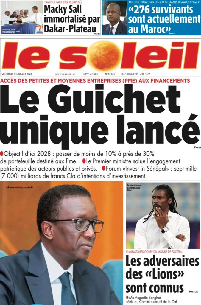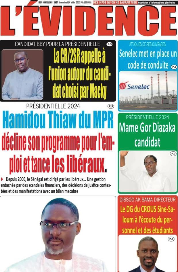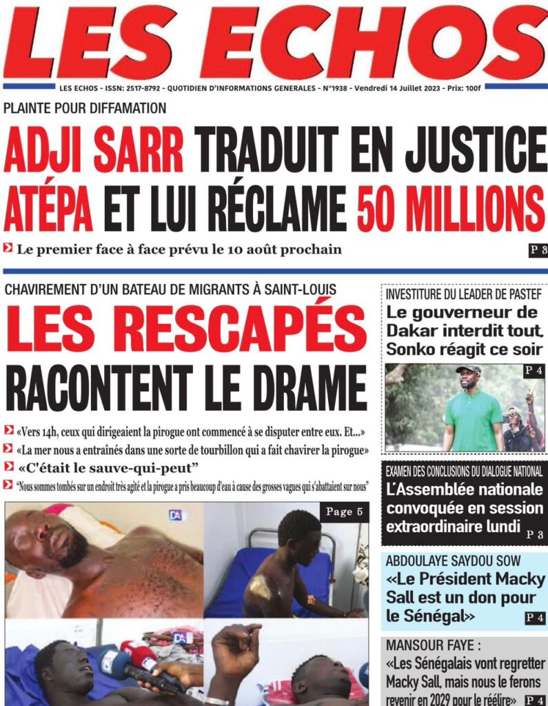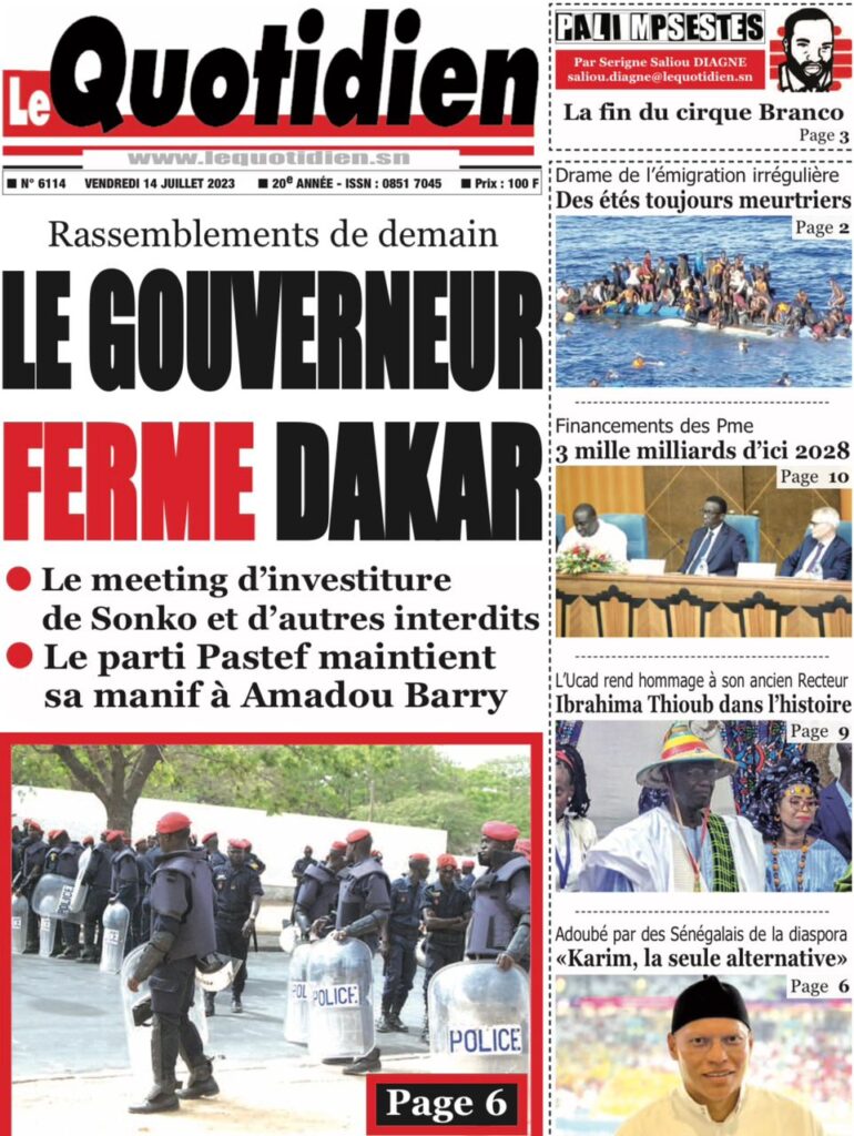 Accueil › Sénégal › Une des journaux du vendredi 14 juillet 2023 Actualités Une des journaux du vendredi 14 juillet 2023 Abdou Faty GUEYE 14 Juil 2023, 07:20 1 min Une de journaux vendredi 14 juillet 2023 Votre avis sera publié et visible par des milliers de lecteurs. Veuillez l’exprimer dans un langage respectueux. Commentaire Nom E-mail (ne sera pas visible) Enregistrer mon nom, mon e-mail et mon site web dans le navigateur pour mon prochain commentaire. Partager Partager Partager 0 Laisser un commentaire Annuler la réponseCommentaireNom E-mail (ne sera pas visible) Enregistrer mon nom, mon e-mail et mon site dans le navigateur pour mon prochain commentaire.