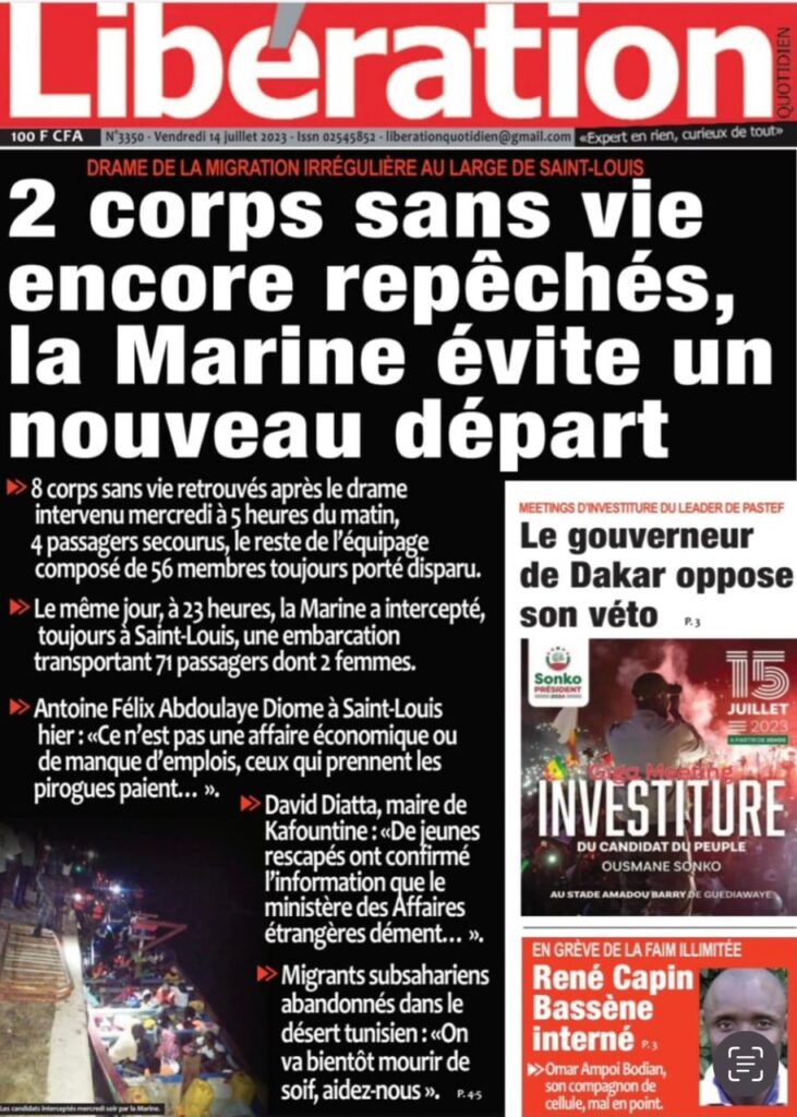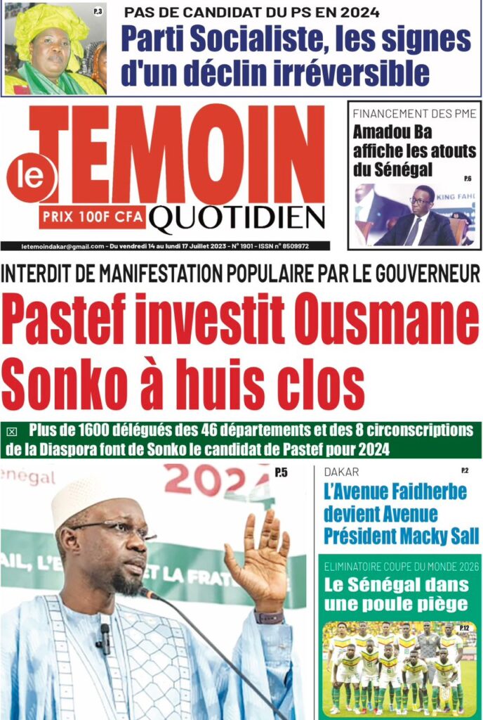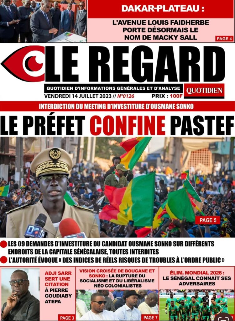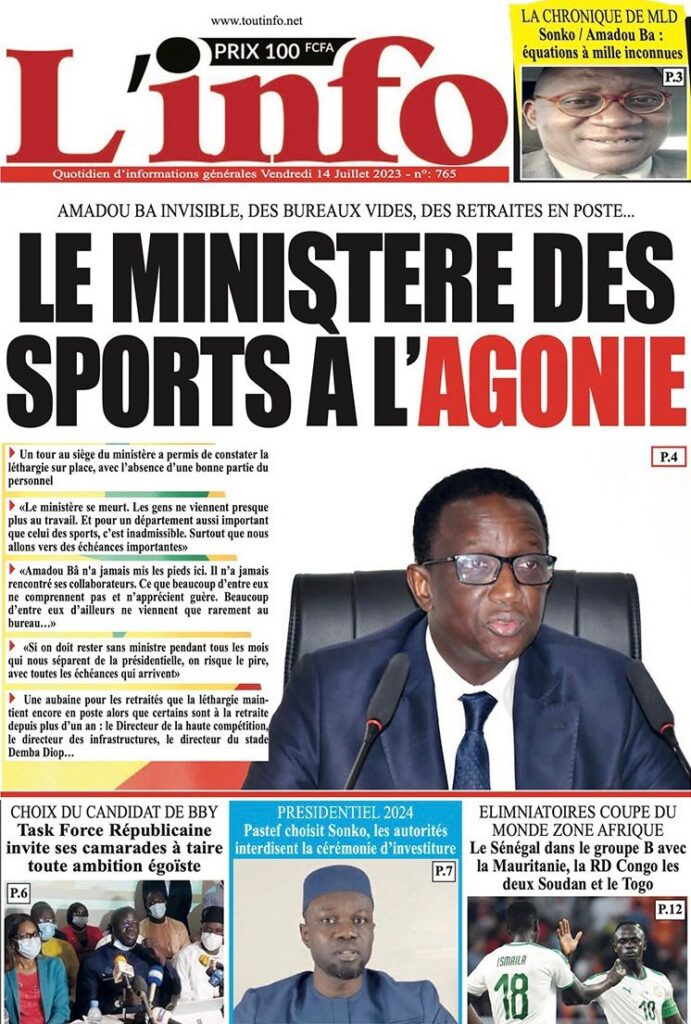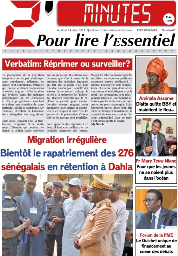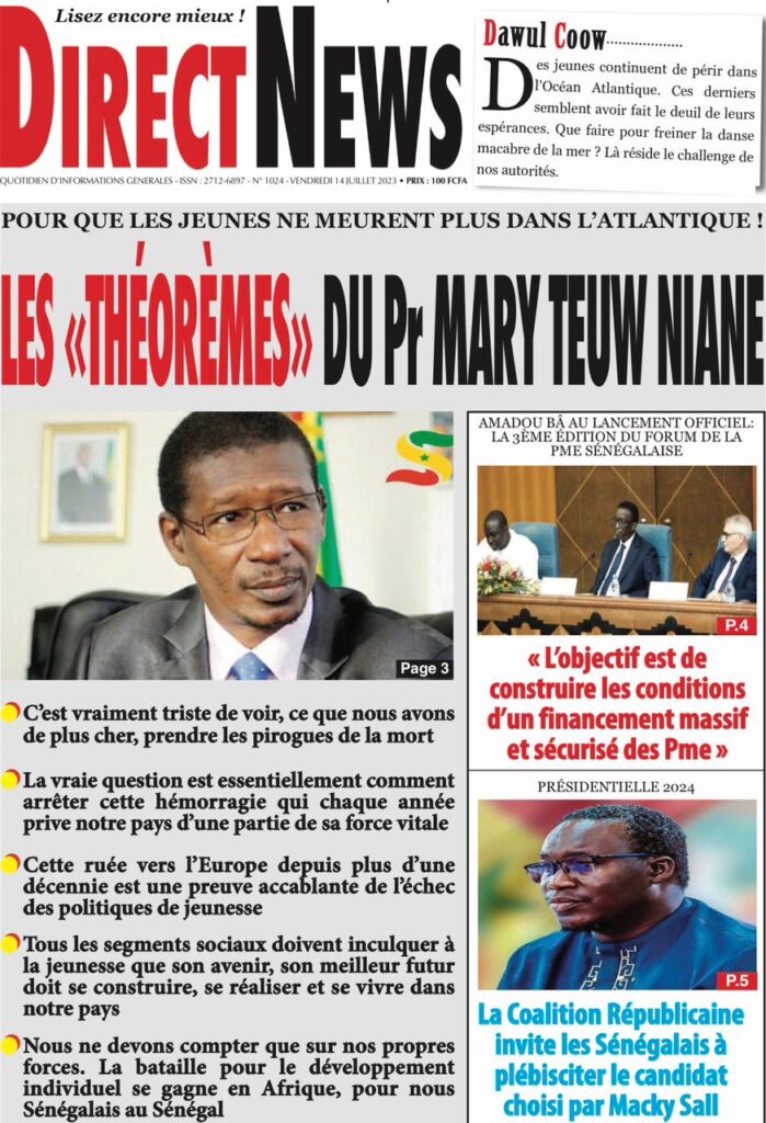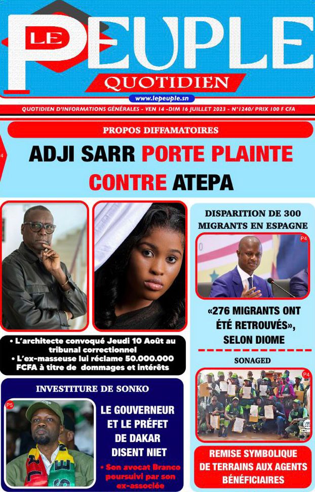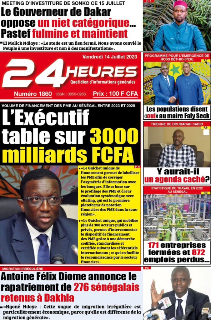 Accueil › Sénégal › Une des journaux du vendredi 14 juillet 2023 Actualités Une des journaux du vendredi 14 juillet 2023 Abdou Faty GUEYE 14 Juil 2023, 07:20 1 min Une de journaux vendredi 14 juillet 2023 Votre avis sera publié et visible par des milliers de lecteurs. Veuillez l’exprimer dans un langage respectueux. Commentaire Nom E-mail (ne sera pas visible) Enregistrer mon nom, mon e-mail et mon site web dans le navigateur pour mon prochain commentaire. Partager Partager Partager 0 Laisser un commentaire Annuler la réponseCommentaireNom E-mail (ne sera pas visible) Enregistrer mon nom, mon e-mail et mon site dans le navigateur pour mon prochain commentaire.