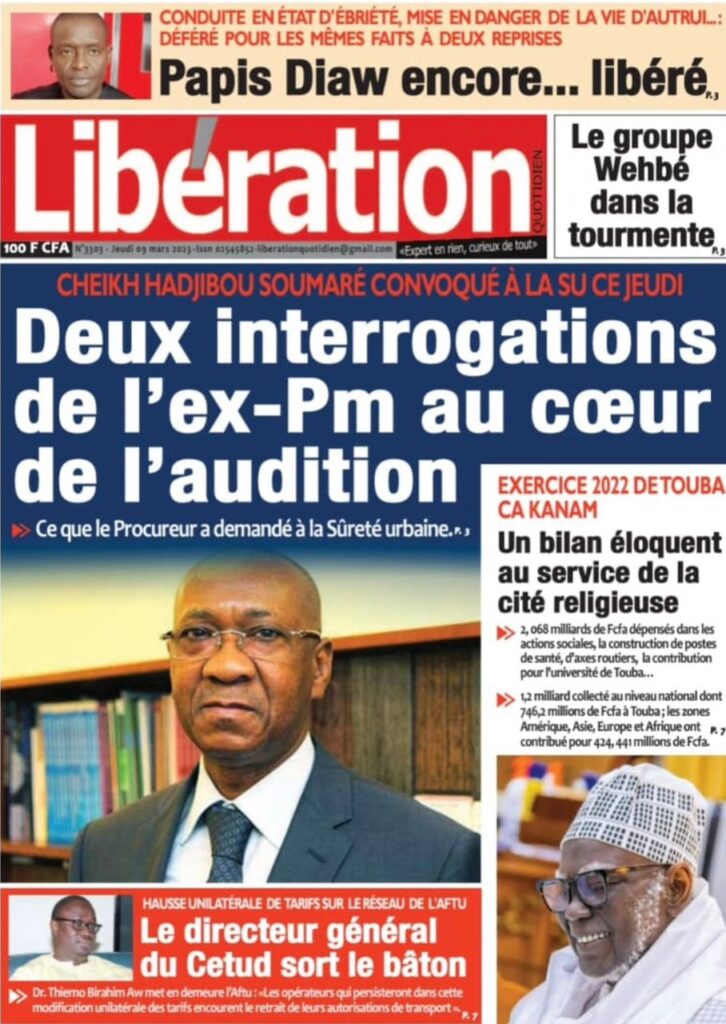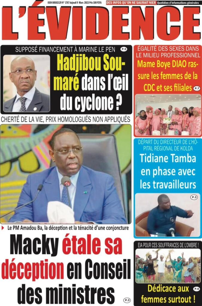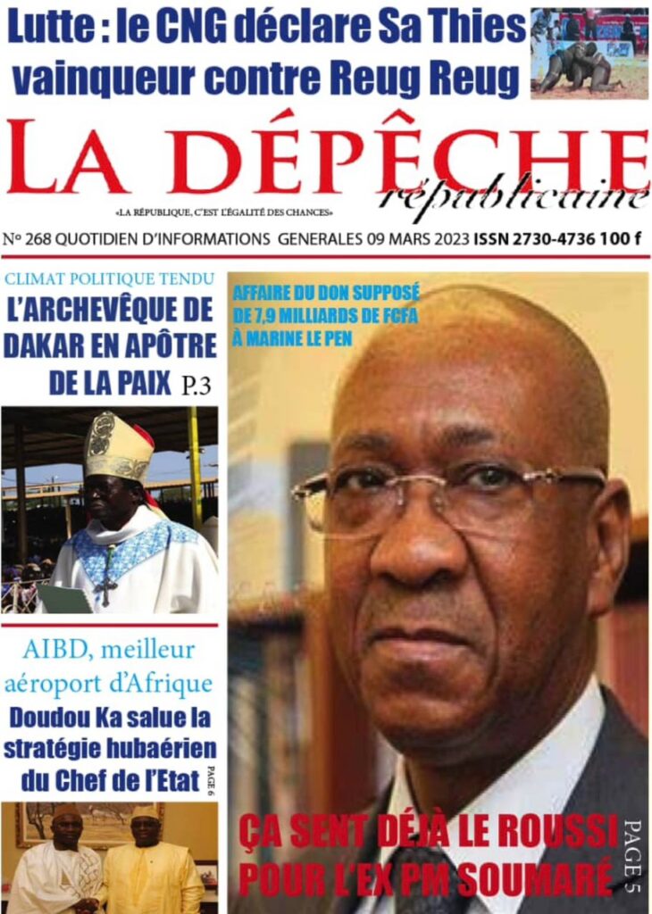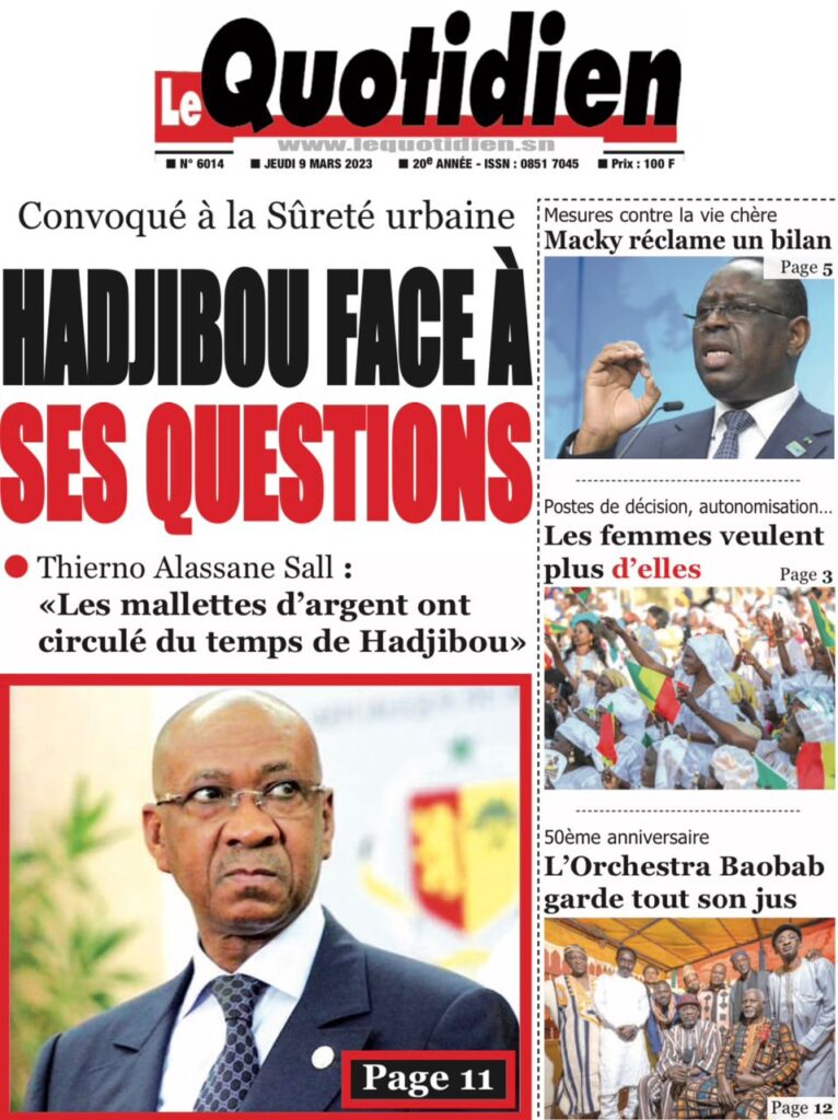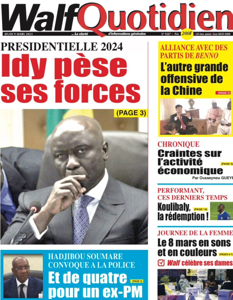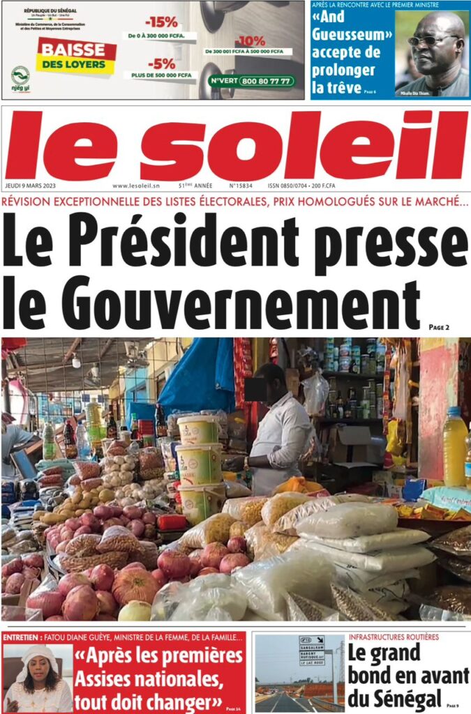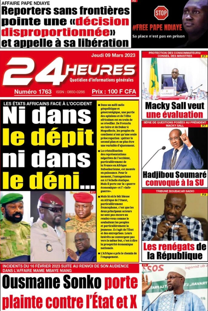 Accueil › Sénégal › Une des journaux du jeudi 09 mars 2023 Actualités Une des journaux du jeudi 09 mars 2023 Abdou Faty GUEYE 9 Mar 2023, 07:14 1 min Une des journaux du jeudi 09 mars 2023 jeudi 09 mars 2023 une des journaux Votre avis sera publié et visible par des milliers de lecteurs. Veuillez l’exprimer dans un langage respectueux. Commentaire Nom E-mail (ne sera pas visible) Enregistrer mon nom, mon e-mail et mon site web dans le navigateur pour mon prochain commentaire. Partager Partager Partager 0 Laisser un commentaire Annuler la réponseCommentaireNom E-mail (ne sera pas visible) Enregistrer mon nom, mon e-mail et mon site dans le navigateur pour mon prochain commentaire.