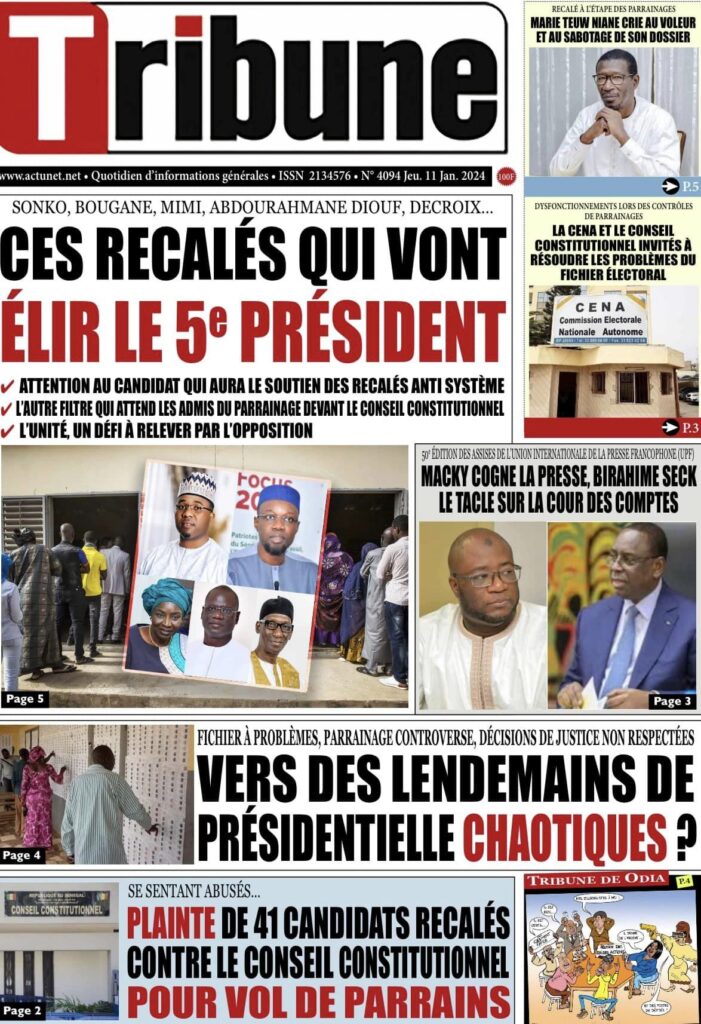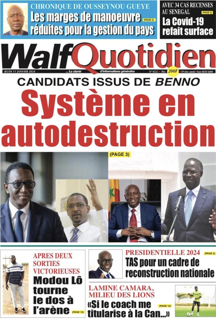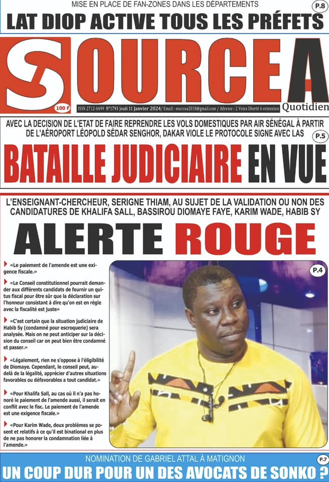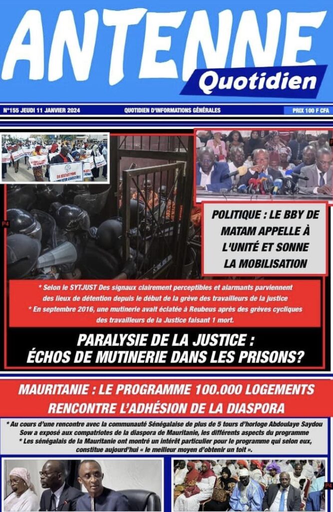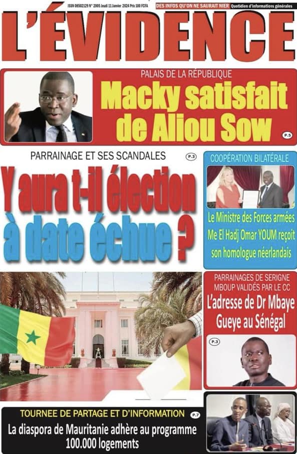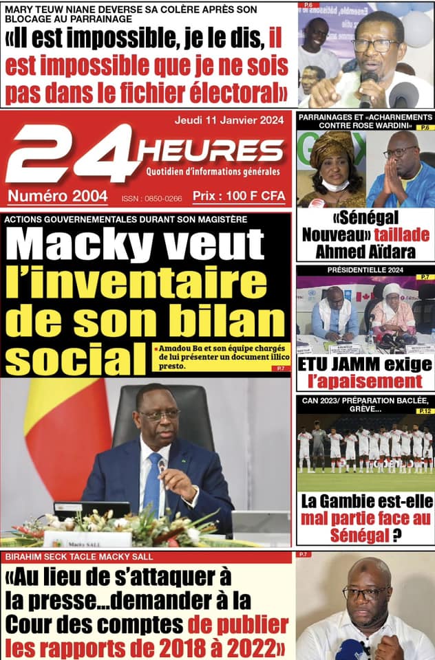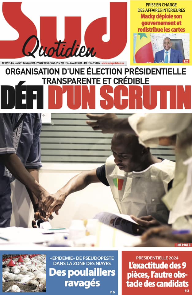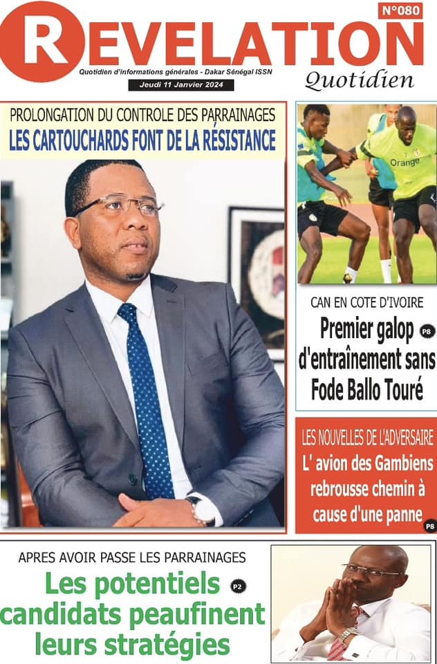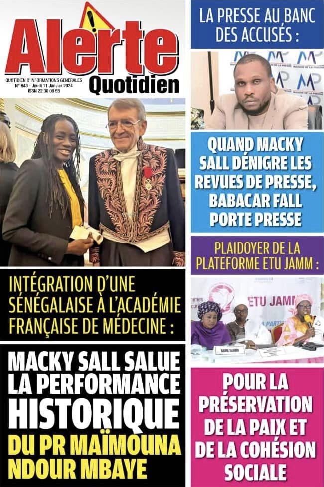 Accueil › Sénégal › Une des journaux du jeudi 11 janvier 2024 Une des journaux du jeudi 11 janvier 2024 Publié le 11 Jan 2024, à 04:59 par Abdou Faty GUEYE Une des journaux du jeudi 11 janvier 2024 Votre avis sera publié et visible par des milliers de lecteurs. Veuillez l’exprimer dans un langage respectueux. Commentaire Nom E-mail (ne sera pas visible) Enregistrer mon nom, mon e-mail et mon site web dans le navigateur pour mon prochain commentaire. Partager Partager Partager 0 Laisser un commentaire Annuler la réponseCommentaireNom E-mail (ne sera pas visible) Enregistrer mon nom, mon e-mail et mon site dans le navigateur pour mon prochain commentaire.