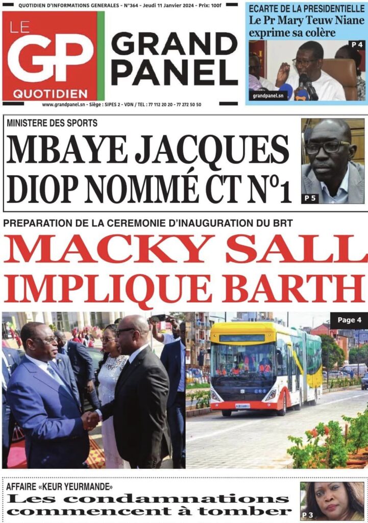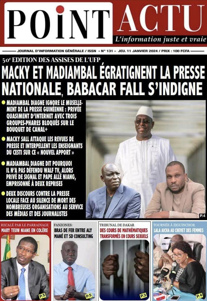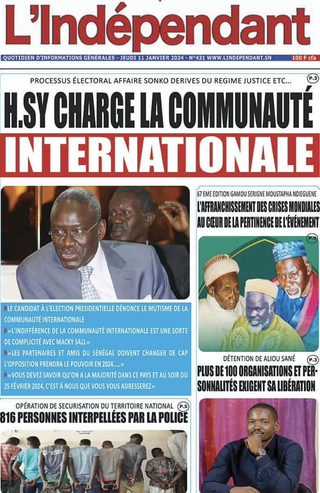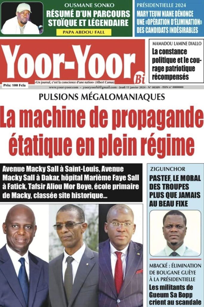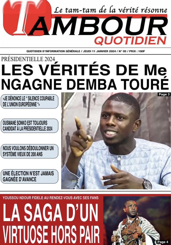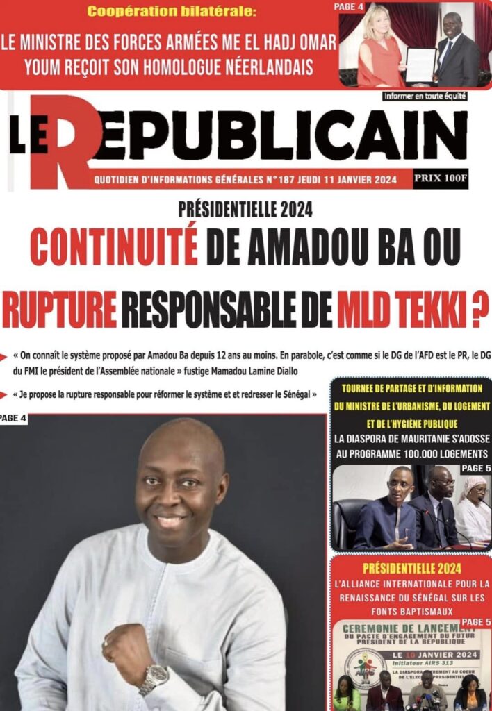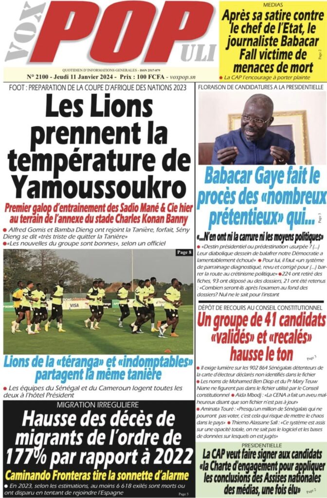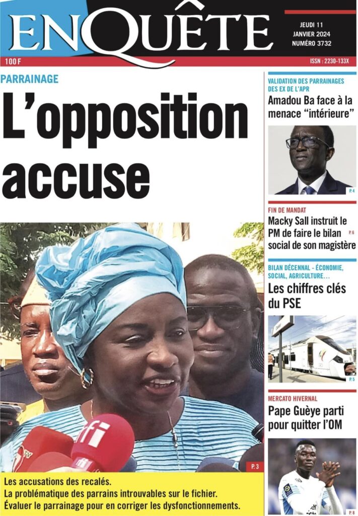 Accueil › Sénégal › Une des journaux du jeudi 11 janvier 2024 Une des journaux du jeudi 11 janvier 2024 Publié le 11 Jan 2024, à 04:59 par Abdou Faty GUEYE Une des journaux du jeudi 11 janvier 2024 Votre avis sera publié et visible par des milliers de lecteurs. Veuillez l’exprimer dans un langage respectueux. Commentaire Nom E-mail (ne sera pas visible) Enregistrer mon nom, mon e-mail et mon site web dans le navigateur pour mon prochain commentaire. Partager Partager Partager 0 Laisser un commentaire Annuler la réponseCommentaireNom E-mail (ne sera pas visible) Enregistrer mon nom, mon e-mail et mon site dans le navigateur pour mon prochain commentaire.