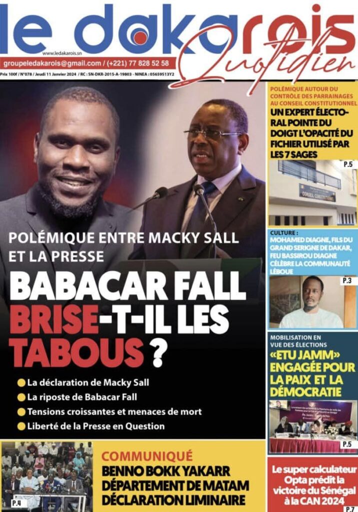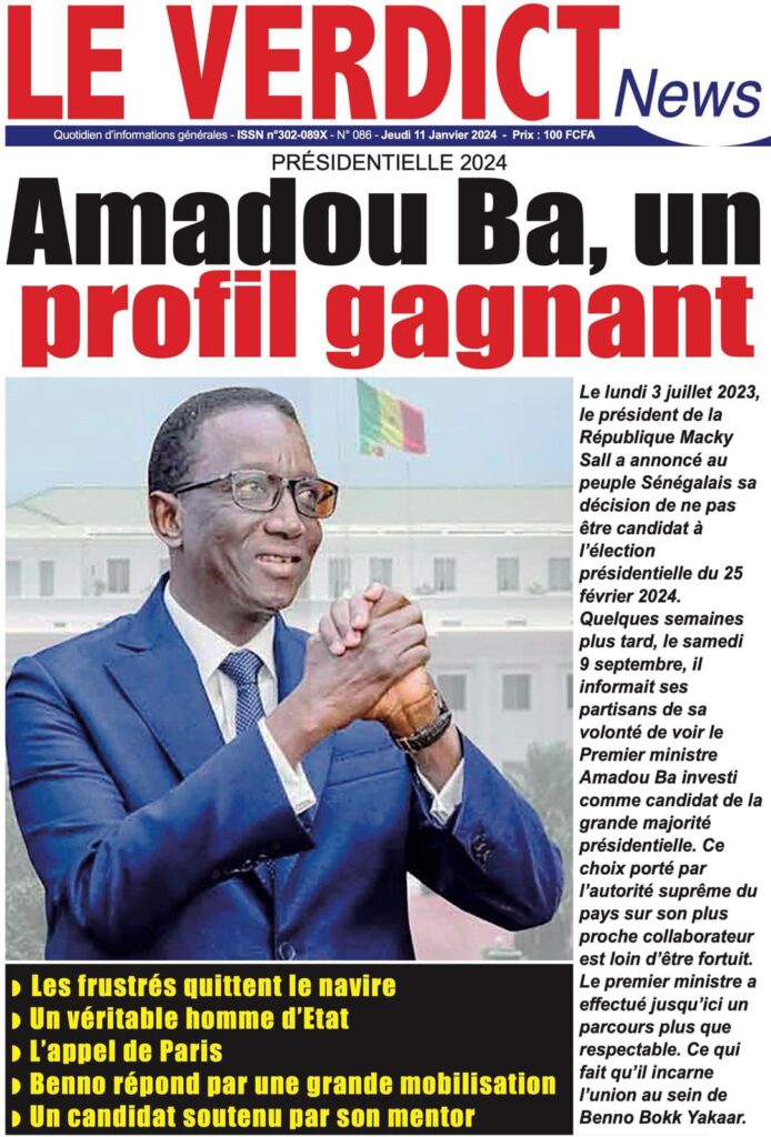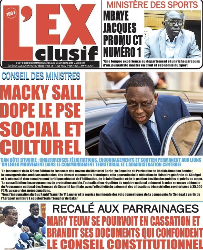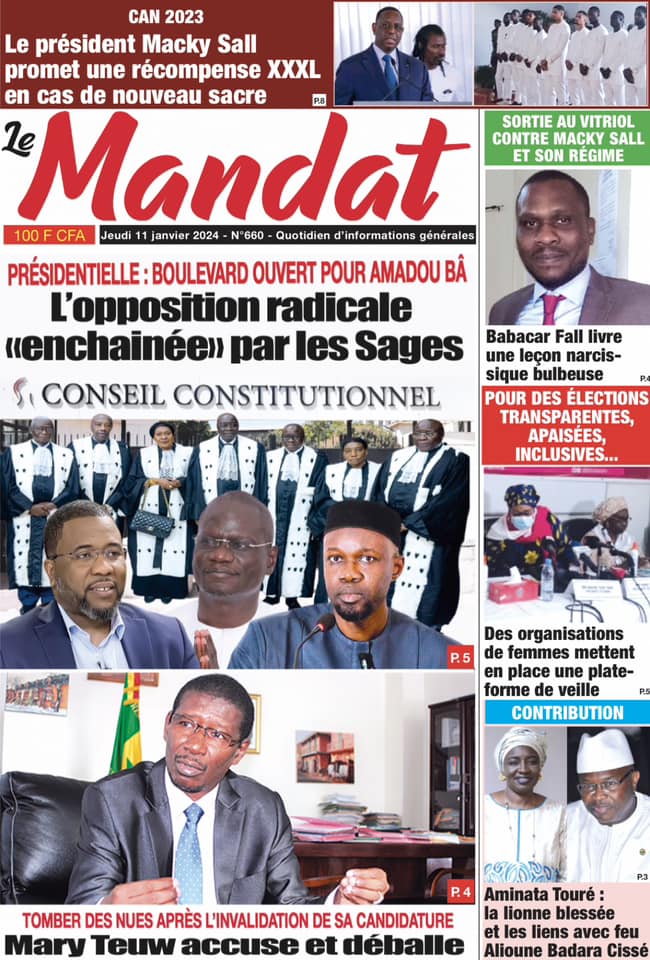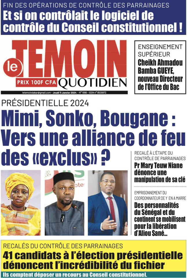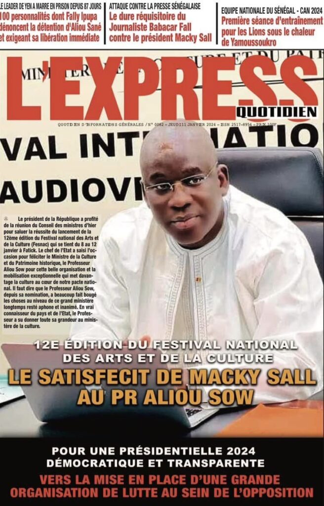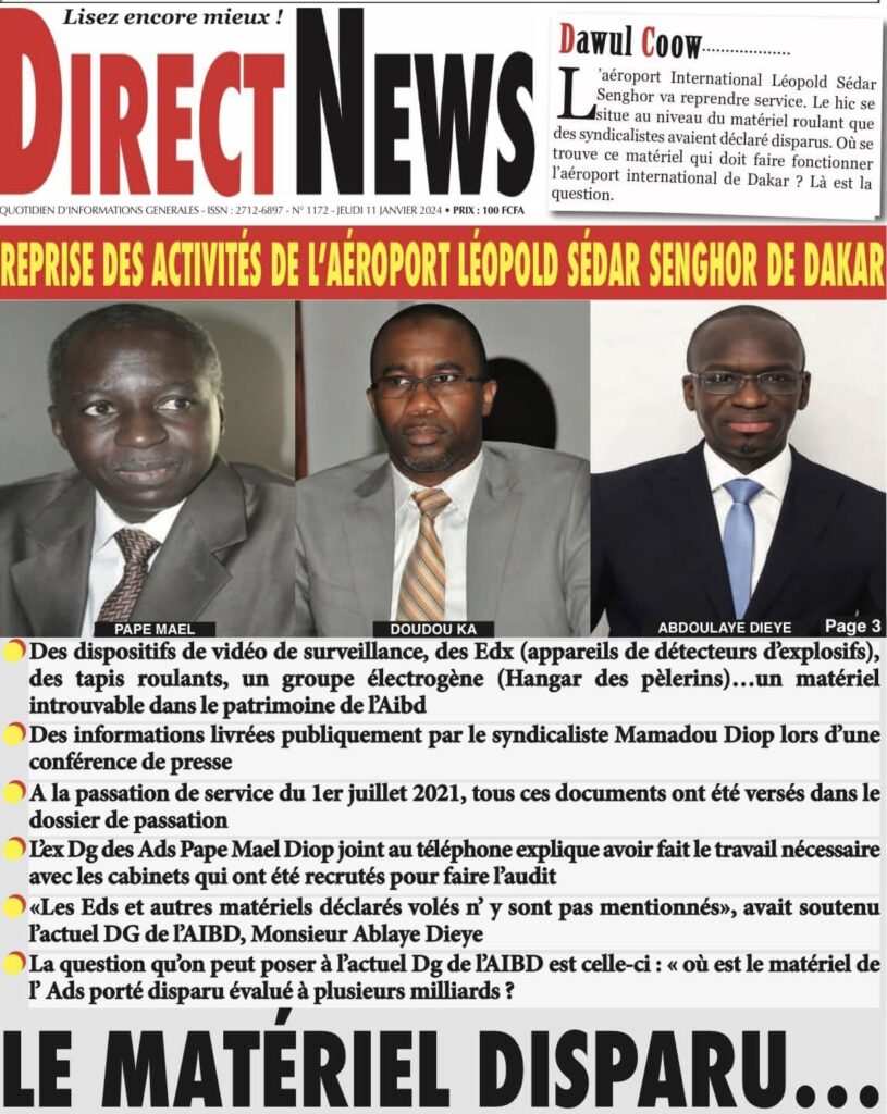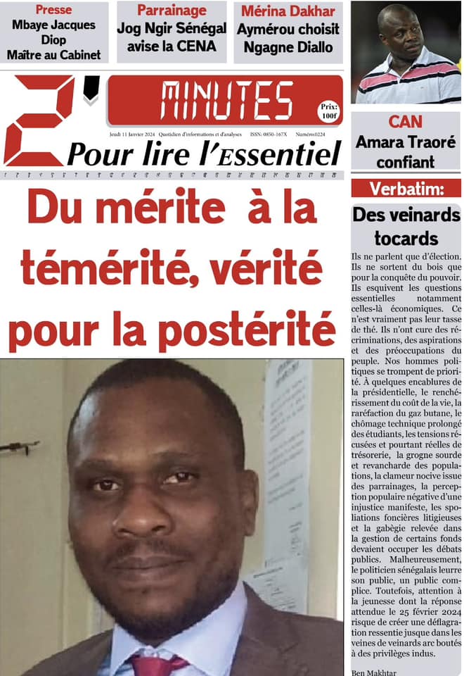 Accueil › Sénégal › Une des journaux du jeudi 11 janvier 2024 Une des journaux du jeudi 11 janvier 2024 Publié le 11 Jan 2024, à 04:59 par Abdou Faty GUEYE Une des journaux du jeudi 11 janvier 2024 Votre avis sera publié et visible par des milliers de lecteurs. Veuillez l’exprimer dans un langage respectueux. Commentaire Nom E-mail (ne sera pas visible) Enregistrer mon nom, mon e-mail et mon site web dans le navigateur pour mon prochain commentaire. Partager Partager Partager 0 Laisser un commentaire Annuler la réponseCommentaireNom E-mail (ne sera pas visible) Enregistrer mon nom, mon e-mail et mon site dans le navigateur pour mon prochain commentaire.