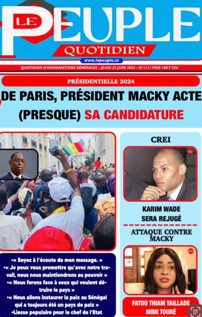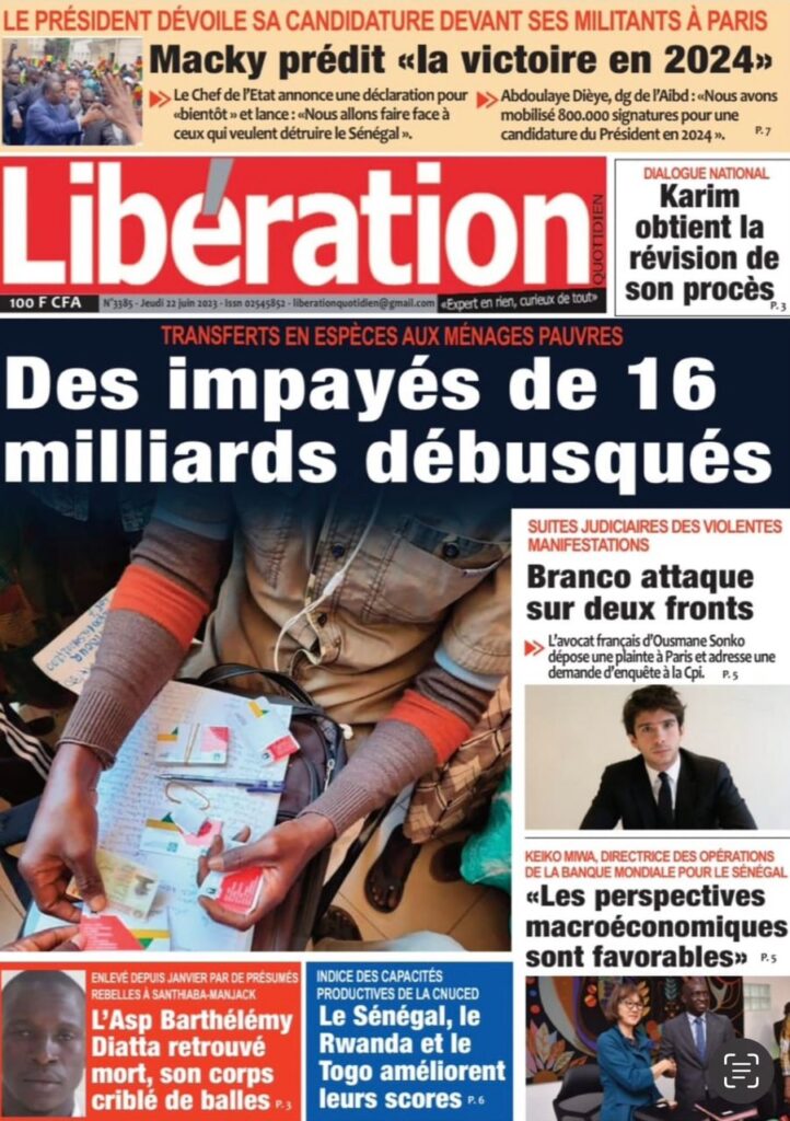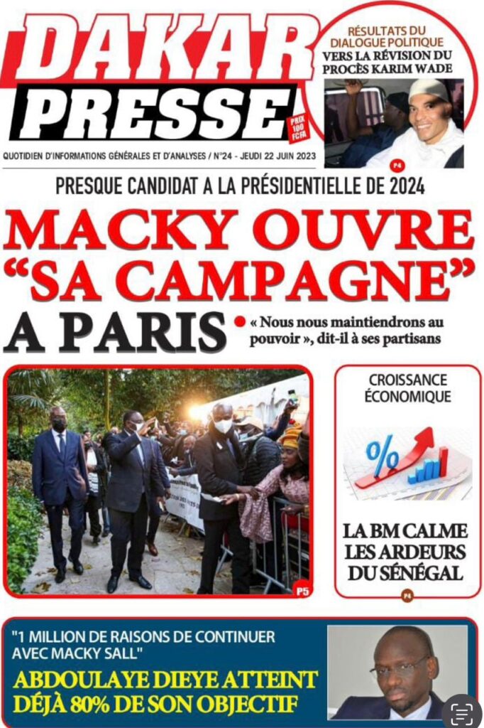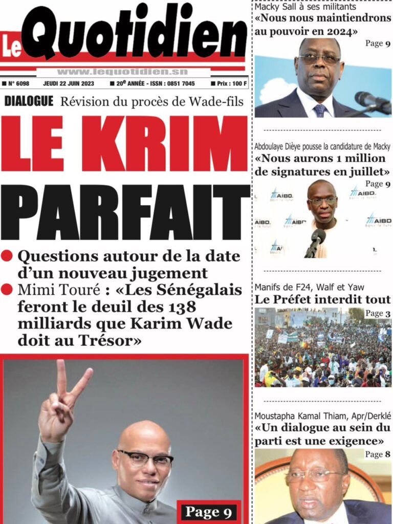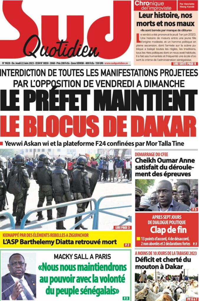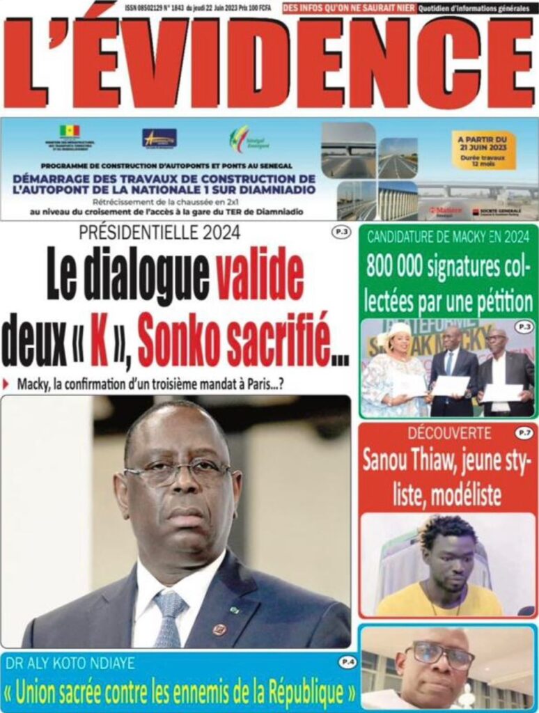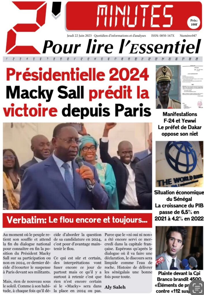 Accueil › Sénégal › Une des journaux du jeudi 22 juin 2023 Actualités Une des journaux du jeudi 22 juin 2023 Abdou Faty GUEYE 22 Juin 2023, 07:59 1 min Une des journaux du jeudi 22 juin 2023 jeudi 22 juin 2023 une des journaux Votre avis sera publié et visible par des milliers de lecteurs. Veuillez l’exprimer dans un langage respectueux. Commentaire Nom E-mail (ne sera pas visible) Enregistrer mon nom, mon e-mail et mon site web dans le navigateur pour mon prochain commentaire. Partager Partager Partager 0 Laisser un commentaire Annuler la réponseCommentaireNom E-mail (ne sera pas visible) Enregistrer mon nom, mon e-mail et mon site dans le navigateur pour mon prochain commentaire.