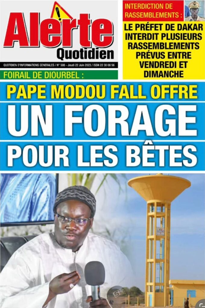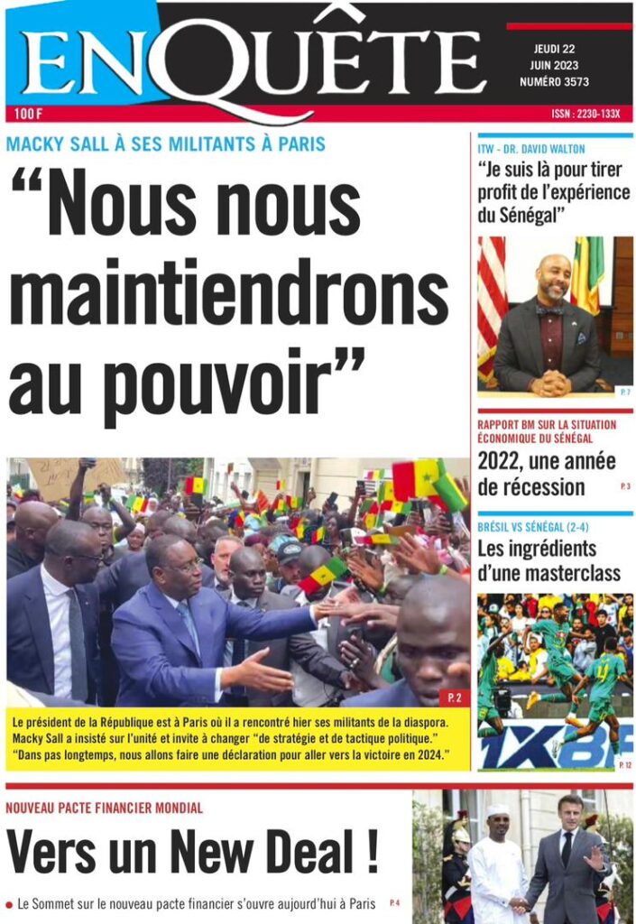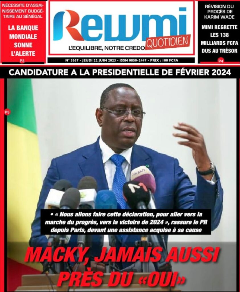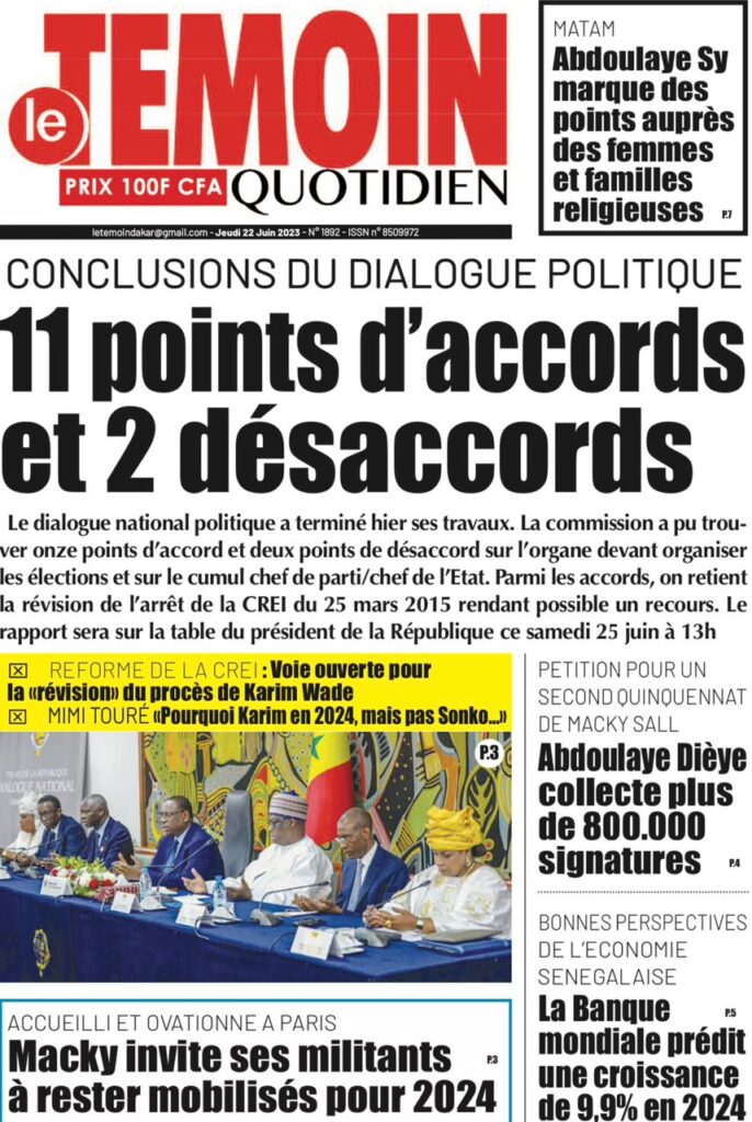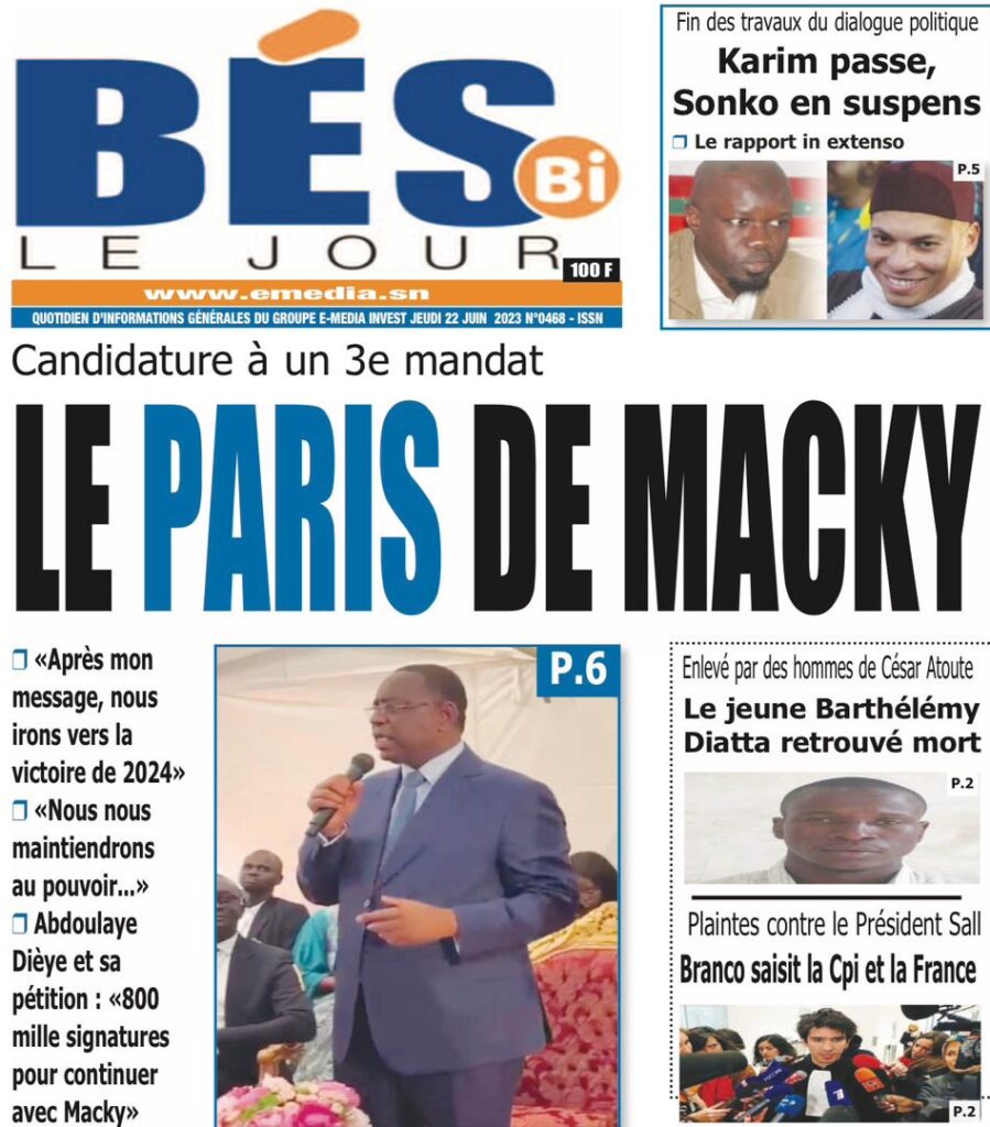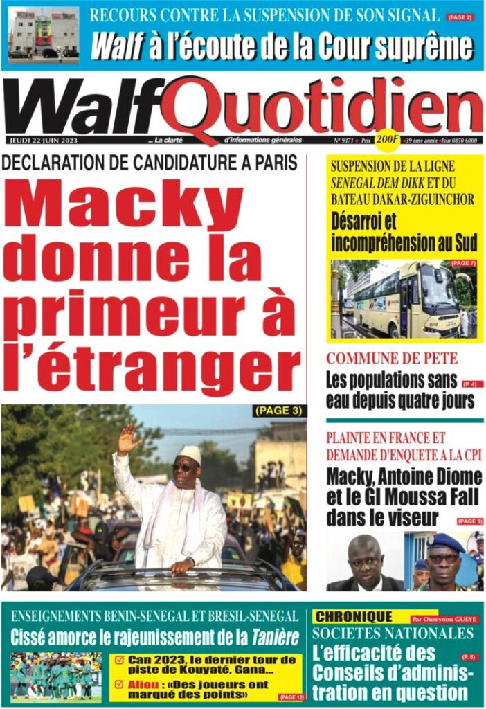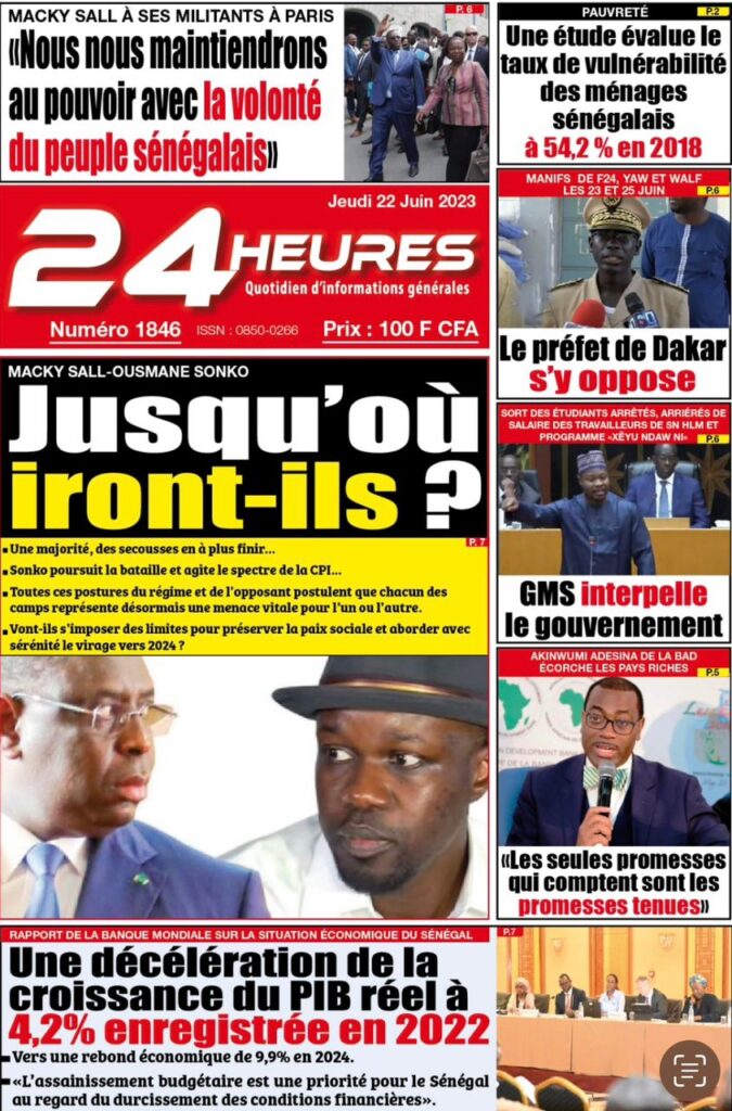 Accueil › Sénégal › Une des journaux du jeudi 22 juin 2023 Actualités Une des journaux du jeudi 22 juin 2023 Abdou Faty GUEYE 22 Juin 2023, 07:59 1 min Une des journaux du jeudi 22 juin 2023 jeudi 22 juin 2023 une des journaux Votre avis sera publié et visible par des milliers de lecteurs. Veuillez l’exprimer dans un langage respectueux. Commentaire Nom E-mail (ne sera pas visible) Enregistrer mon nom, mon e-mail et mon site web dans le navigateur pour mon prochain commentaire. Partager Partager Partager 0 Laisser un commentaire Annuler la réponseCommentaireNom E-mail (ne sera pas visible) Enregistrer mon nom, mon e-mail et mon site dans le navigateur pour mon prochain commentaire.