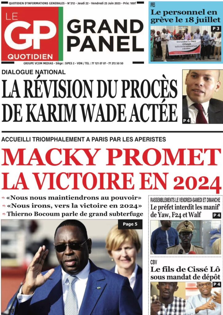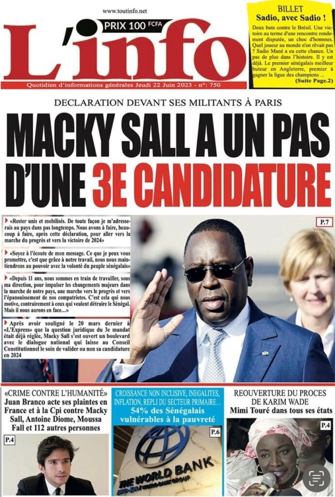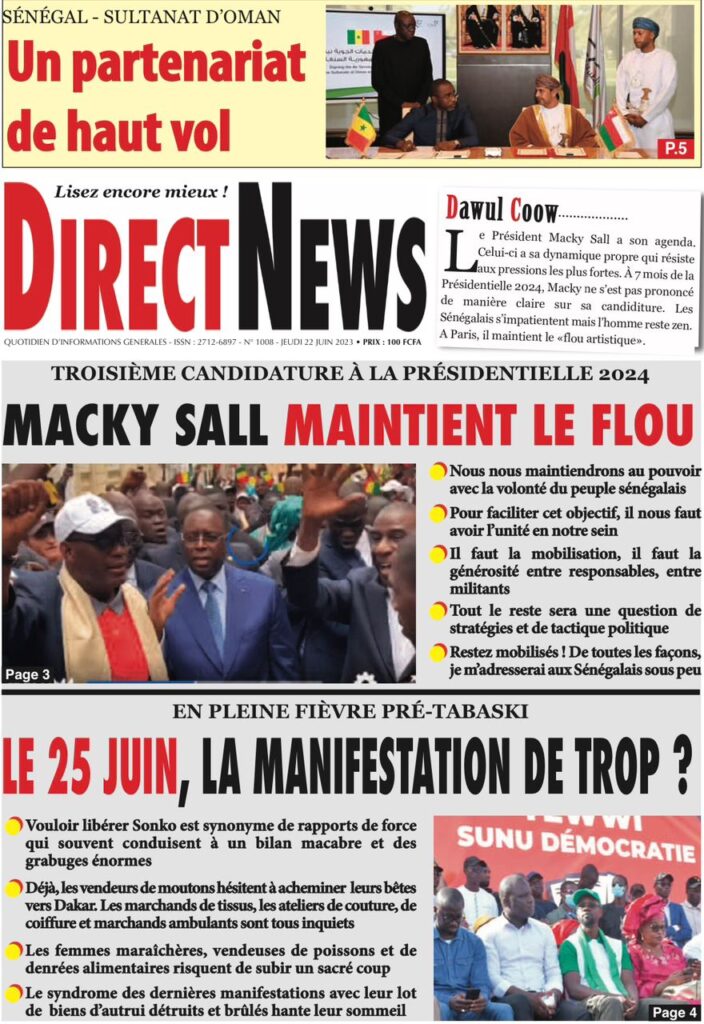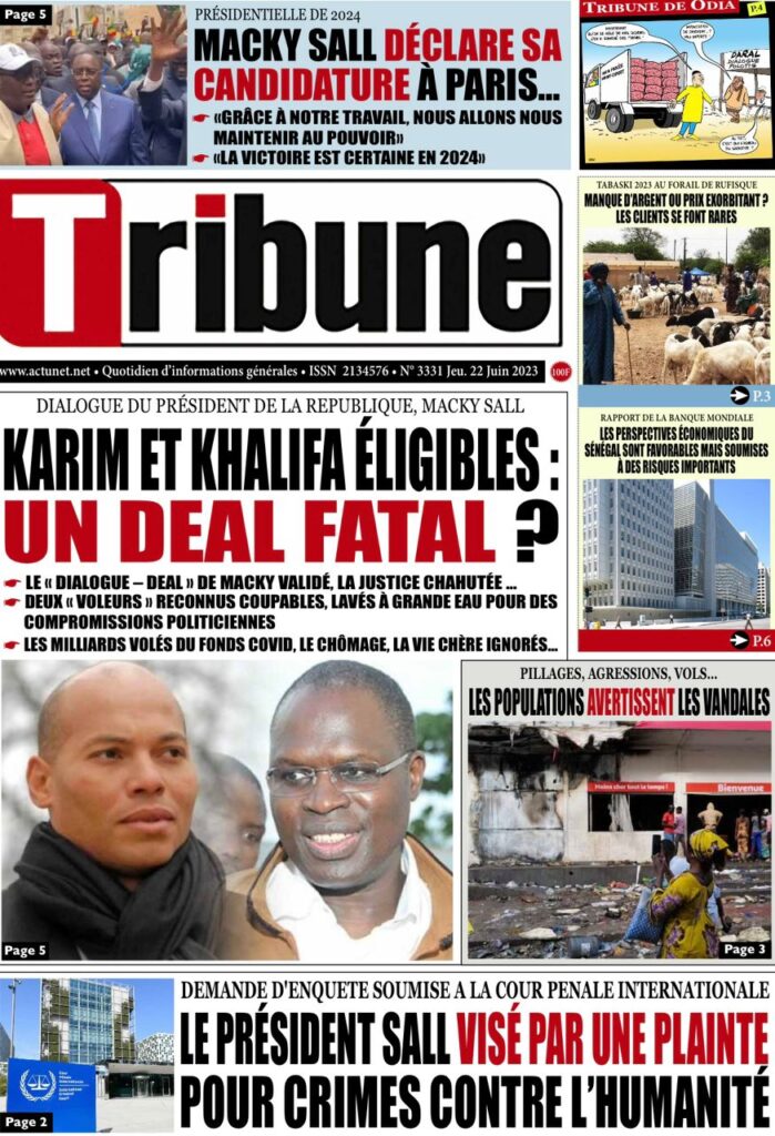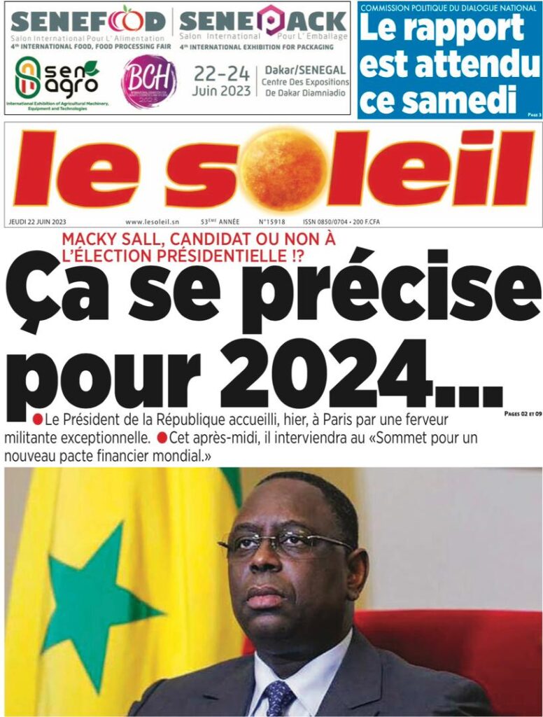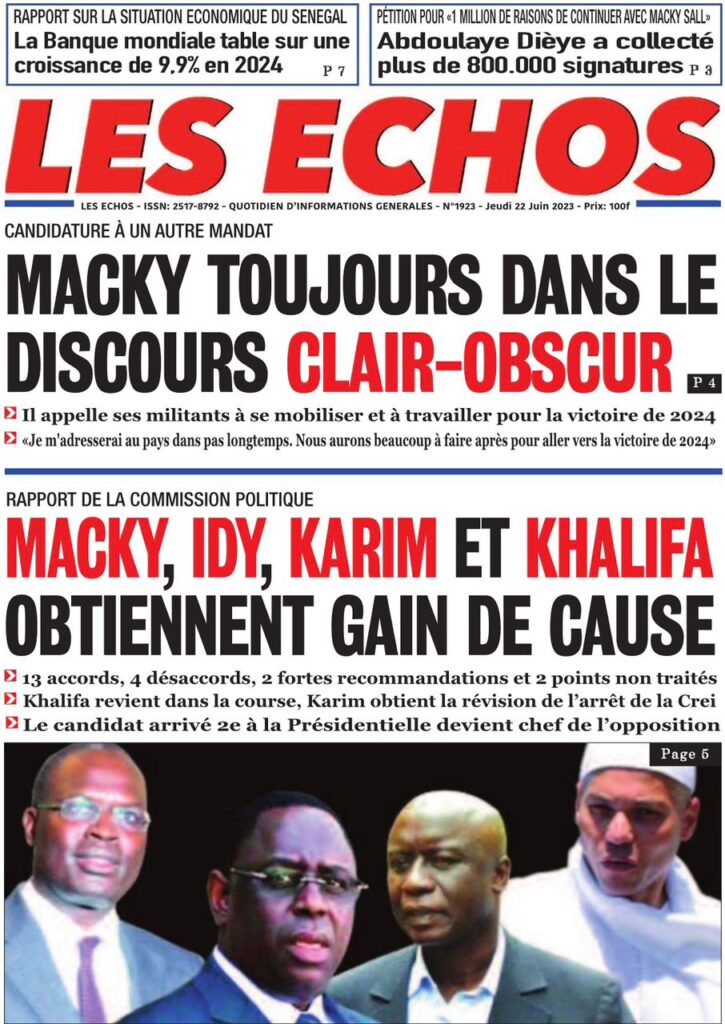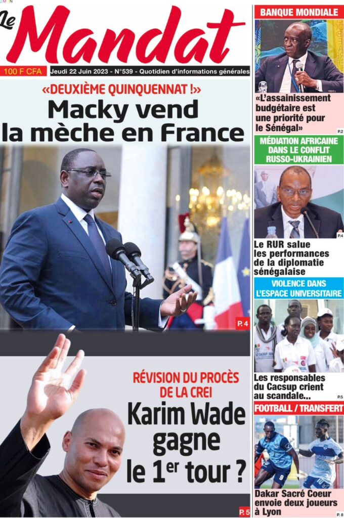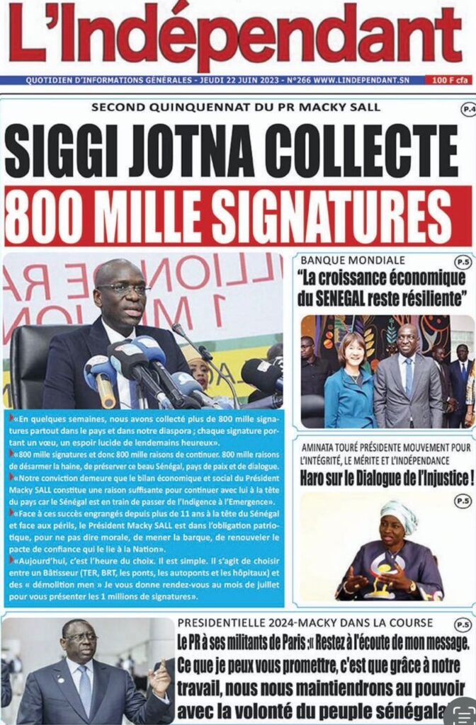 Accueil › Sénégal › Une des journaux du jeudi 22 juin 2023 Actualités Une des journaux du jeudi 22 juin 2023 Abdou Faty GUEYE 22 Juin 2023, 07:59 1 min Une des journaux du jeudi 22 juin 2023 jeudi 22 juin 2023 une des journaux Votre avis sera publié et visible par des milliers de lecteurs. Veuillez l’exprimer dans un langage respectueux. Commentaire Nom E-mail (ne sera pas visible) Enregistrer mon nom, mon e-mail et mon site web dans le navigateur pour mon prochain commentaire. Partager Partager Partager 0 Laisser un commentaire Annuler la réponseCommentaireNom E-mail (ne sera pas visible) Enregistrer mon nom, mon e-mail et mon site dans le navigateur pour mon prochain commentaire.