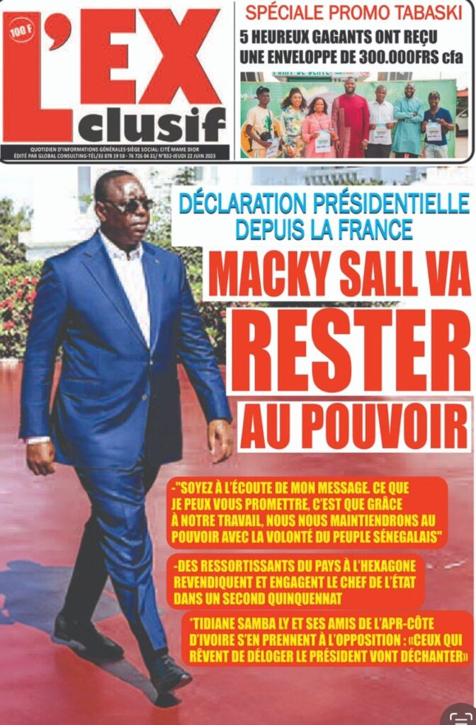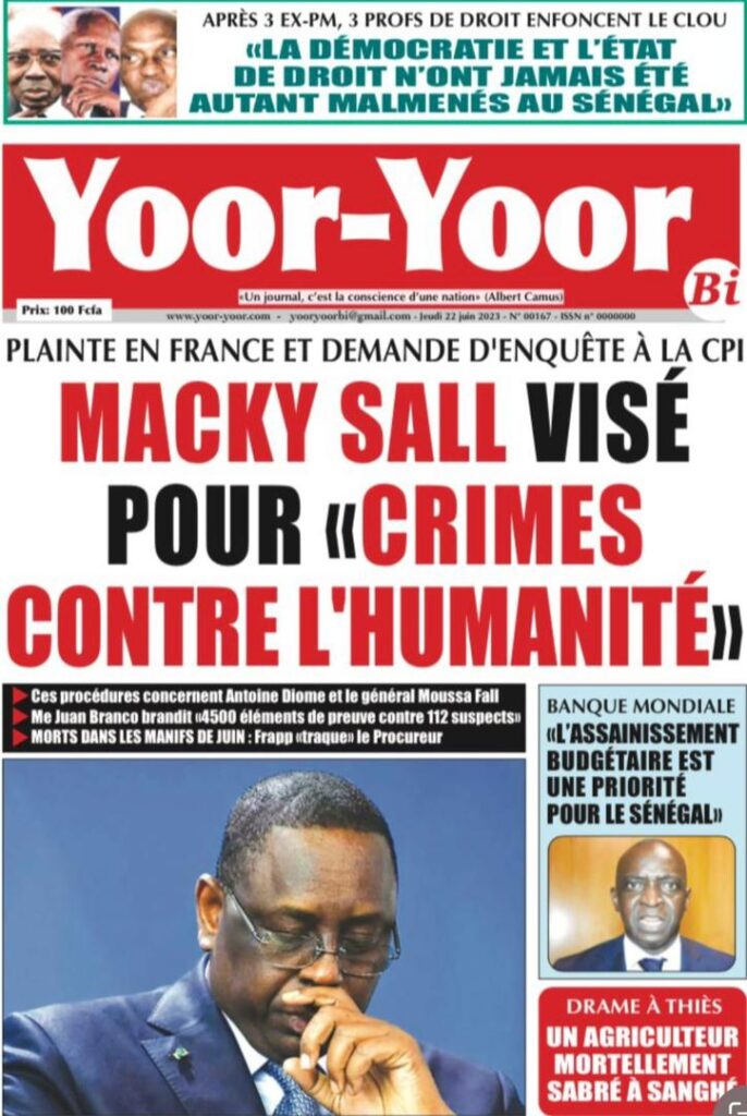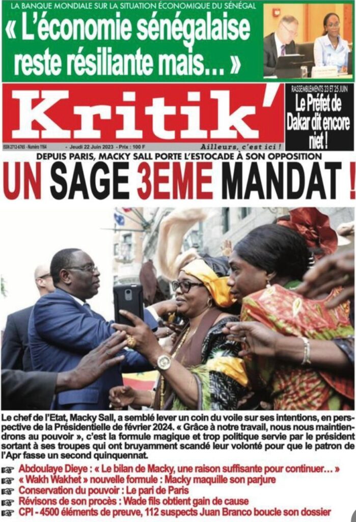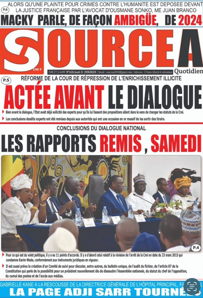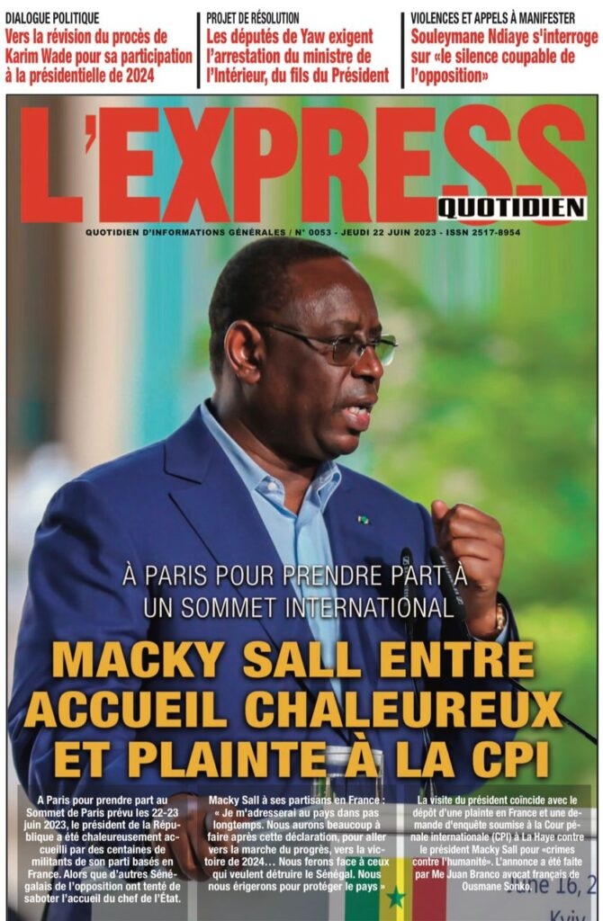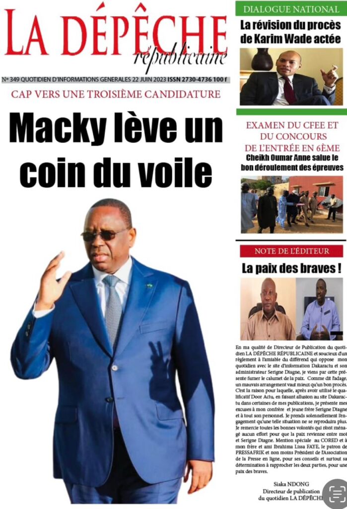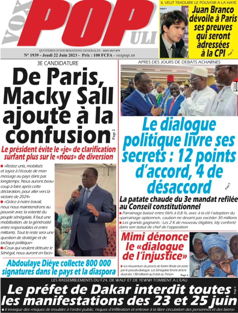 Accueil › Sénégal › Une des journaux du jeudi 22 juin 2023 Actualités Une des journaux du jeudi 22 juin 2023 Abdou Faty GUEYE 22 Juin 2023, 07:59 1 min Une des journaux du jeudi 22 juin 2023 jeudi 22 juin 2023 une des journaux Votre avis sera publié et visible par des milliers de lecteurs. Veuillez l’exprimer dans un langage respectueux. Commentaire Nom E-mail (ne sera pas visible) Enregistrer mon nom, mon e-mail et mon site web dans le navigateur pour mon prochain commentaire. Partager Partager Partager 0 Laisser un commentaire Annuler la réponseCommentaireNom E-mail (ne sera pas visible) Enregistrer mon nom, mon e-mail et mon site dans le navigateur pour mon prochain commentaire.