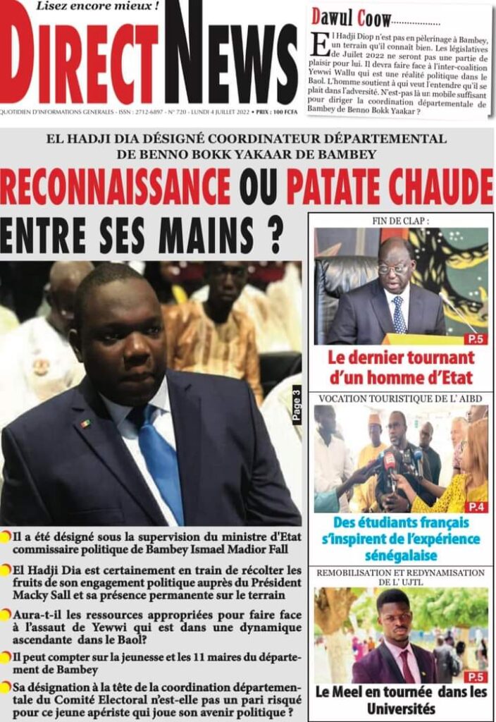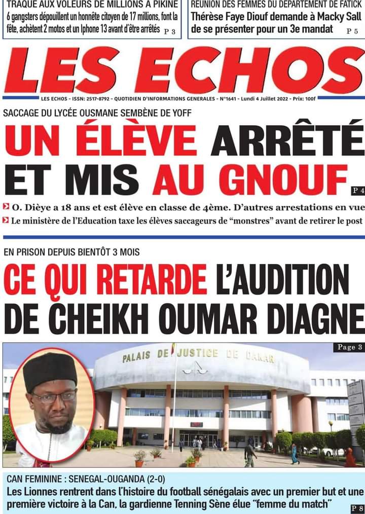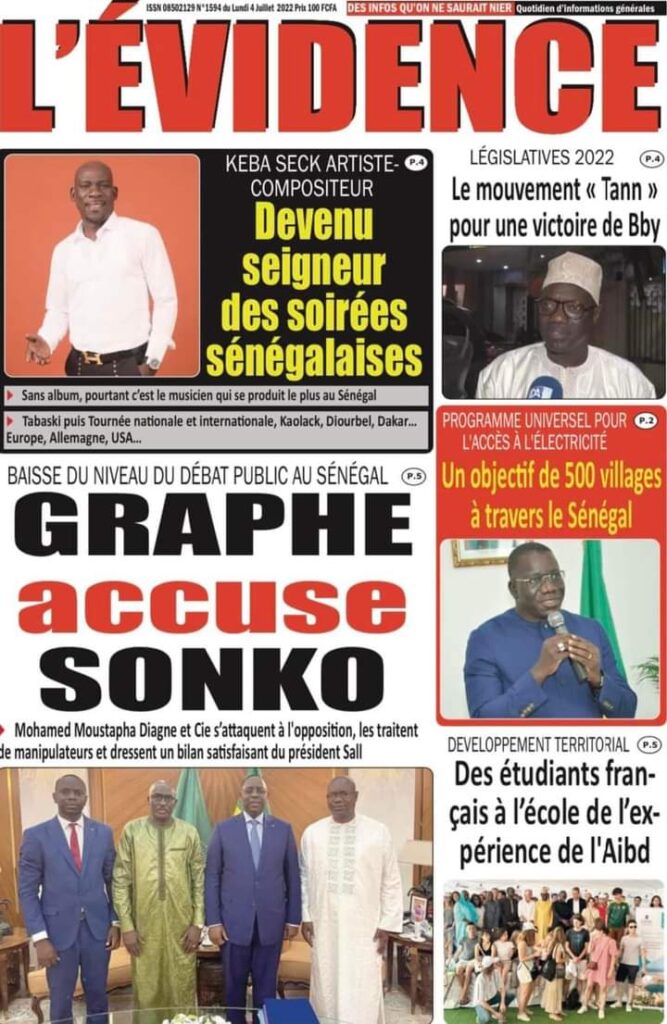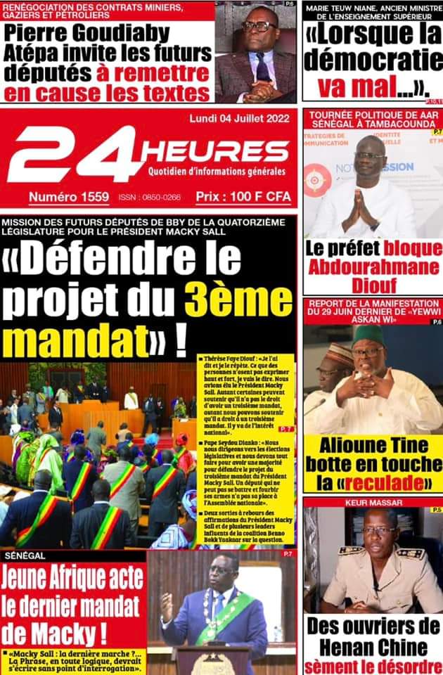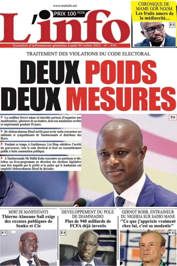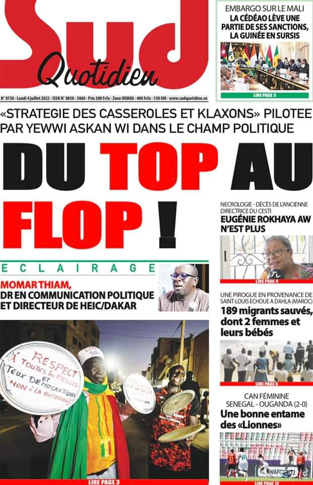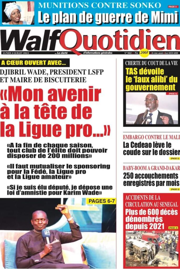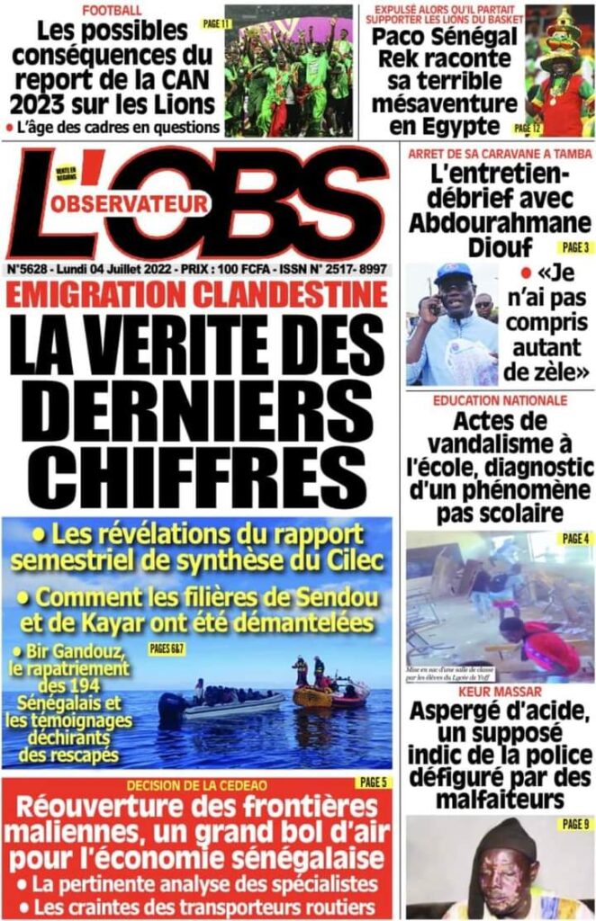 Accueil › Actualités › Revue de presse › Une des journaux du lundi 04 juillet 2022 Actualités Une des journaux du lundi 04 juillet 2022 Abdou Faty GUEYE 4 Juil 2022, 06:46 1 min Une des journaux du lundi 04 juillet 2022 Une des journaux du lundi 04 juillet 2022 Votre avis sera publié et visible par des milliers de lecteurs. Veuillez l’exprimer dans un langage respectueux. Commentaire Nom E-mail (ne sera pas visible) Enregistrer mon nom, mon e-mail et mon site web dans le navigateur pour mon prochain commentaire. Partager Partager Partager 0 Laisser un commentaire Annuler la réponseCommentaireNom E-mail (ne sera pas visible) Enregistrer mon nom, mon e-mail et mon site dans le navigateur pour mon prochain commentaire.