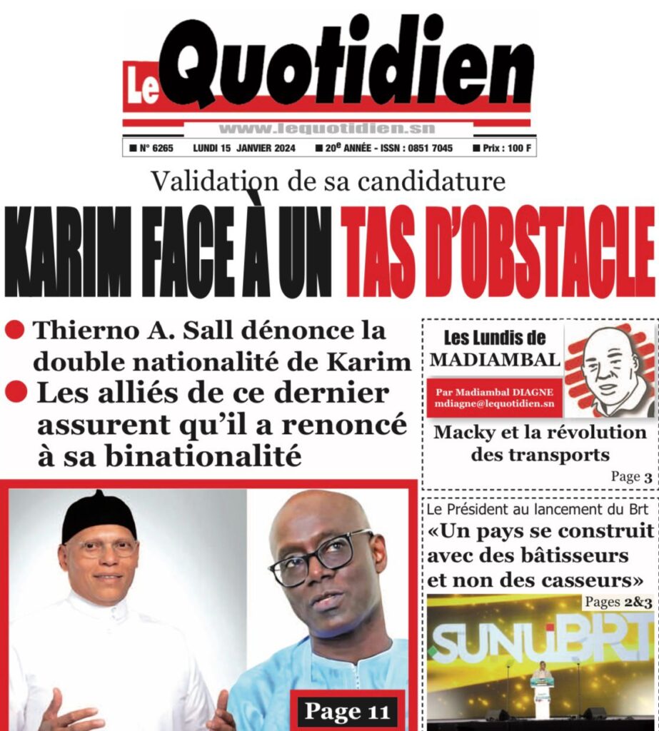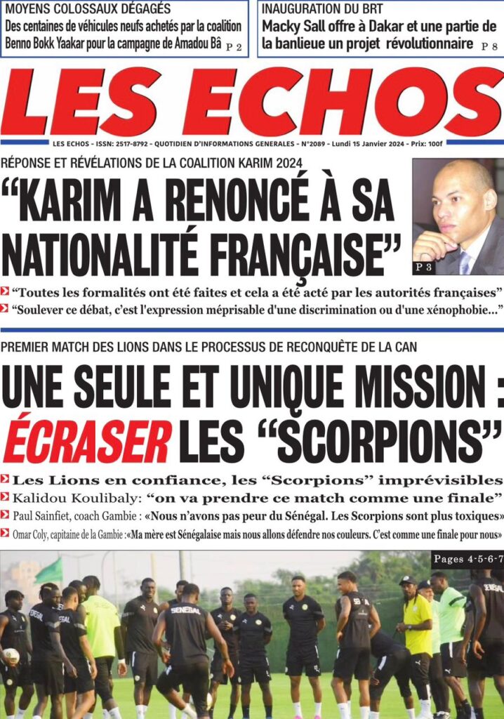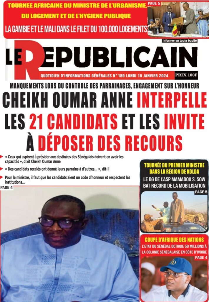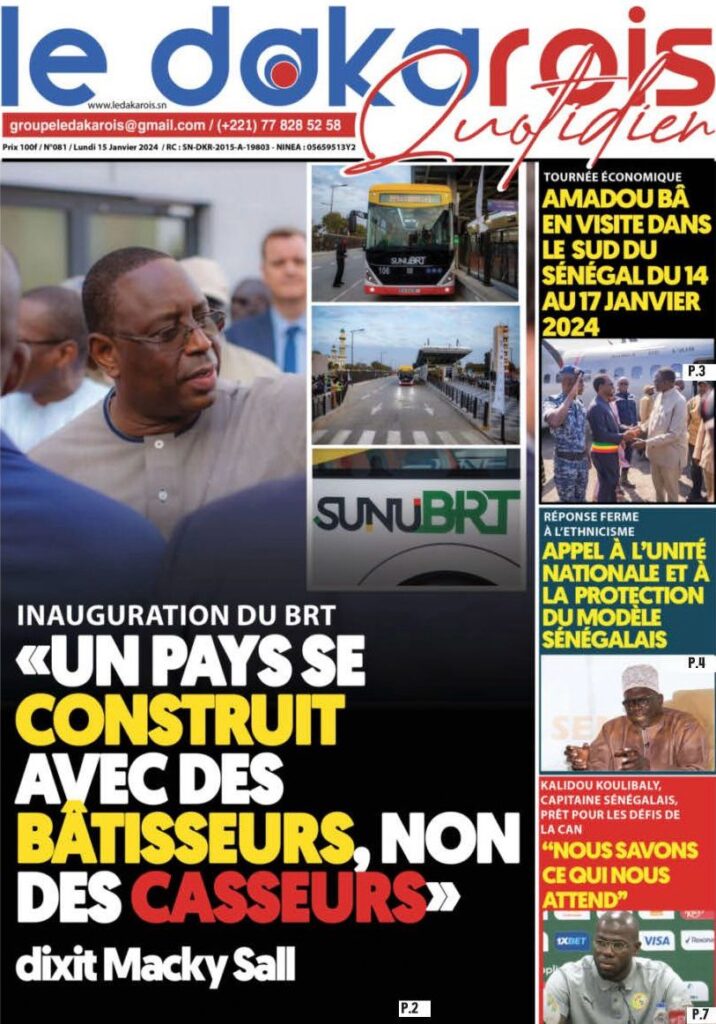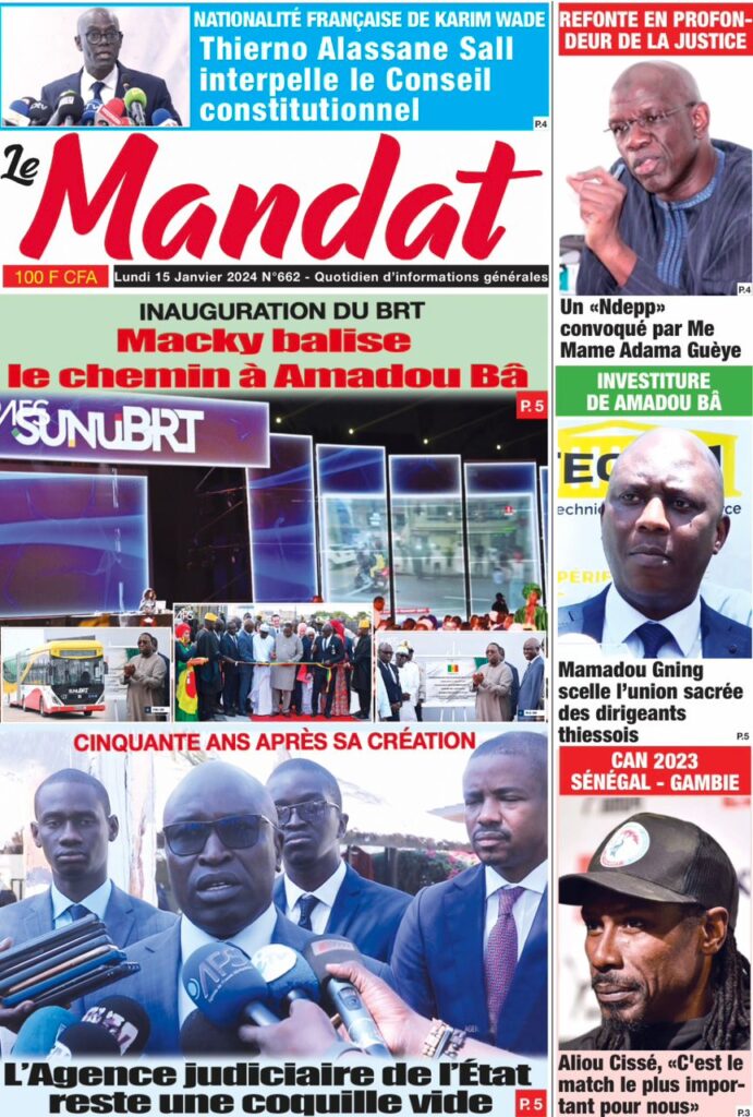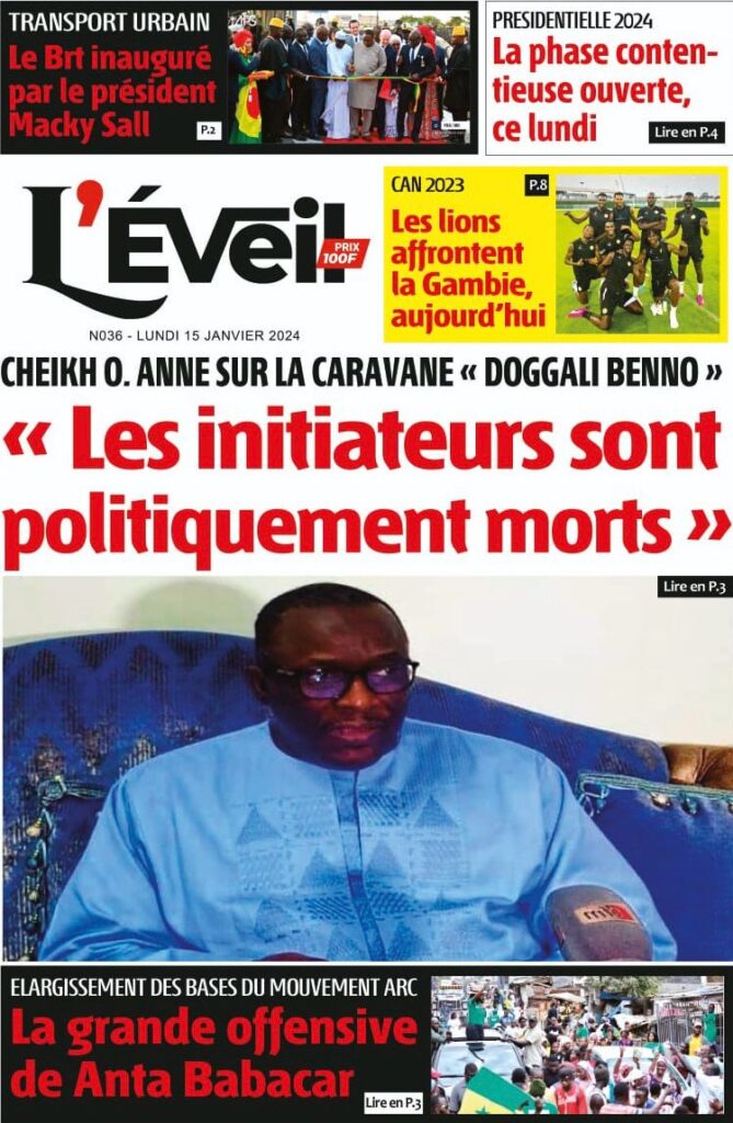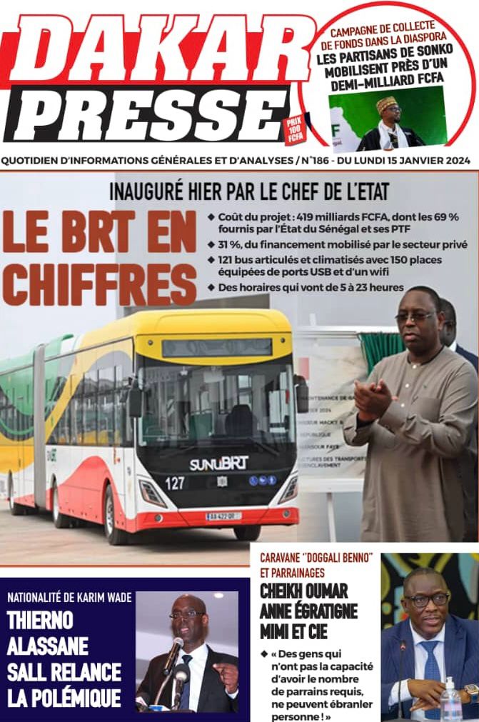 Accueil › Sénégal › Une des journaux du lundi 15 janvier 2024 Une des journaux du lundi 15 janvier 2024 Publié le 15 Jan 2024, à 07:16 par Abdou Faty GUEYE Une des journaux du lundi 15 janvier 2024 Votre avis sera publié et visible par des milliers de lecteurs. Veuillez l’exprimer dans un langage respectueux. Commentaire Nom E-mail (ne sera pas visible) Enregistrer mon nom, mon e-mail et mon site web dans le navigateur pour mon prochain commentaire. Partager Partager Partager 0 Laisser un commentaire Annuler la réponseCommentaireNom E-mail (ne sera pas visible) Enregistrer mon nom, mon e-mail et mon site dans le navigateur pour mon prochain commentaire.
