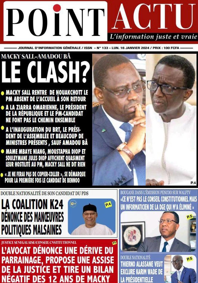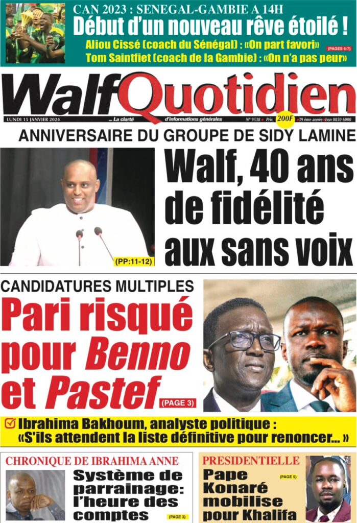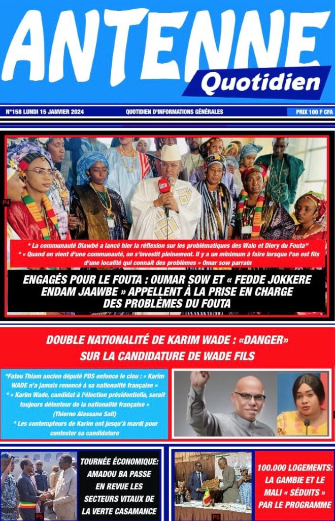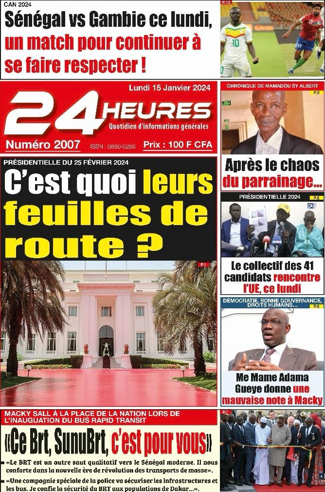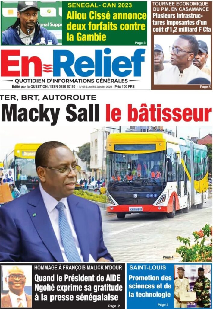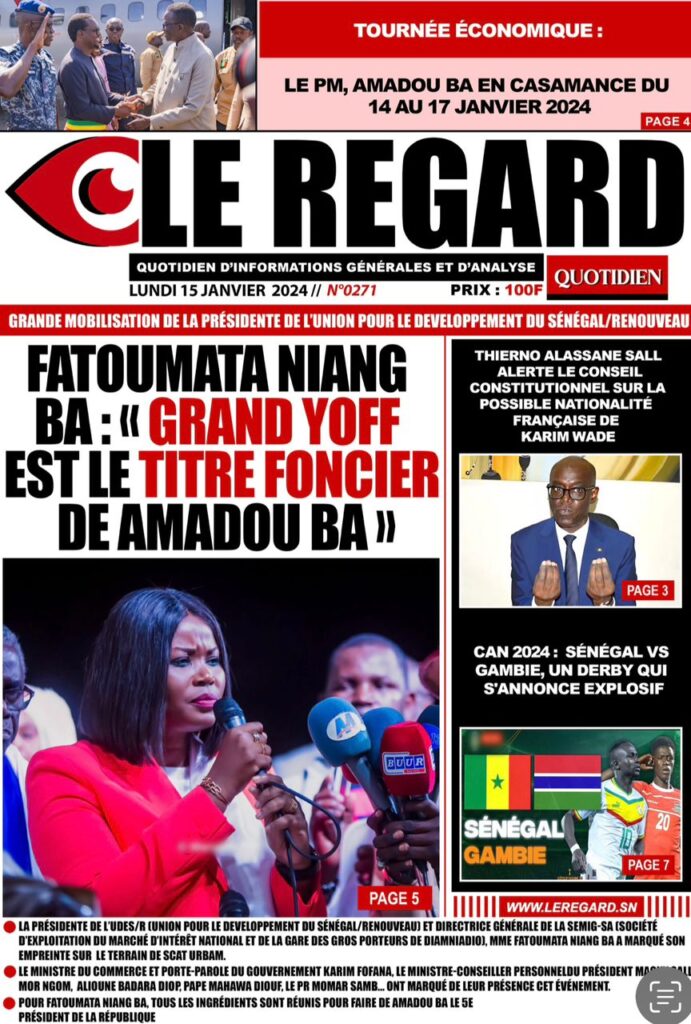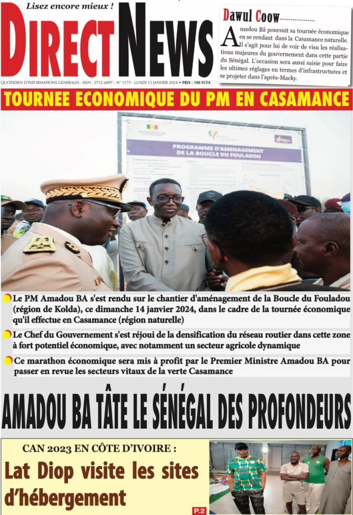 Accueil › Sénégal › Une des journaux du lundi 15 janvier 2024 Une des journaux du lundi 15 janvier 2024 Publié le 15 Jan 2024, à 07:16 par Abdou Faty GUEYE Une des journaux du lundi 15 janvier 2024 Votre avis sera publié et visible par des milliers de lecteurs. Veuillez l’exprimer dans un langage respectueux. Commentaire Nom E-mail (ne sera pas visible) Enregistrer mon nom, mon e-mail et mon site web dans le navigateur pour mon prochain commentaire. Partager Partager Partager 0 Laisser un commentaire Annuler la réponseCommentaireNom E-mail (ne sera pas visible) Enregistrer mon nom, mon e-mail et mon site dans le navigateur pour mon prochain commentaire.