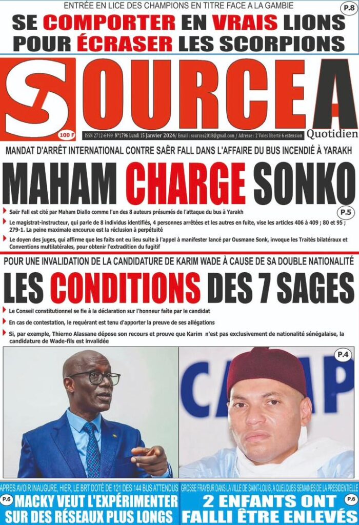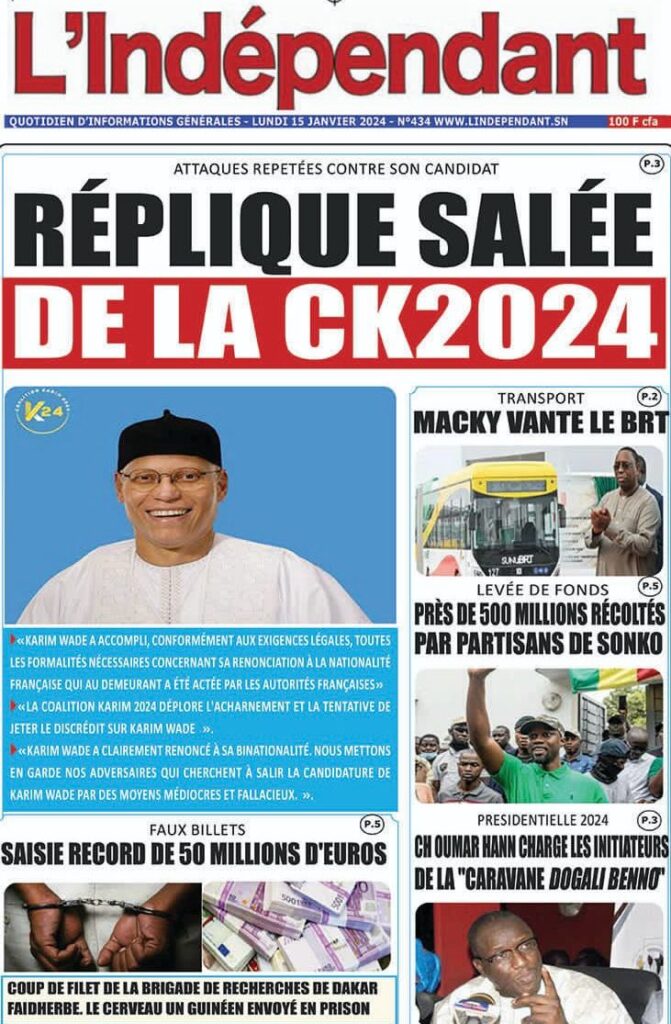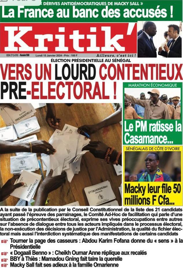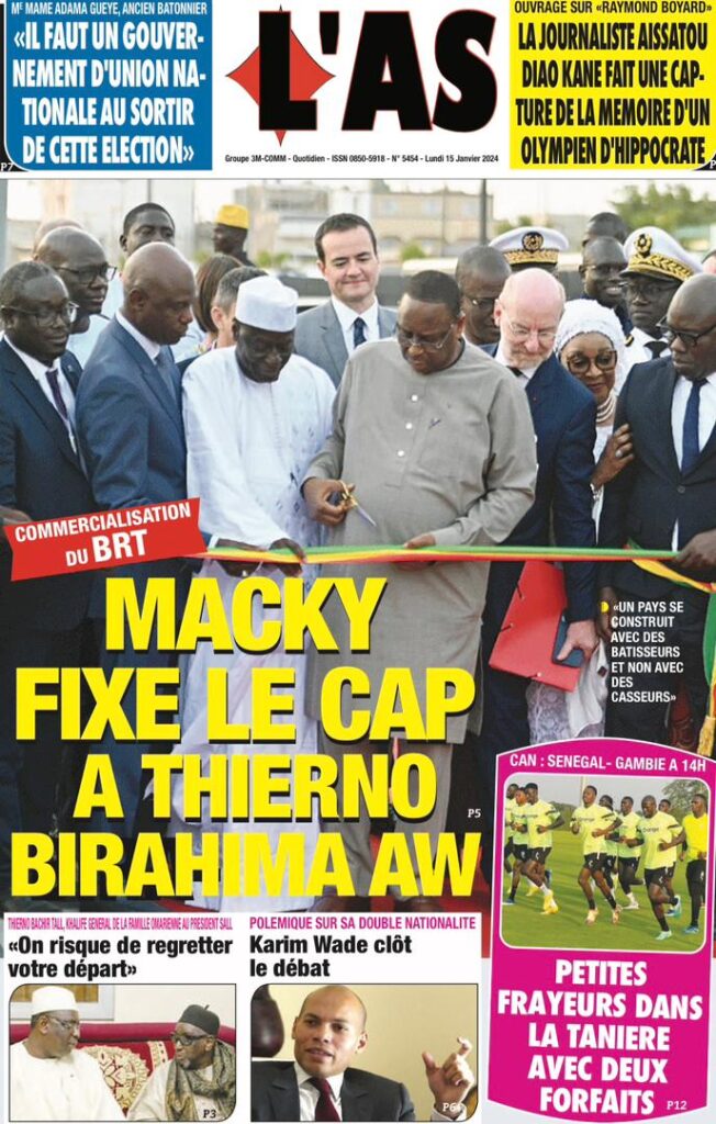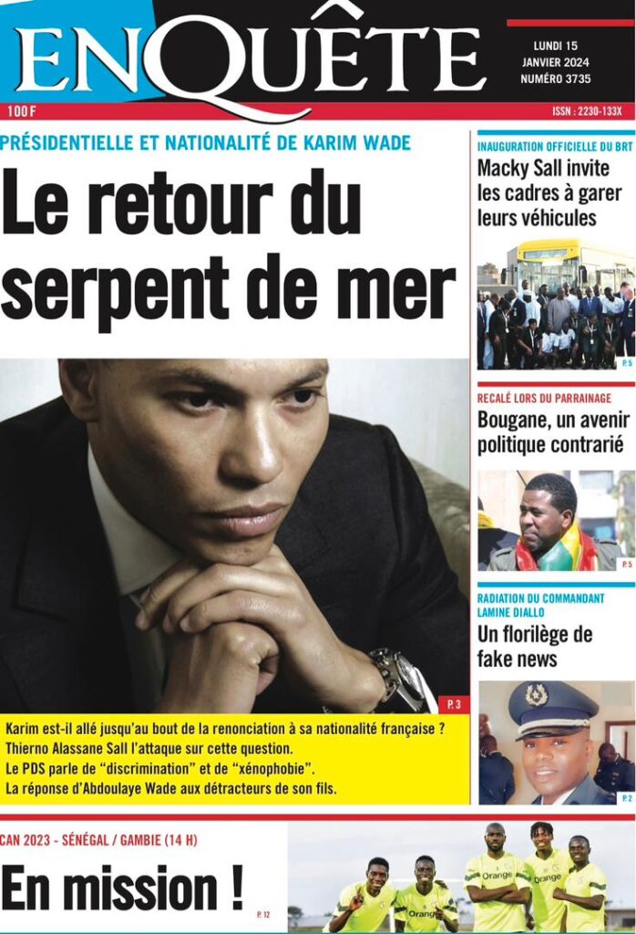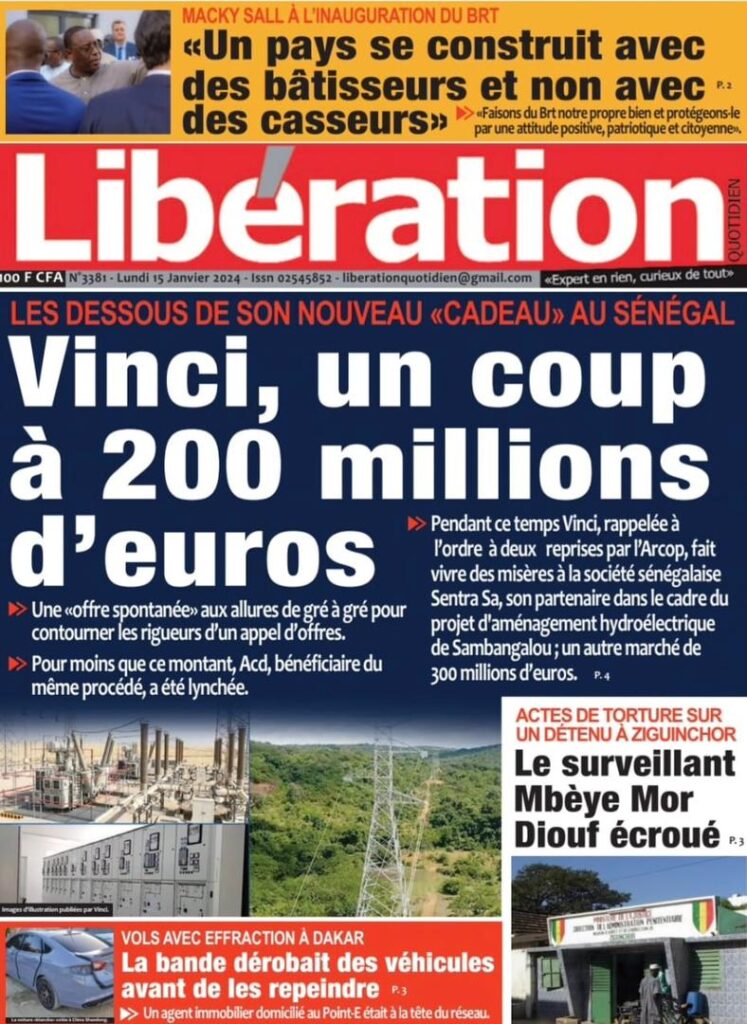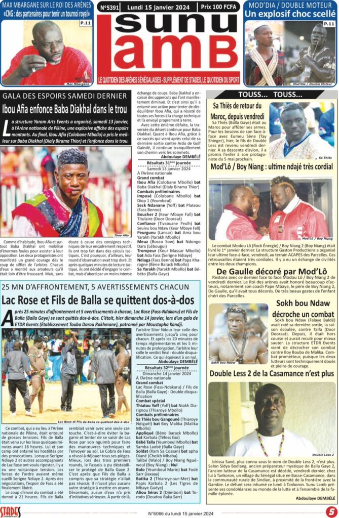Accueil › Sénégal › Une des journaux du lundi 15 janvier 2024 Une des journaux du lundi 15 janvier 2024 Publié le 15 Jan 2024, à 07:16 par Abdou Faty GUEYE Une des journaux du lundi 15 janvier 2024 Votre avis sera publié et visible par des milliers de lecteurs. Veuillez l’exprimer dans un langage respectueux. Commentaire Nom E-mail (ne sera pas visible) Enregistrer mon nom, mon e-mail et mon site web dans le navigateur pour mon prochain commentaire. Partager Partager Partager 0 Laisser un commentaire Annuler la réponseCommentaireNom E-mail (ne sera pas visible) Enregistrer mon nom, mon e-mail et mon site dans le navigateur pour mon prochain commentaire.