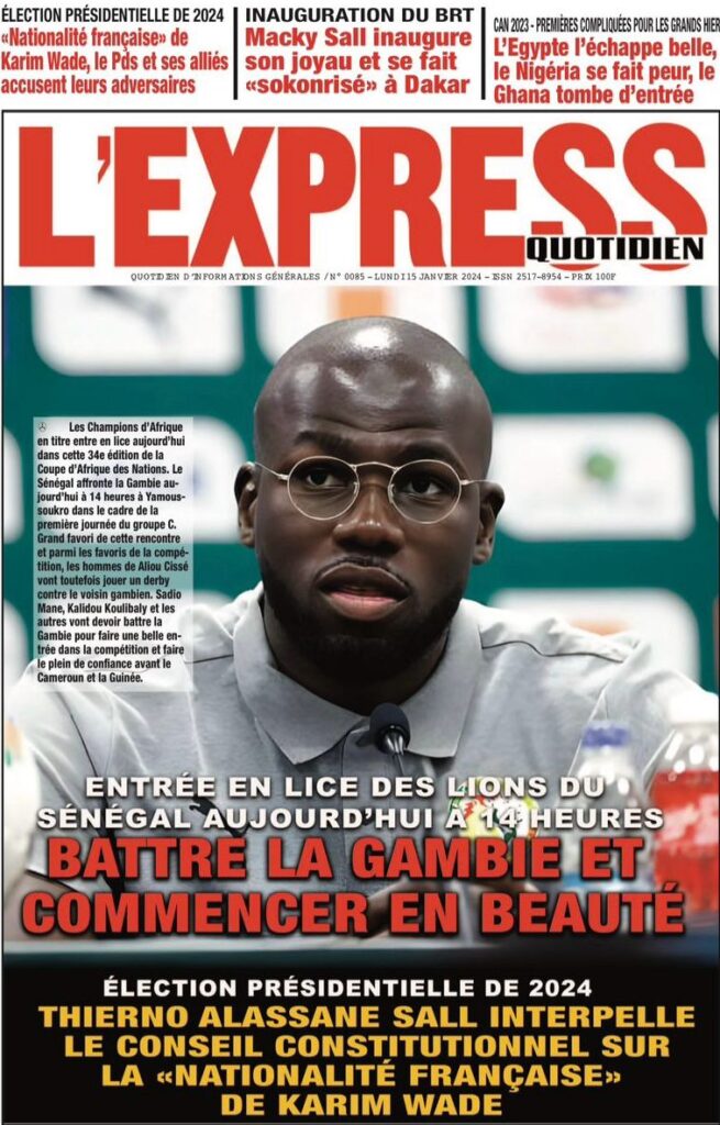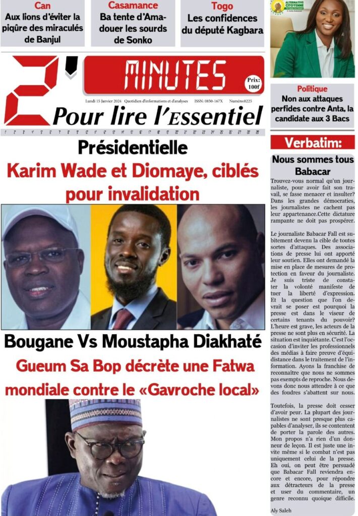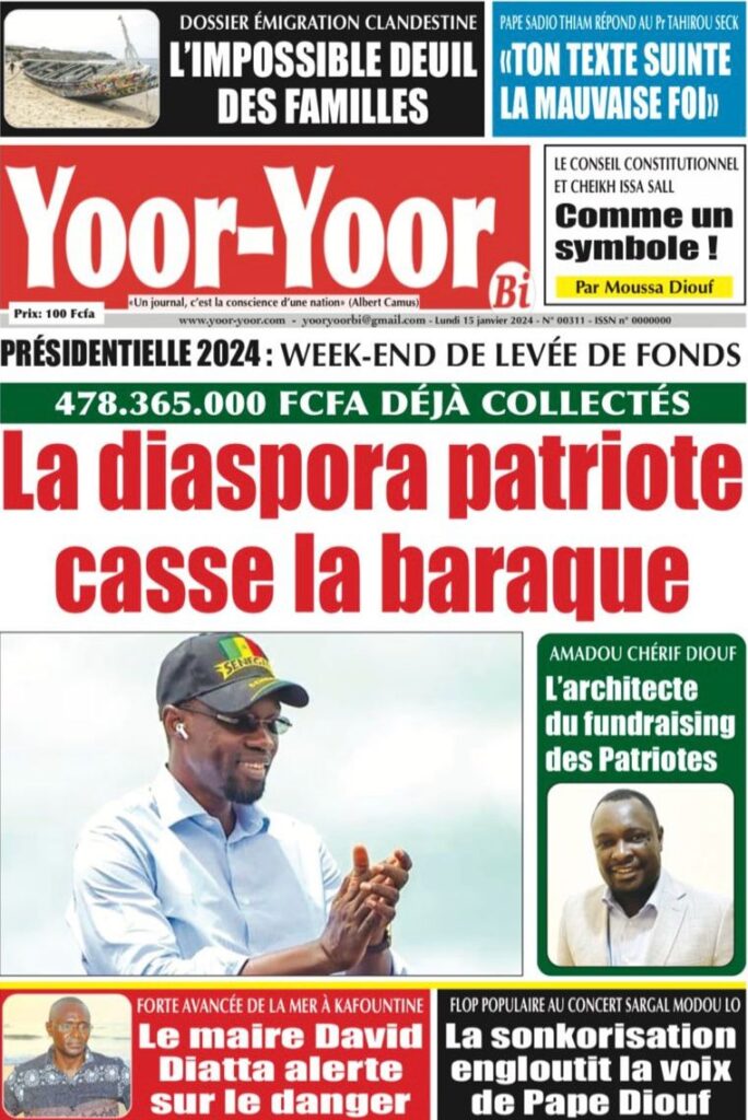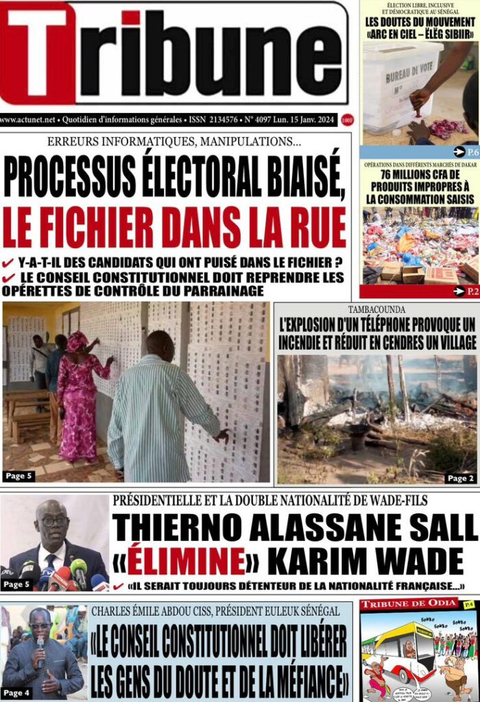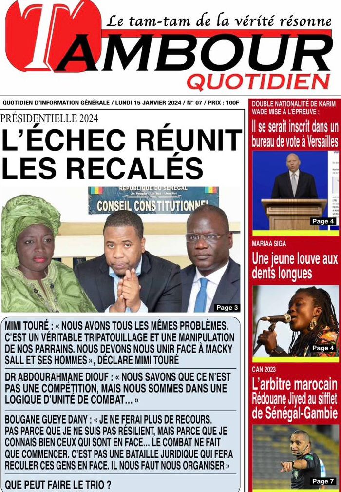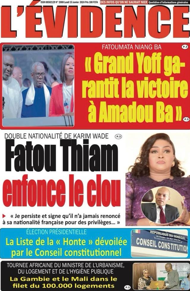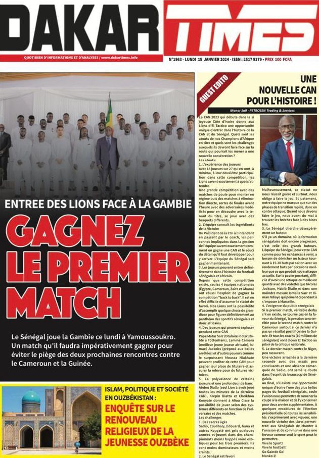 Accueil › Sénégal › Une des journaux du lundi 15 janvier 2024 Une des journaux du lundi 15 janvier 2024 Publié le 15 Jan 2024, à 07:16 par Abdou Faty GUEYE Une des journaux du lundi 15 janvier 2024 Votre avis sera publié et visible par des milliers de lecteurs. Veuillez l’exprimer dans un langage respectueux. Commentaire Nom E-mail (ne sera pas visible) Enregistrer mon nom, mon e-mail et mon site web dans le navigateur pour mon prochain commentaire. Partager Partager Partager 0 Laisser un commentaire Annuler la réponseCommentaireNom E-mail (ne sera pas visible) Enregistrer mon nom, mon e-mail et mon site dans le navigateur pour mon prochain commentaire.