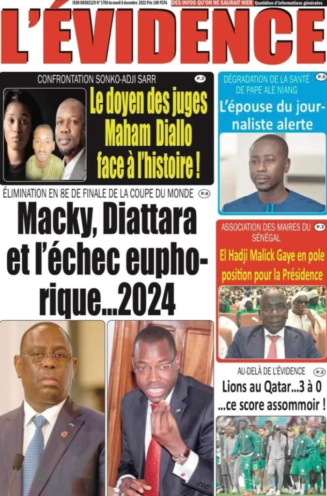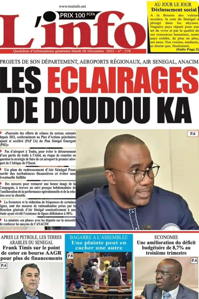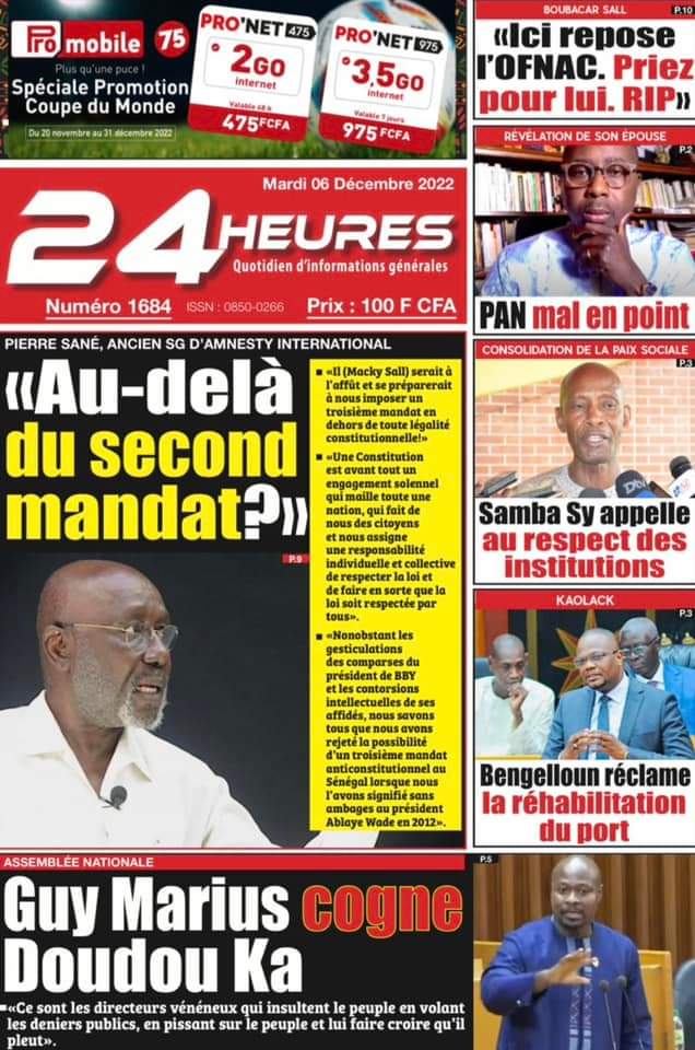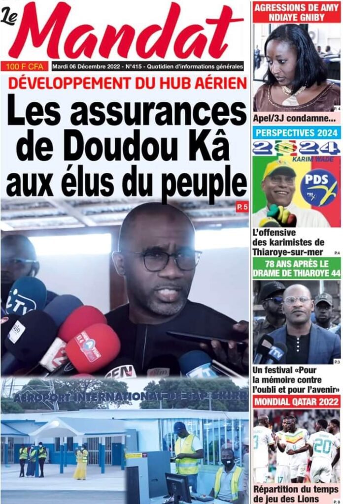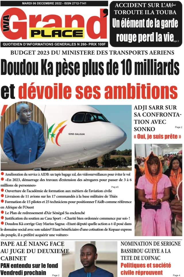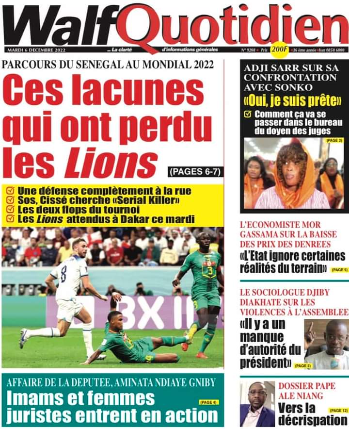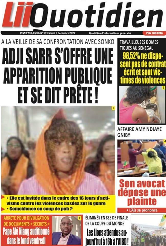 Accueil › Sénégal › Une des journaux du mardi 06 décembre 2022 Une des journaux du mardi 06 décembre 2022 Publié le 6 Déc 2022, à 05:08 par Abdou Faty GUEYE Une des journaux du mardi 06 décembre 2022 Votre avis sera publié et visible par des milliers de lecteurs. Veuillez l’exprimer dans un langage respectueux. Commentaire Nom E-mail (ne sera pas visible) Enregistrer mon nom, mon e-mail et mon site web dans le navigateur pour mon prochain commentaire. Partager Partager Partager 0 Laisser un commentaire Annuler la réponseCommentaireNom E-mail (ne sera pas visible) Enregistrer mon nom, mon e-mail et mon site dans le navigateur pour mon prochain commentaire.