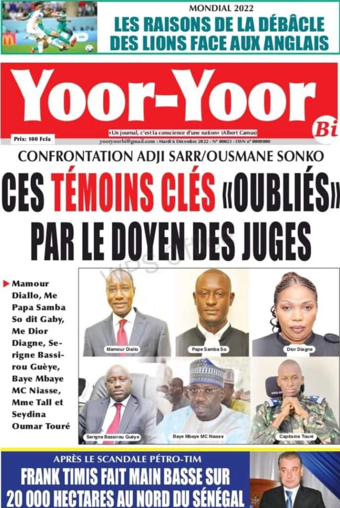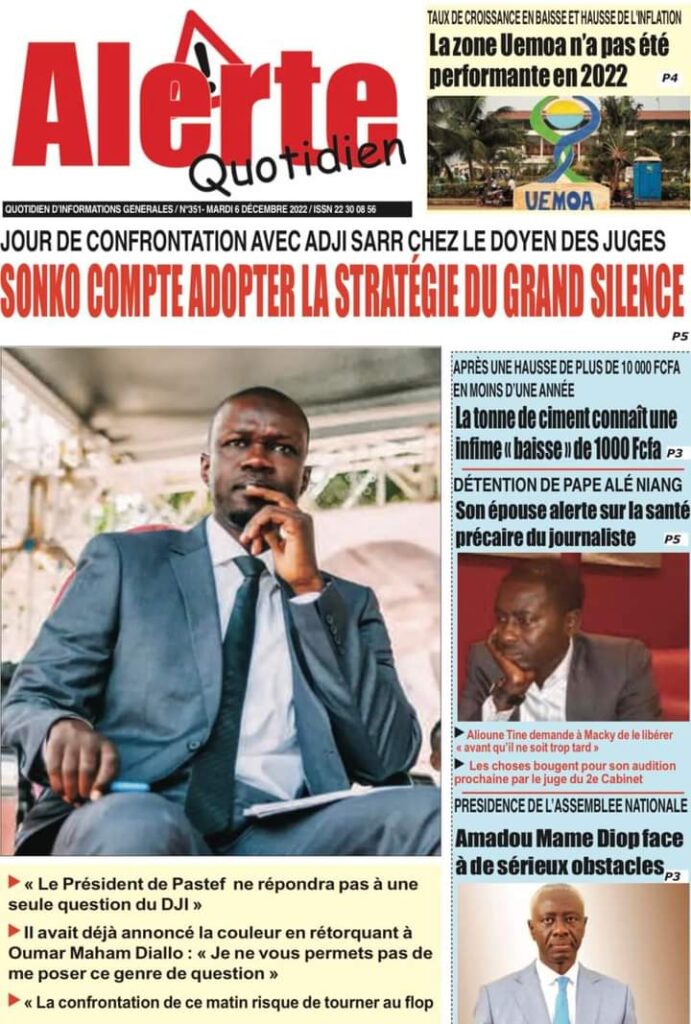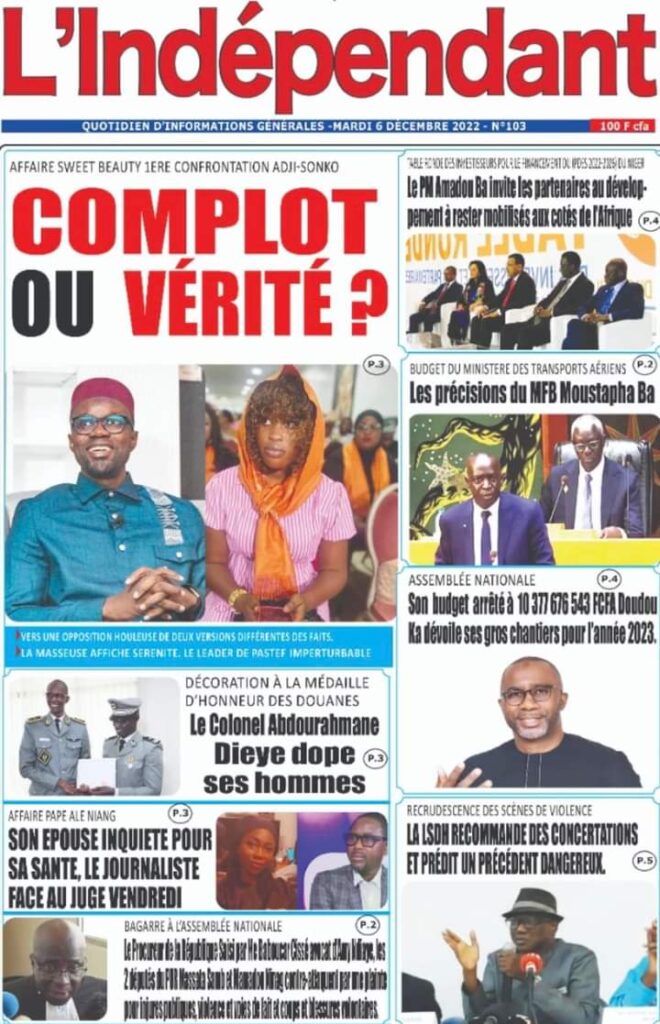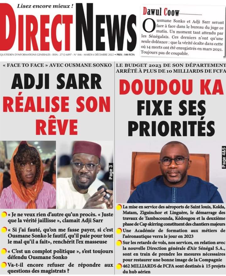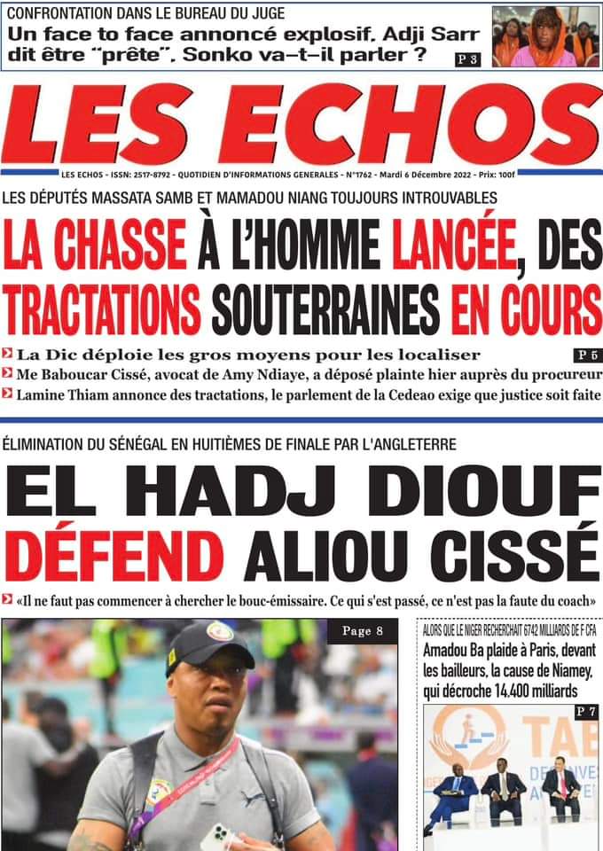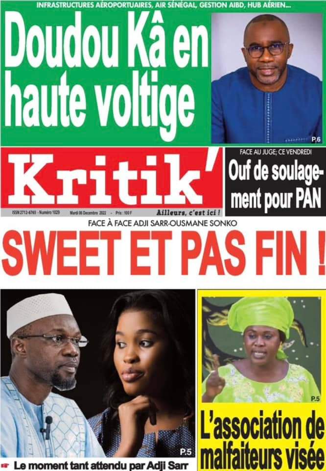 Accueil › Sénégal › Une des journaux du mardi 06 décembre 2022 Une des journaux du mardi 06 décembre 2022 Publié le 6 Déc 2022, à 05:08 par Abdou Faty GUEYE Une des journaux du mardi 06 décembre 2022 Votre avis sera publié et visible par des milliers de lecteurs. Veuillez l’exprimer dans un langage respectueux. Commentaire Nom E-mail (ne sera pas visible) Enregistrer mon nom, mon e-mail et mon site web dans le navigateur pour mon prochain commentaire. Partager Partager Partager 0 Laisser un commentaire Annuler la réponseCommentaireNom E-mail (ne sera pas visible) Enregistrer mon nom, mon e-mail et mon site dans le navigateur pour mon prochain commentaire.