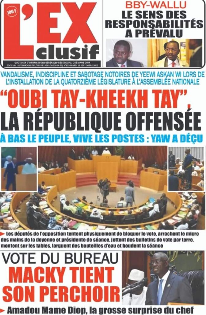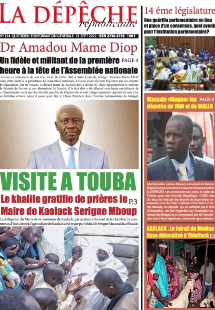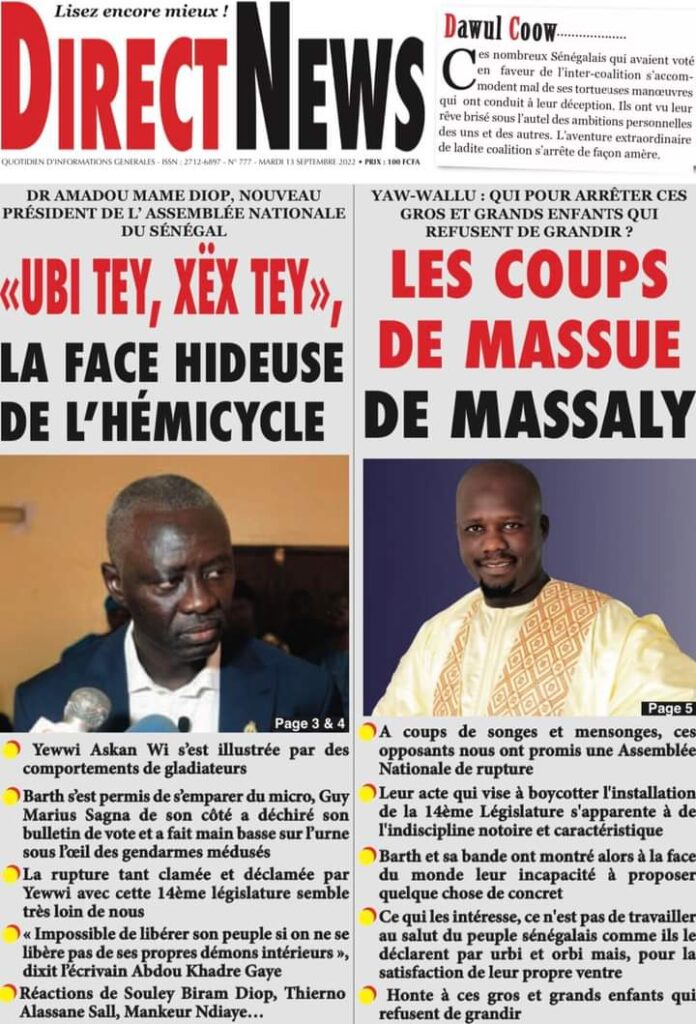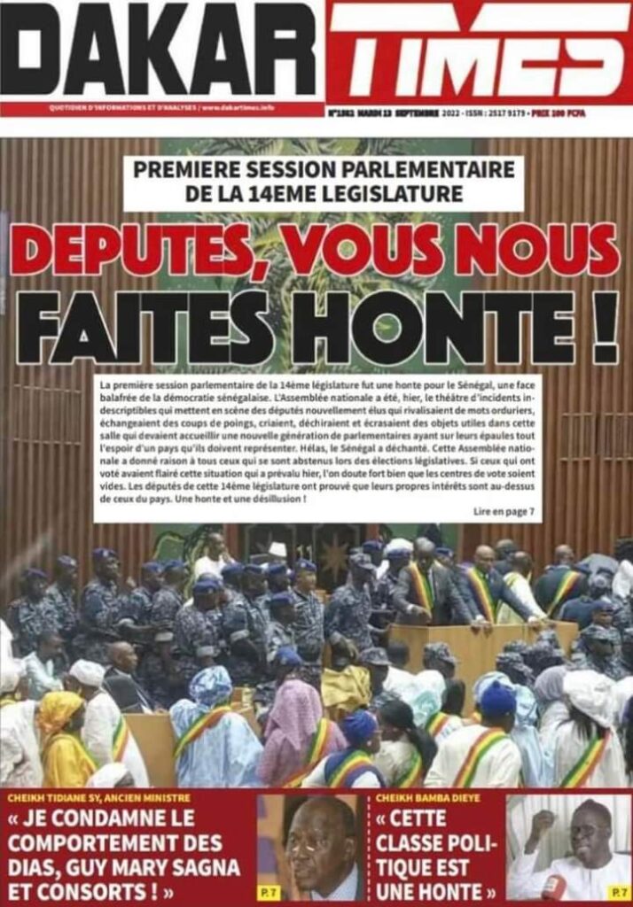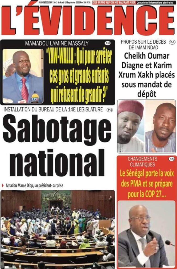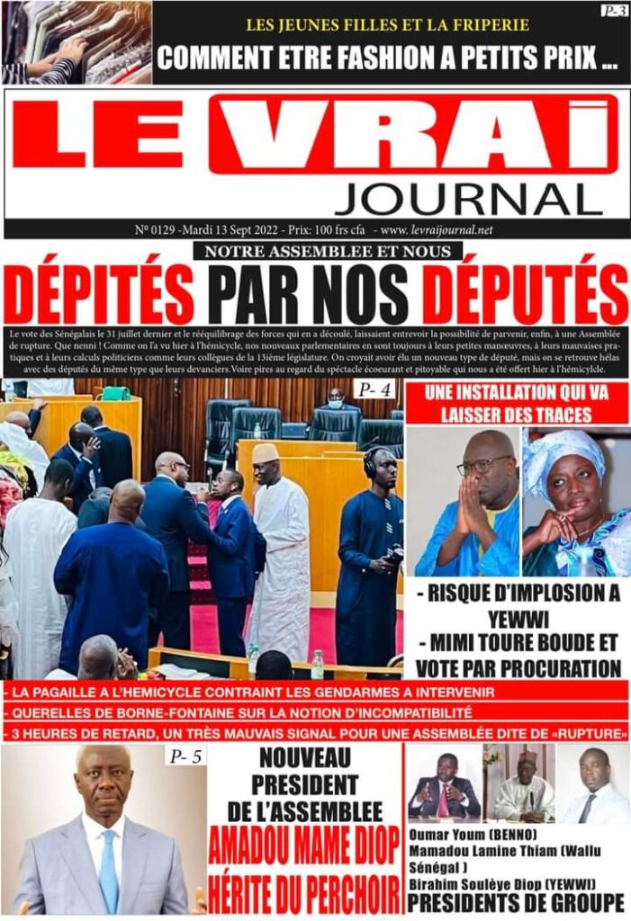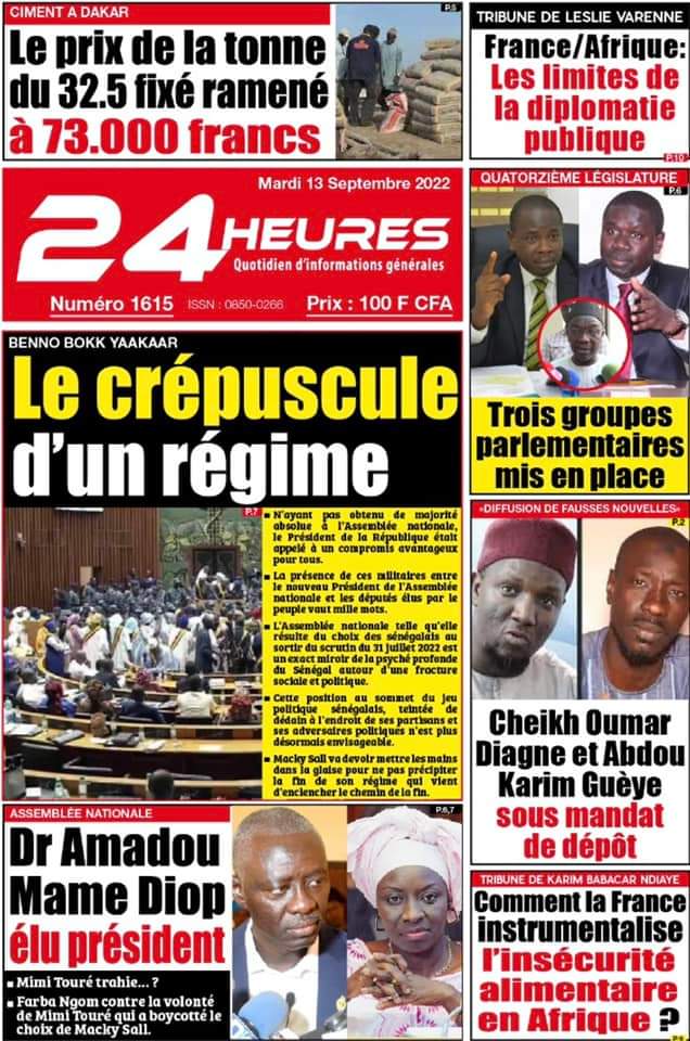 Accueil › Sénégal › Une des journaux du mardi 13 septembre 2022 Actualités Une des journaux du mardi 13 septembre 2022 Abdou Faty GUEYE 13 Sep 2022, 06:58 1 min Une des journaux du mardi 13 septembre 2022 mardi 13 septembre 2022 une des journaux Votre avis sera publié et visible par des milliers de lecteurs. Veuillez l’exprimer dans un langage respectueux. Commentaire Nom E-mail (ne sera pas visible) Enregistrer mon nom, mon e-mail et mon site web dans le navigateur pour mon prochain commentaire. Partager Partager Partager 0 Laisser un commentaire Annuler la réponseCommentaireNom E-mail (ne sera pas visible) Enregistrer mon nom, mon e-mail et mon site dans le navigateur pour mon prochain commentaire.