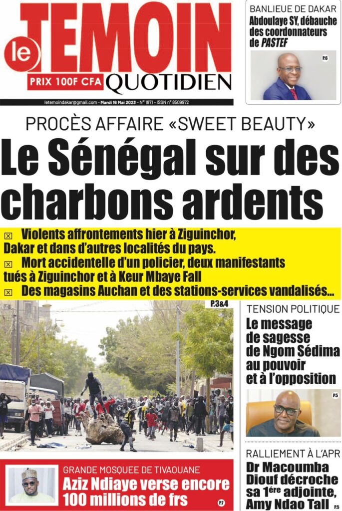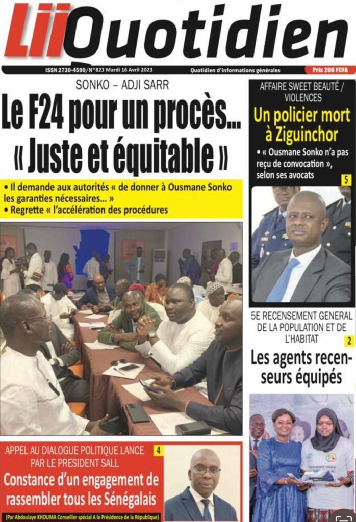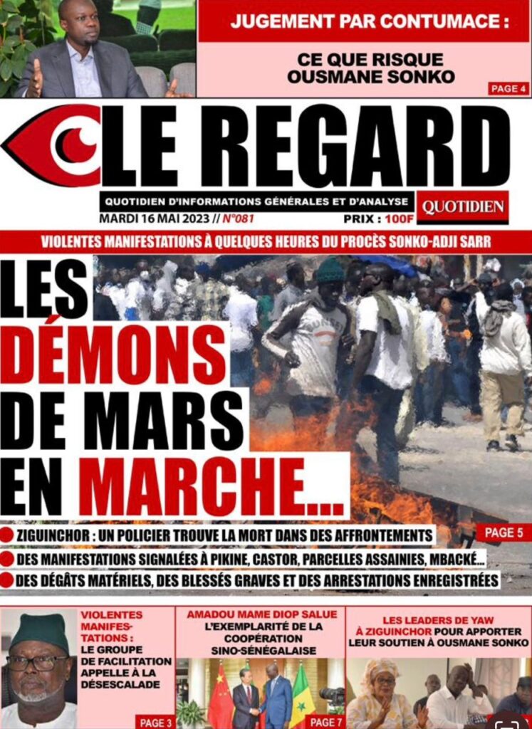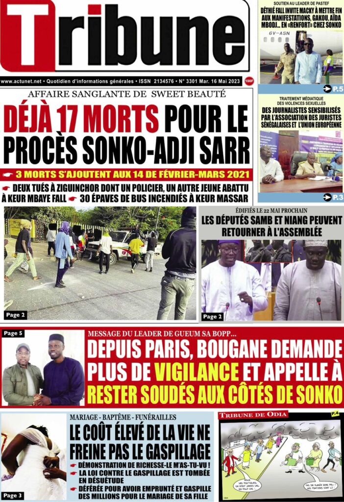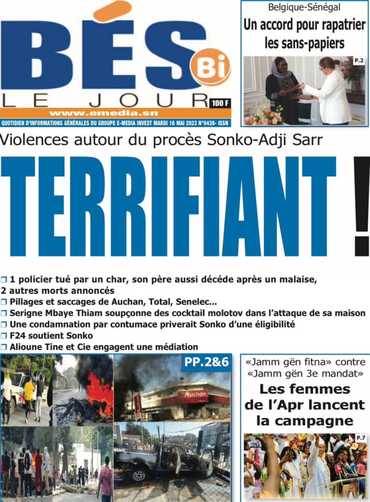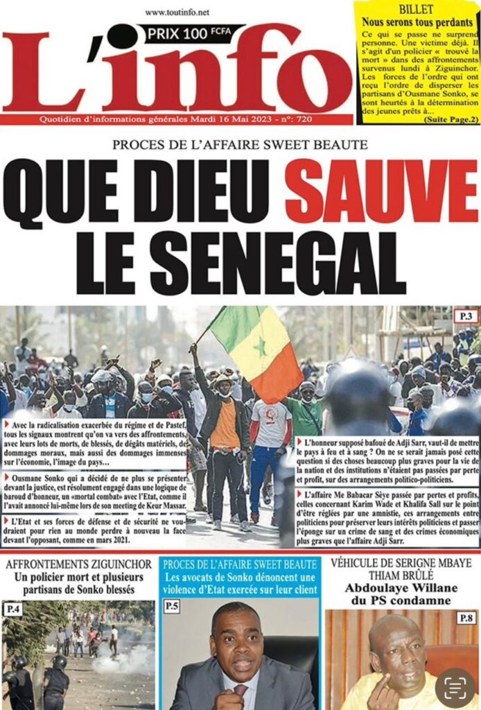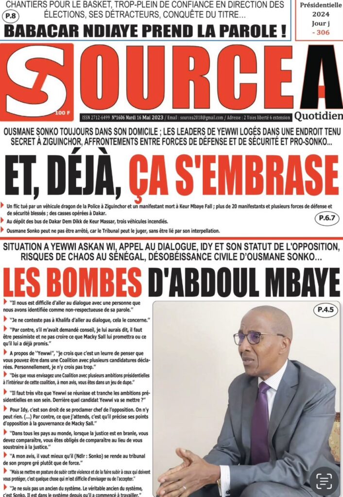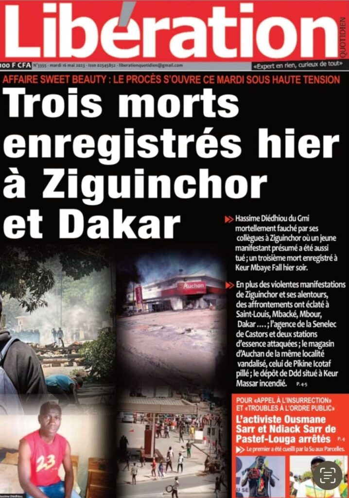 Accueil › Sénégal › Une des journaux sénégalais de ce mardi 16 mai 2023 Actualités Une des journaux sénégalais de ce mardi 16 mai 2023 Abdou Faty GUEYE 16 Mai 2023, 06:25 1 min Une des journaux du mardi 16 mai 2023 mardi 16 mai 2023 une des journaux Votre avis sera publié et visible par des milliers de lecteurs. Veuillez l’exprimer dans un langage respectueux. Commentaire Nom E-mail (ne sera pas visible) Enregistrer mon nom, mon e-mail et mon site web dans le navigateur pour mon prochain commentaire. Partager Partager Partager 0 Laisser un commentaire Annuler la réponseCommentaireNom E-mail (ne sera pas visible) Enregistrer mon nom, mon e-mail et mon site dans le navigateur pour mon prochain commentaire.