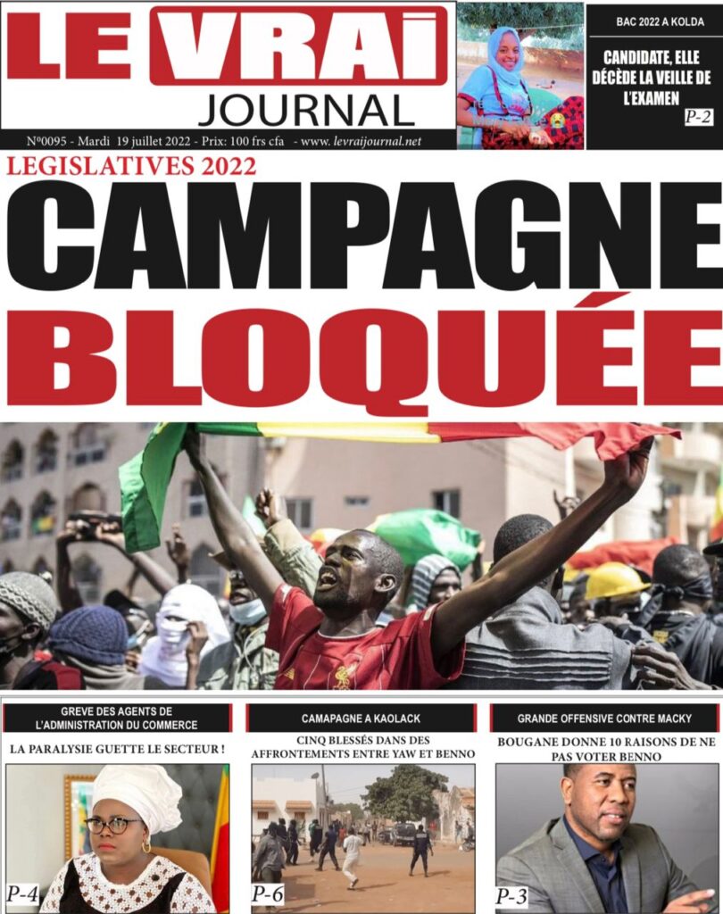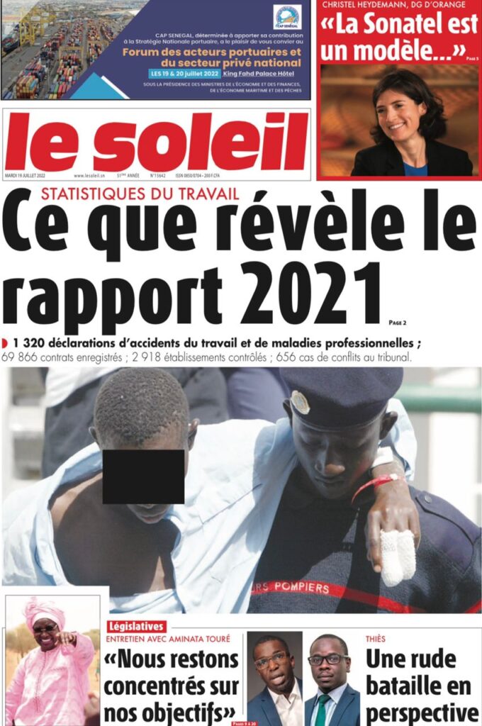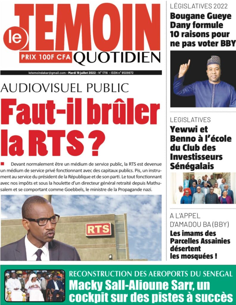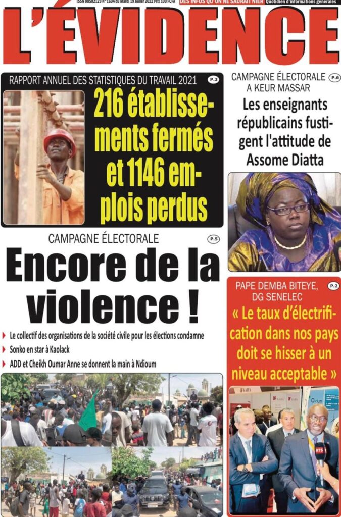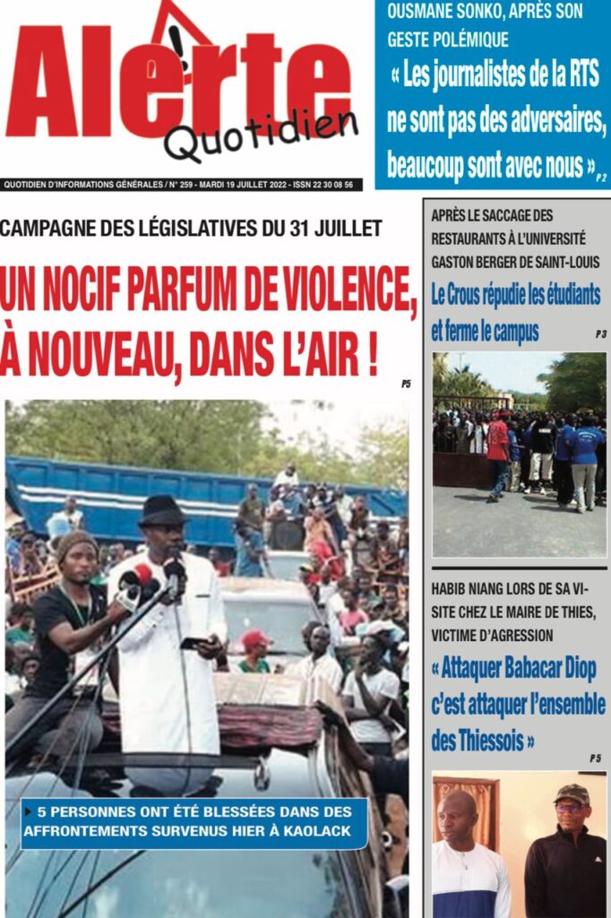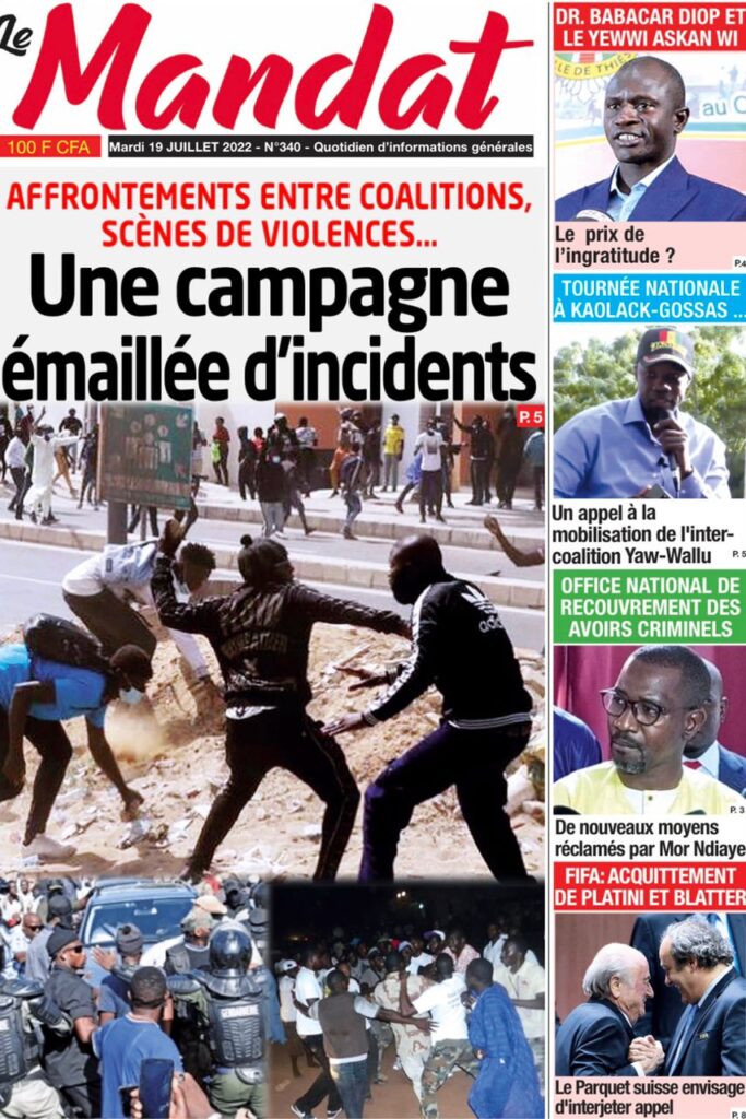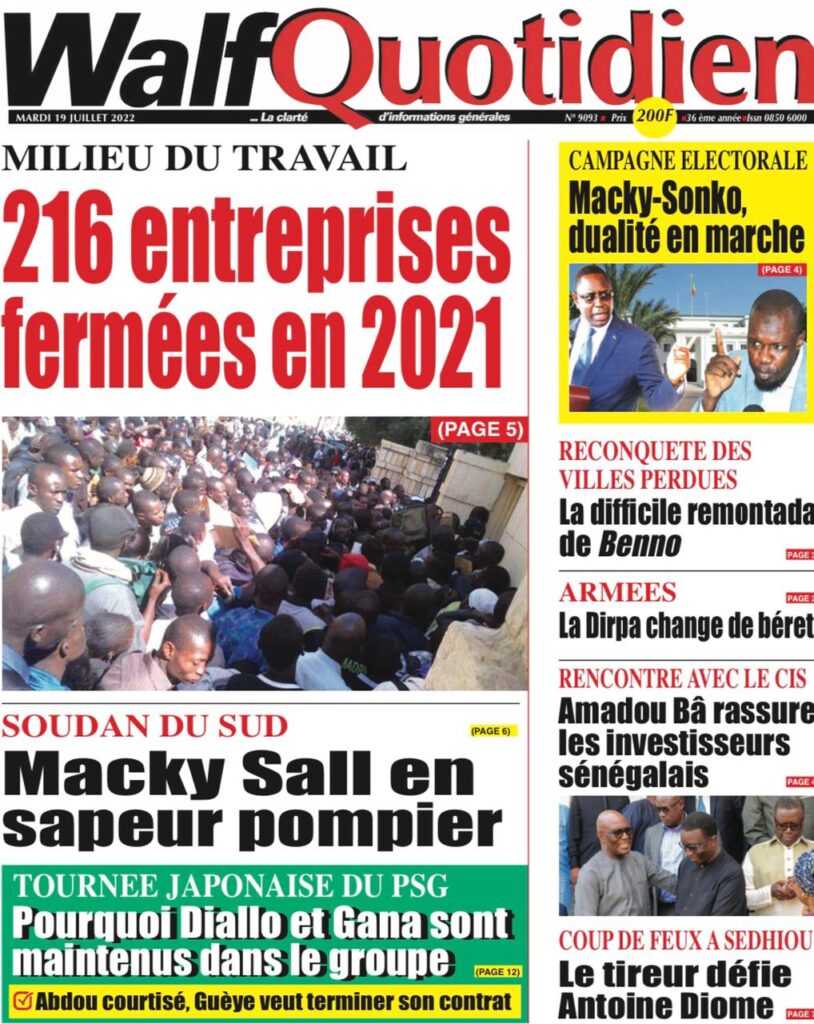 Accueil › Sénégal › Une des journaux du mardi 19 juillet 2022 Une des journaux du mardi 19 juillet 2022 Publié le 19 Juil 2022, à 07:32 par Abdou Faty GUEYE Une des journaux du mardi 19 juillet 2022 Votre avis sera publié et visible par des milliers de lecteurs. Veuillez l’exprimer dans un langage respectueux. Commentaire Nom E-mail (ne sera pas visible) Enregistrer mon nom, mon e-mail et mon site web dans le navigateur pour mon prochain commentaire. Partager Partager Partager 0 Laisser un commentaire Annuler la réponseCommentaireNom E-mail (ne sera pas visible) Enregistrer mon nom, mon e-mail et mon site dans le navigateur pour mon prochain commentaire.