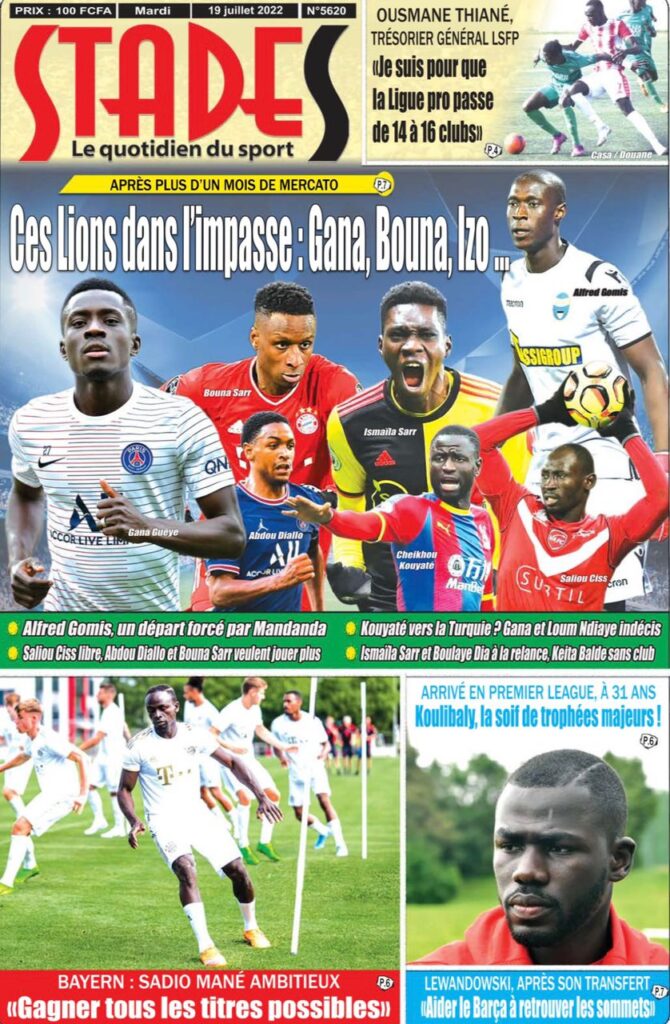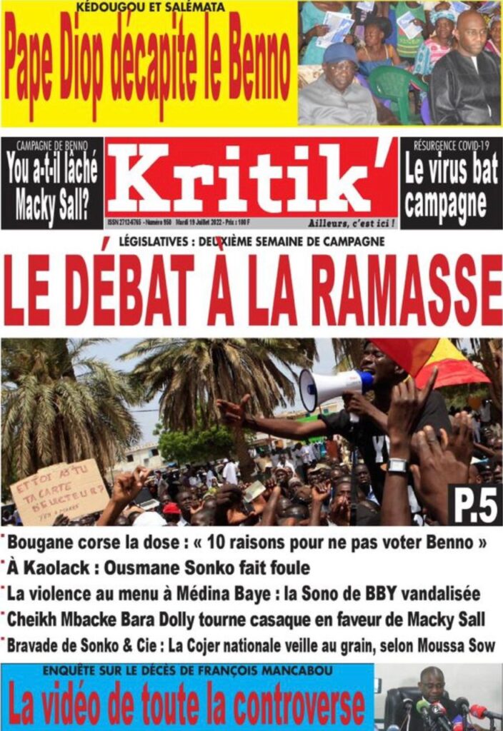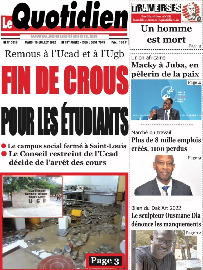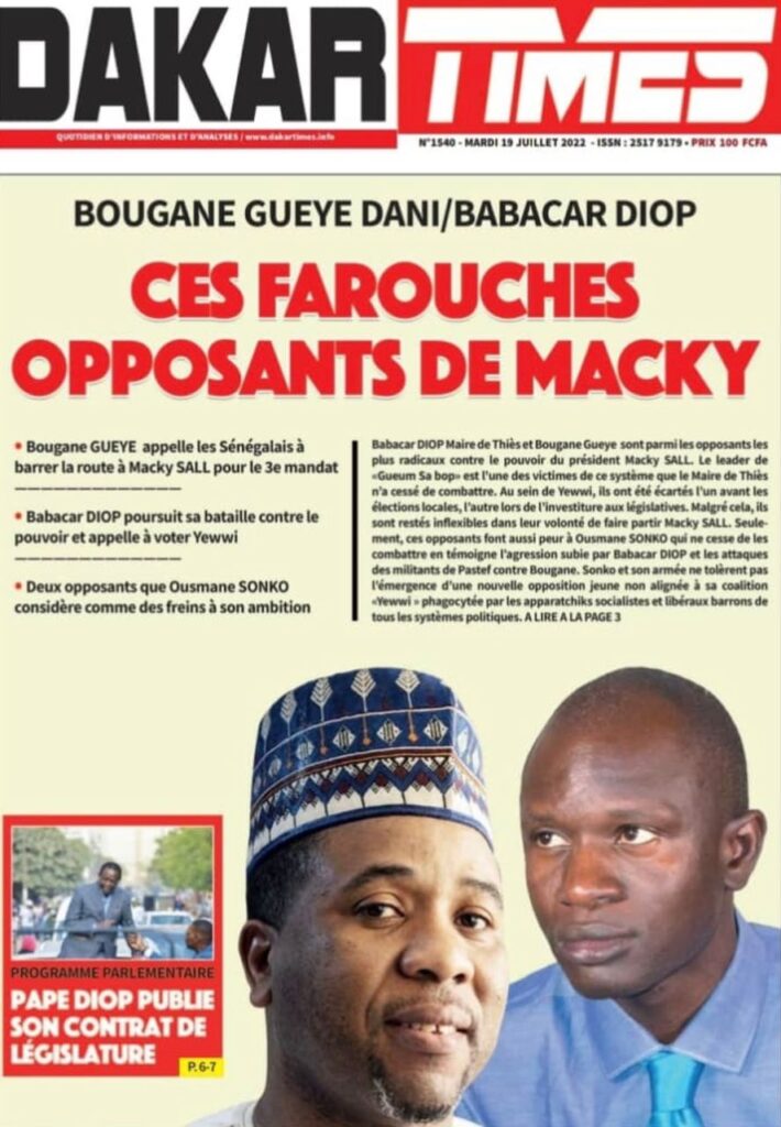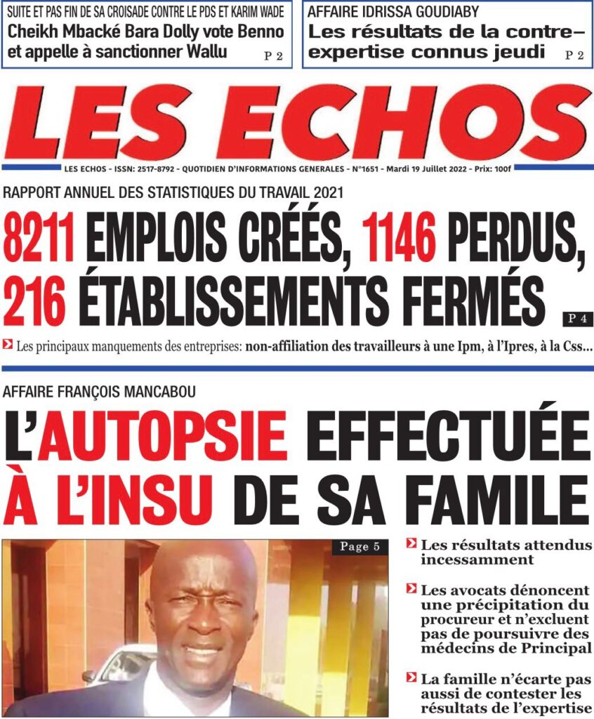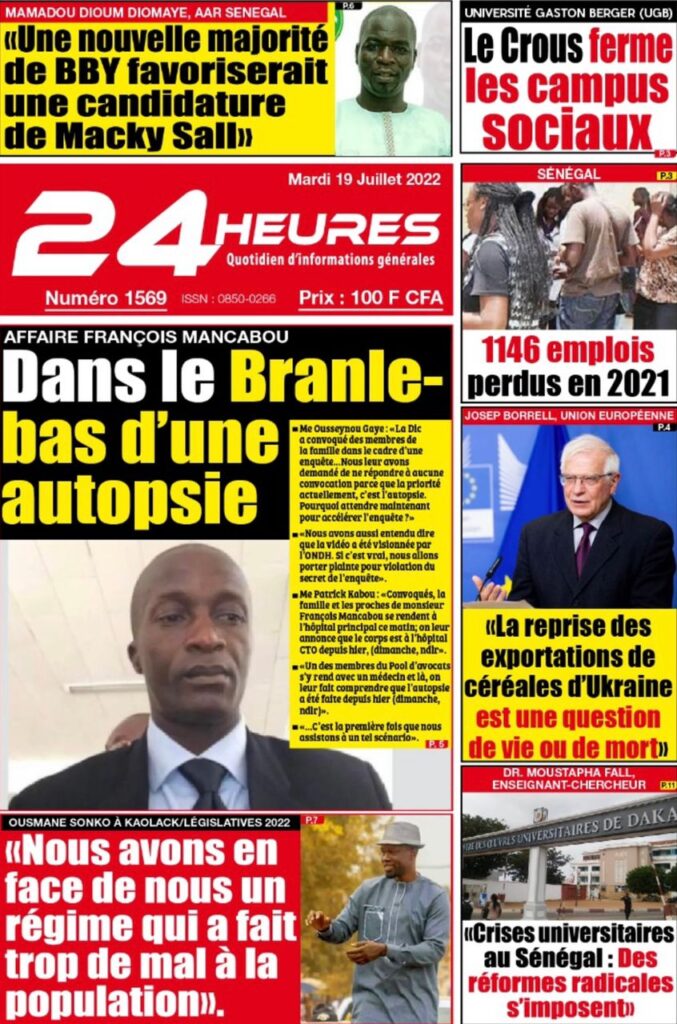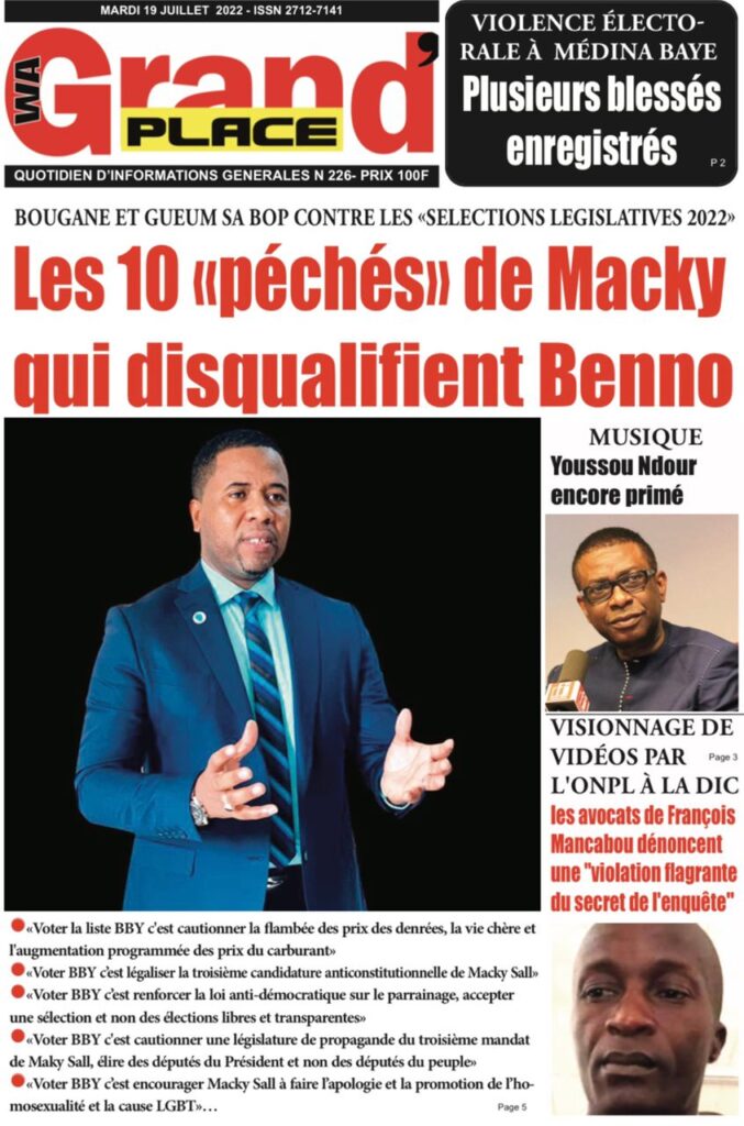 Accueil › Sénégal › Une des journaux du mardi 19 juillet 2022 Une des journaux du mardi 19 juillet 2022 Publié le 19 Juil 2022, à 07:32 par Abdou Faty GUEYE Une des journaux du mardi 19 juillet 2022 Votre avis sera publié et visible par des milliers de lecteurs. Veuillez l’exprimer dans un langage respectueux. Commentaire Nom E-mail (ne sera pas visible) Enregistrer mon nom, mon e-mail et mon site web dans le navigateur pour mon prochain commentaire. Partager Partager Partager 0 Laisser un commentaire Annuler la réponseCommentaireNom E-mail (ne sera pas visible) Enregistrer mon nom, mon e-mail et mon site dans le navigateur pour mon prochain commentaire.
