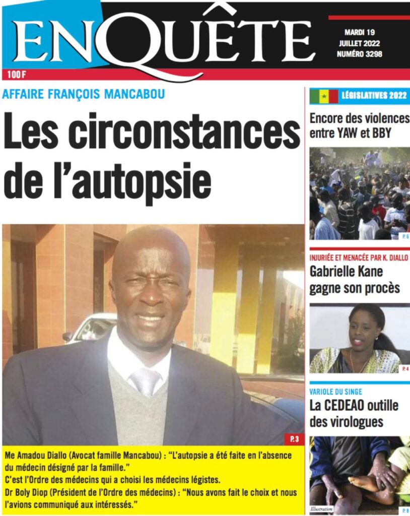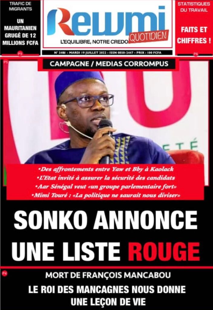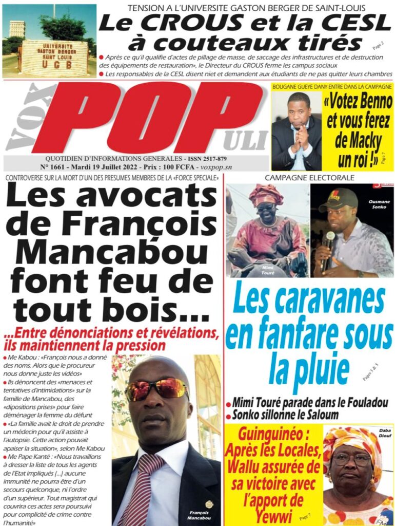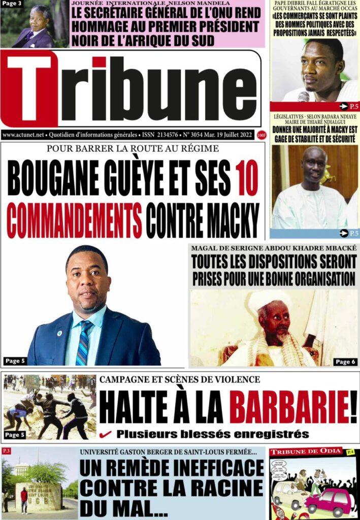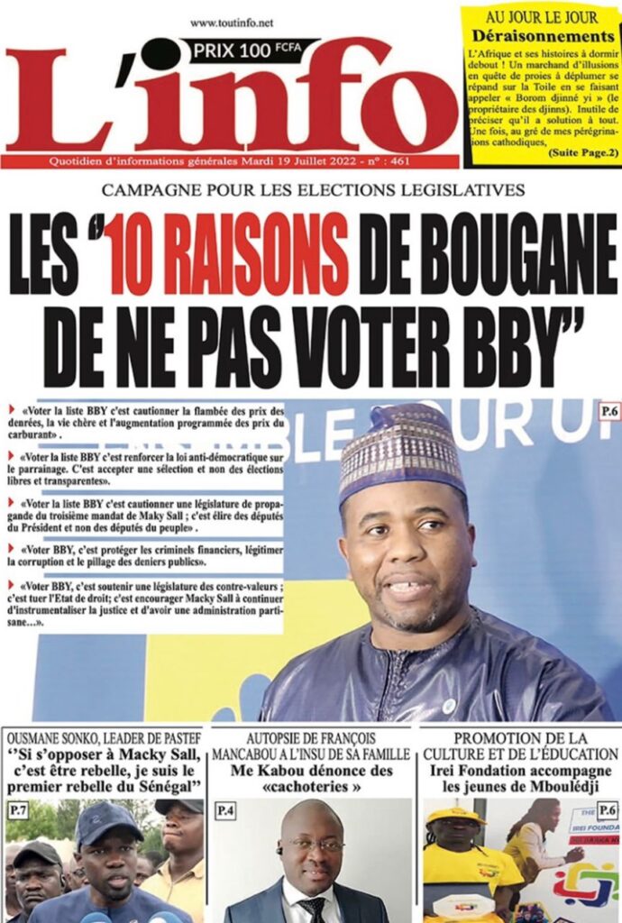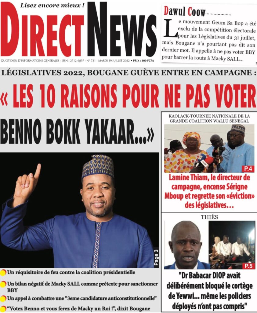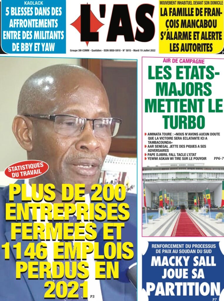 Accueil › Sénégal › Une des journaux du mardi 19 juillet 2022 Une des journaux du mardi 19 juillet 2022 Publié le 19 Juil 2022, à 07:32 par Abdou Faty GUEYE Une des journaux du mardi 19 juillet 2022 Votre avis sera publié et visible par des milliers de lecteurs. Veuillez l’exprimer dans un langage respectueux. Commentaire Nom E-mail (ne sera pas visible) Enregistrer mon nom, mon e-mail et mon site web dans le navigateur pour mon prochain commentaire. Partager Partager Partager 0 Laisser un commentaire Annuler la réponseCommentaireNom E-mail (ne sera pas visible) Enregistrer mon nom, mon e-mail et mon site dans le navigateur pour mon prochain commentaire.