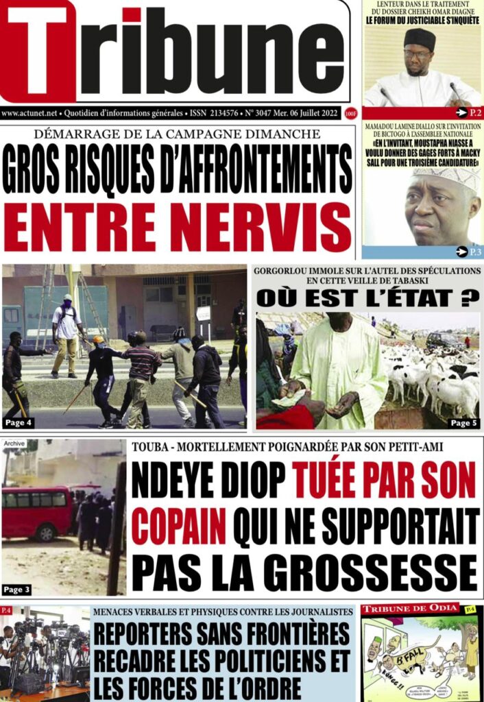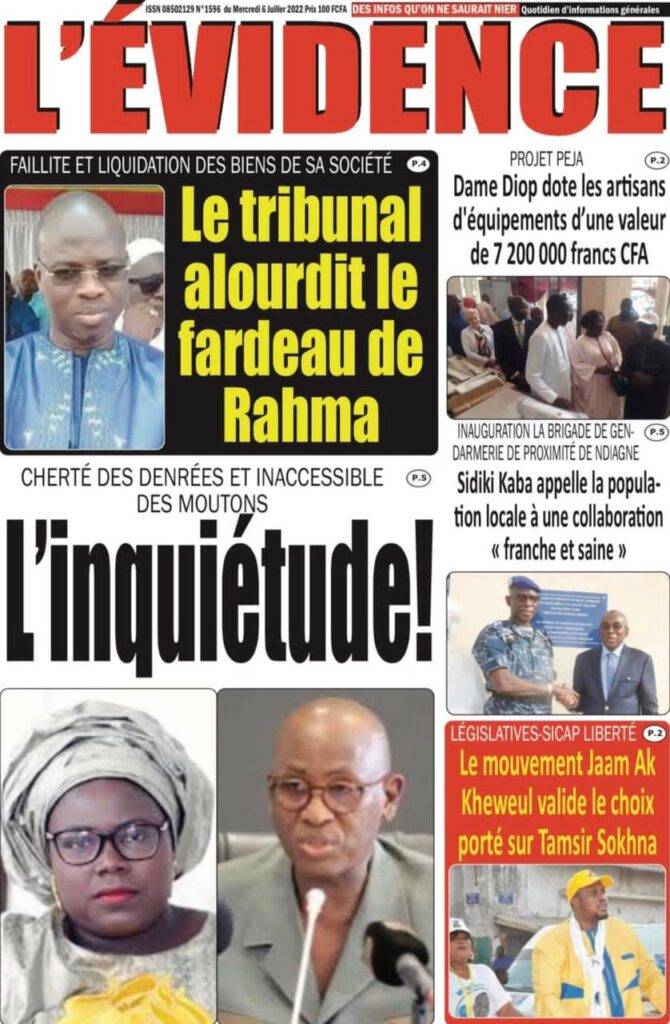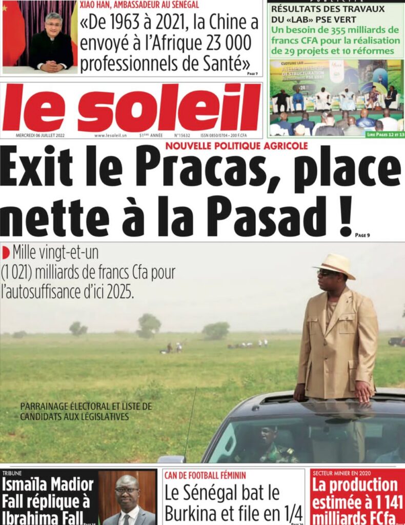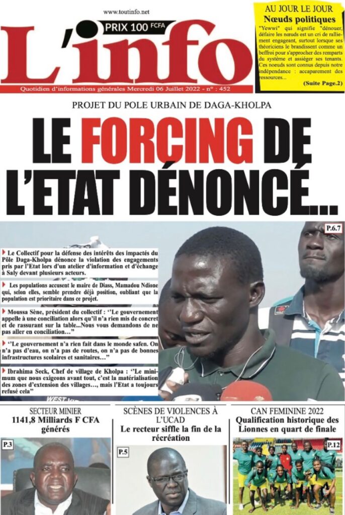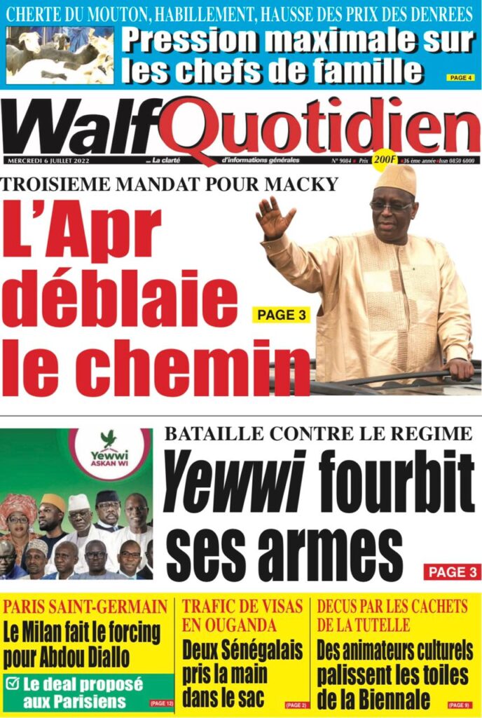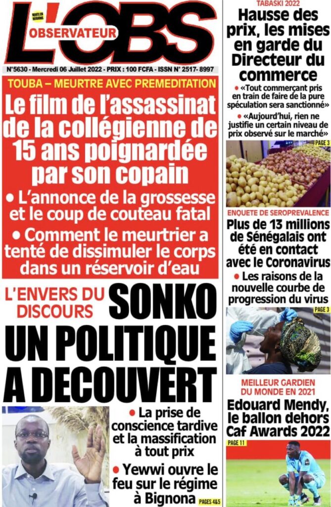 Accueil ›Sénégal ›Une des journaux du mercredi 06 juillet 2022Une des journaux du mercredi 06 juillet 2022 Publié le 6 Juil 2022, à 06:34 par Abdou Faty GUEYE Une des journaux du mercredi 06 juillet 2022Votre avis sera publié et visible par des milliers de lecteurs. Veuillez l’exprimer dans un langage respectueux. Commentaire Nom E-mail (ne sera pas visible) Enregistrer mon nom, mon e-mail et mon site web dans le navigateur pour mon prochain commentaire. Partager Partager Partager 0 Laisser un commentaire Annuler la réponseCommentaireNom E-mail (ne sera pas visible) Enregistrer mon nom, mon e-mail et mon site dans le navigateur pour mon prochain commentaire.