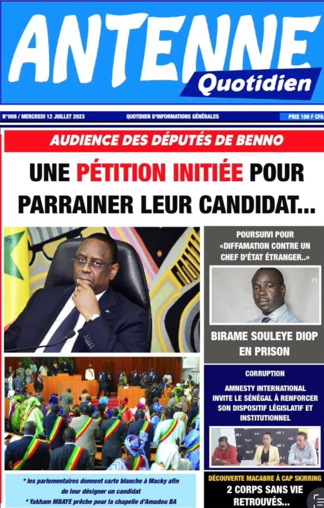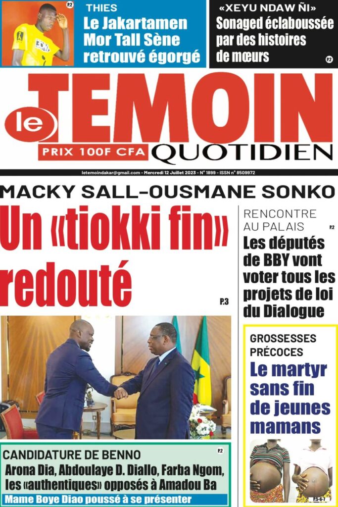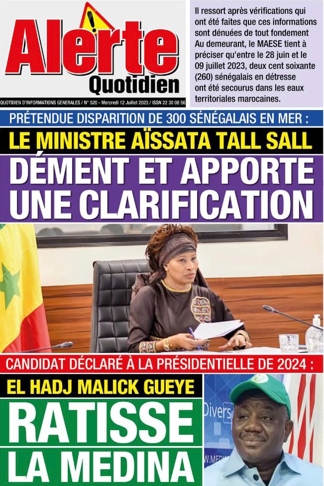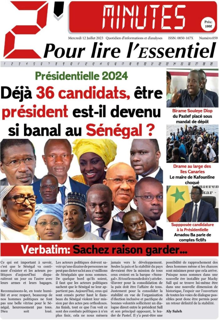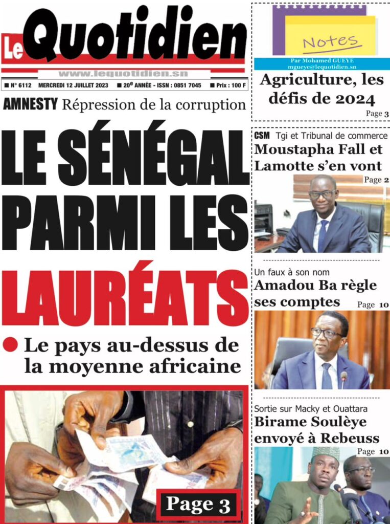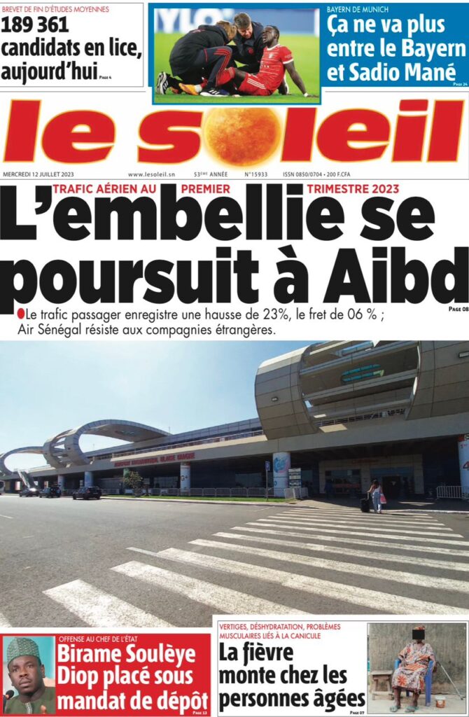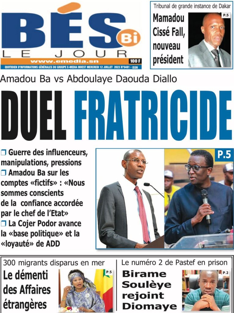 Accueil › Sénégal › Une des journaux du mercredi 12 juillet 2023 Actualités Une des journaux du mercredi 12 juillet 2023 Abdou Faty GUEYE 12 Juil 2023, 07:48 1 min mercredi 12 juillet 2023 une des journaux Votre avis sera publié et visible par des milliers de lecteurs. Veuillez l’exprimer dans un langage respectueux. Commentaire Nom E-mail (ne sera pas visible) Enregistrer mon nom, mon e-mail et mon site web dans le navigateur pour mon prochain commentaire. Partager Partager Partager 0 Laisser un commentaire Annuler la réponseCommentaireNom E-mail (ne sera pas visible) Enregistrer mon nom, mon e-mail et mon site dans le navigateur pour mon prochain commentaire.