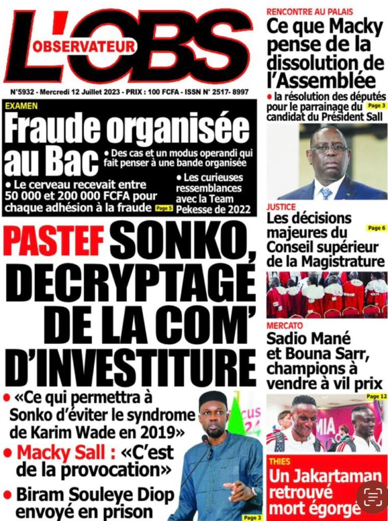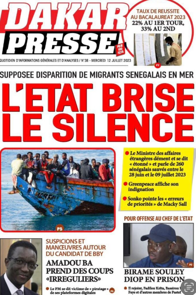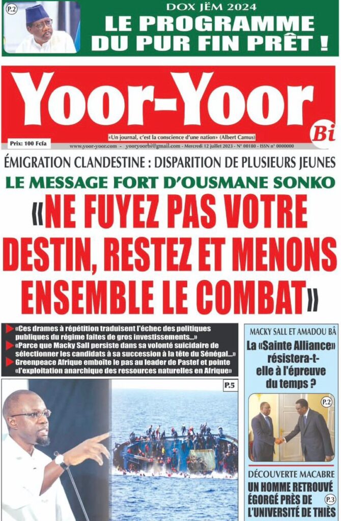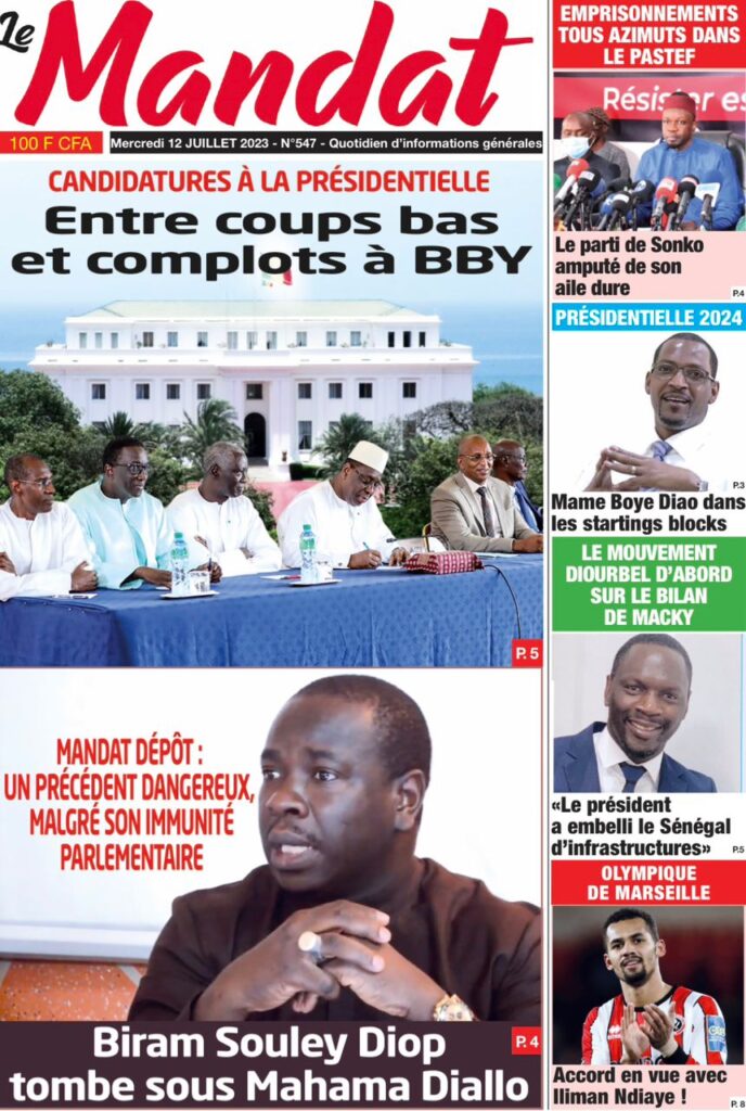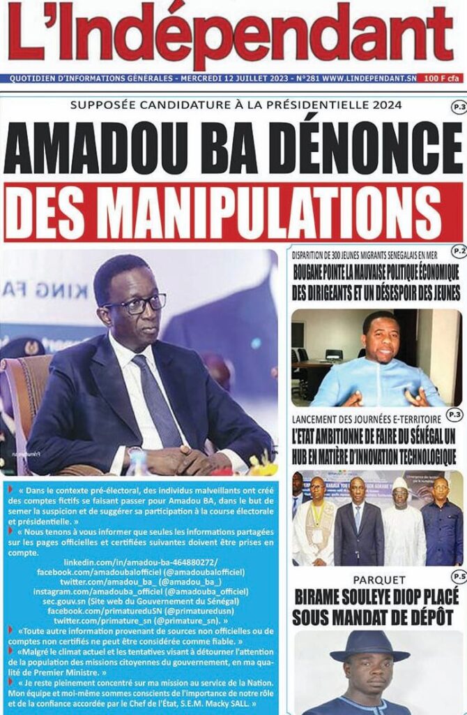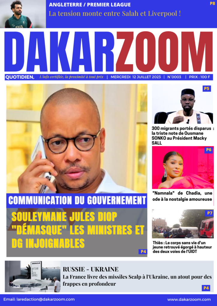 Accueil › Sénégal › Une des journaux du mercredi 12 juillet 2023 Actualités Une des journaux du mercredi 12 juillet 2023 Abdou Faty GUEYE 12 Juil 2023, 07:48 1 min mercredi 12 juillet 2023 une des journaux Votre avis sera publié et visible par des milliers de lecteurs. Veuillez l’exprimer dans un langage respectueux. Commentaire Nom E-mail (ne sera pas visible) Enregistrer mon nom, mon e-mail et mon site web dans le navigateur pour mon prochain commentaire. Partager Partager Partager 0 Laisser un commentaire Annuler la réponseCommentaireNom E-mail (ne sera pas visible) Enregistrer mon nom, mon e-mail et mon site dans le navigateur pour mon prochain commentaire.