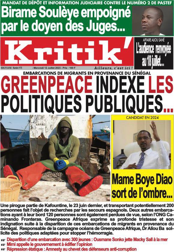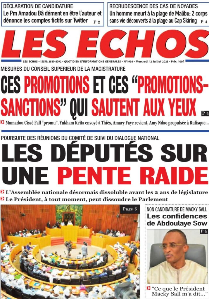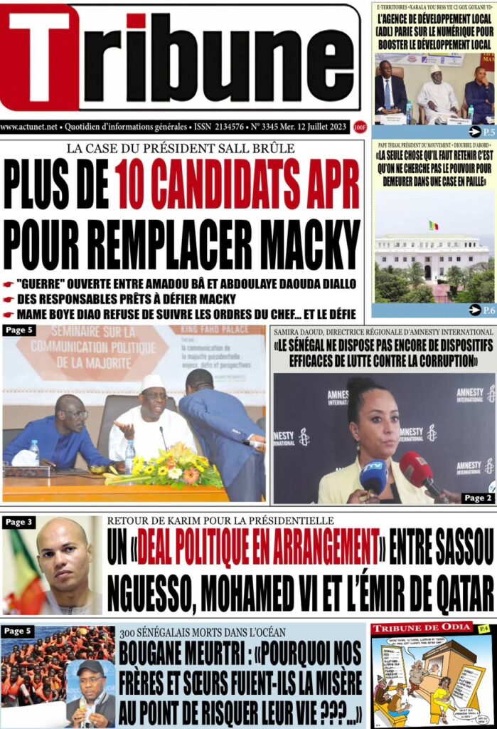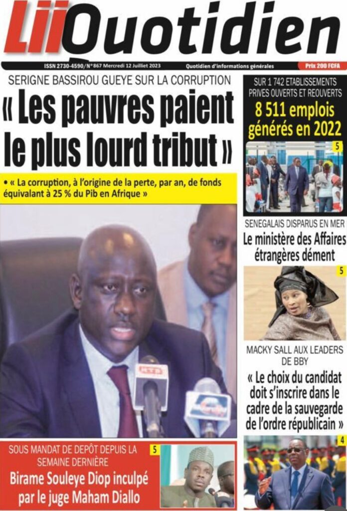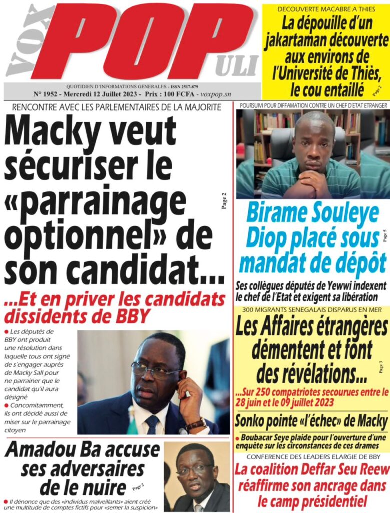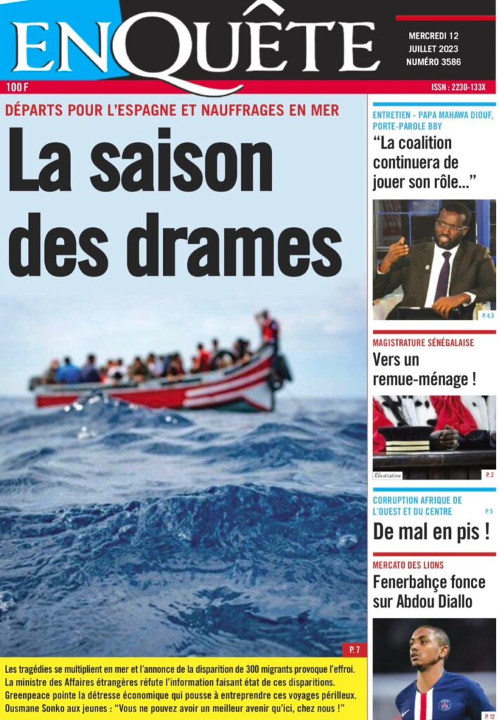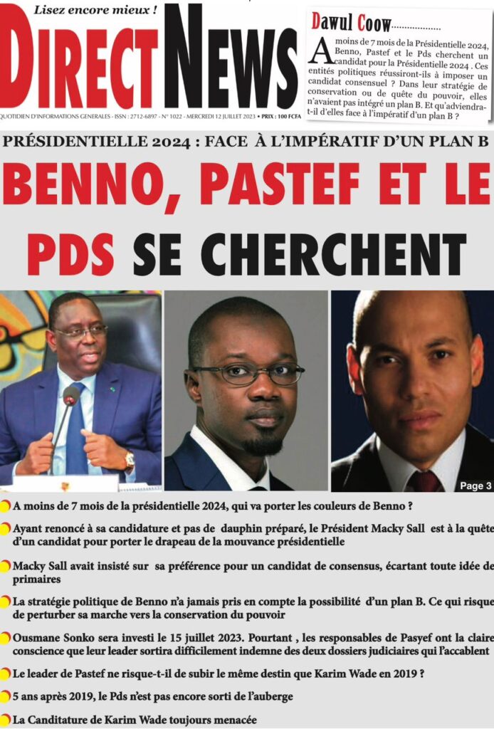 Accueil › Sénégal › Une des journaux du mercredi 12 juillet 2023 Actualités Une des journaux du mercredi 12 juillet 2023 Abdou Faty GUEYE 12 Juil 2023, 07:48 1 min mercredi 12 juillet 2023 une des journaux Votre avis sera publié et visible par des milliers de lecteurs. Veuillez l’exprimer dans un langage respectueux. Commentaire Nom E-mail (ne sera pas visible) Enregistrer mon nom, mon e-mail et mon site web dans le navigateur pour mon prochain commentaire. Partager Partager Partager 0 Laisser un commentaire Annuler la réponseCommentaireNom E-mail (ne sera pas visible) Enregistrer mon nom, mon e-mail et mon site dans le navigateur pour mon prochain commentaire.