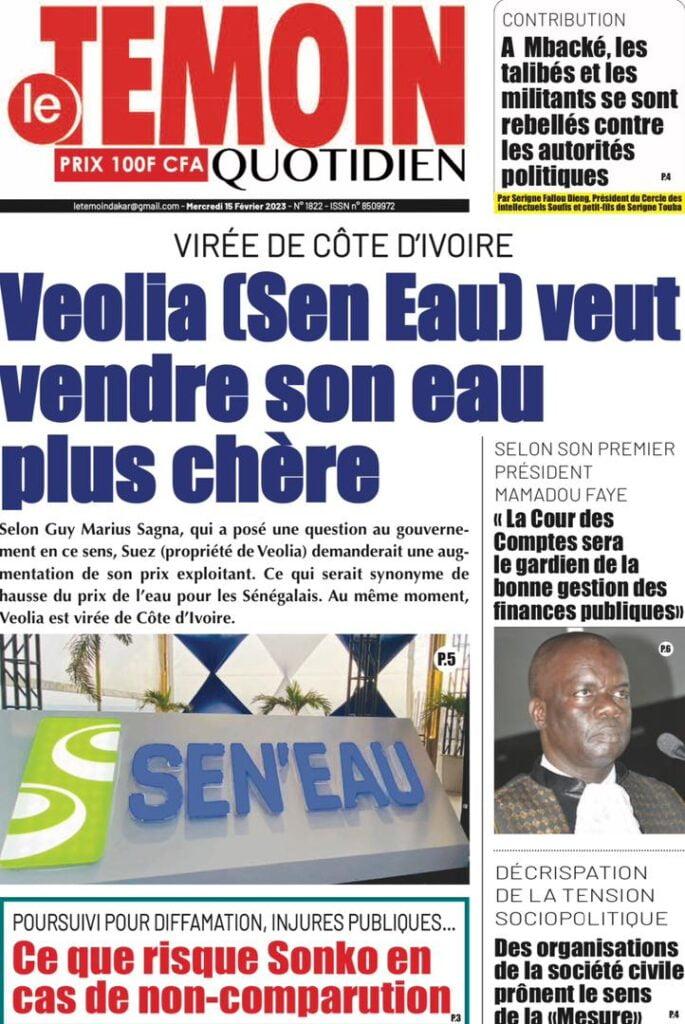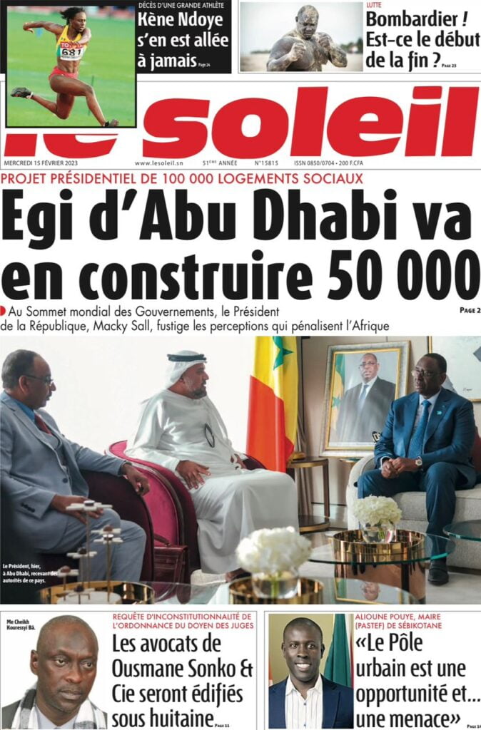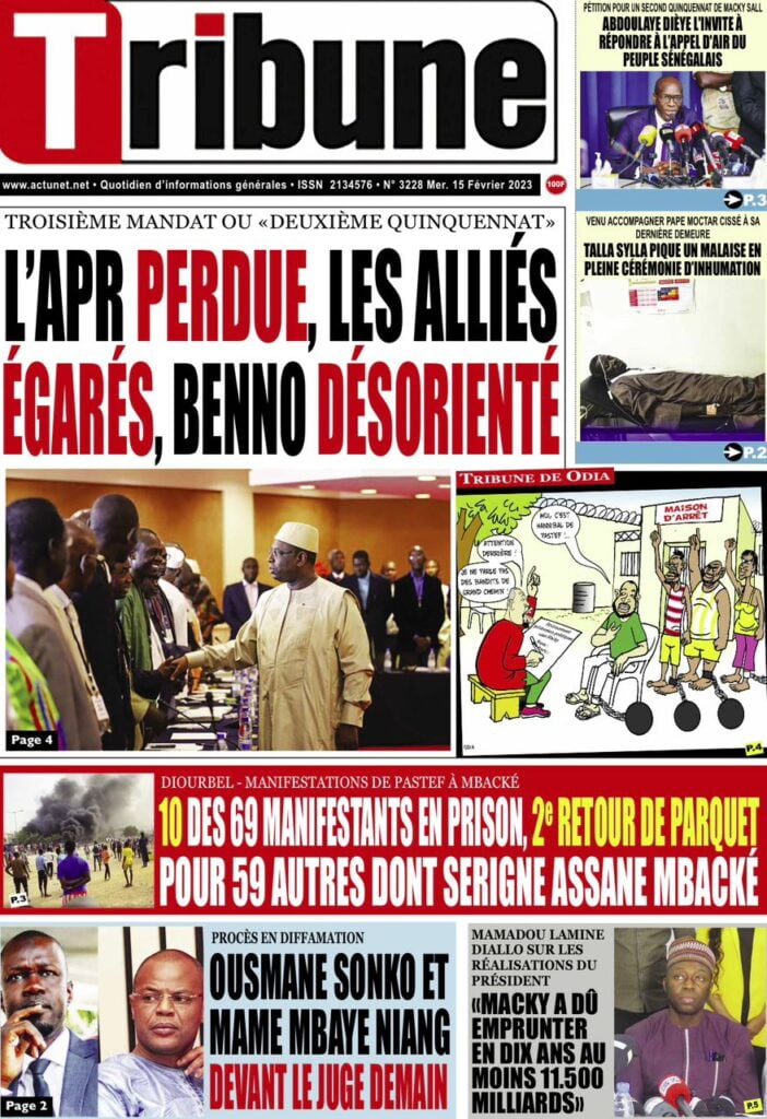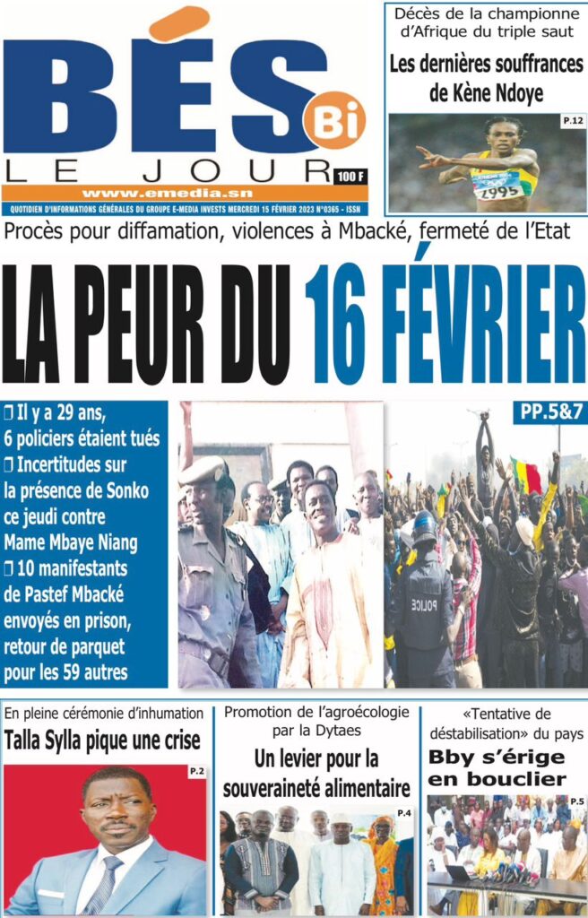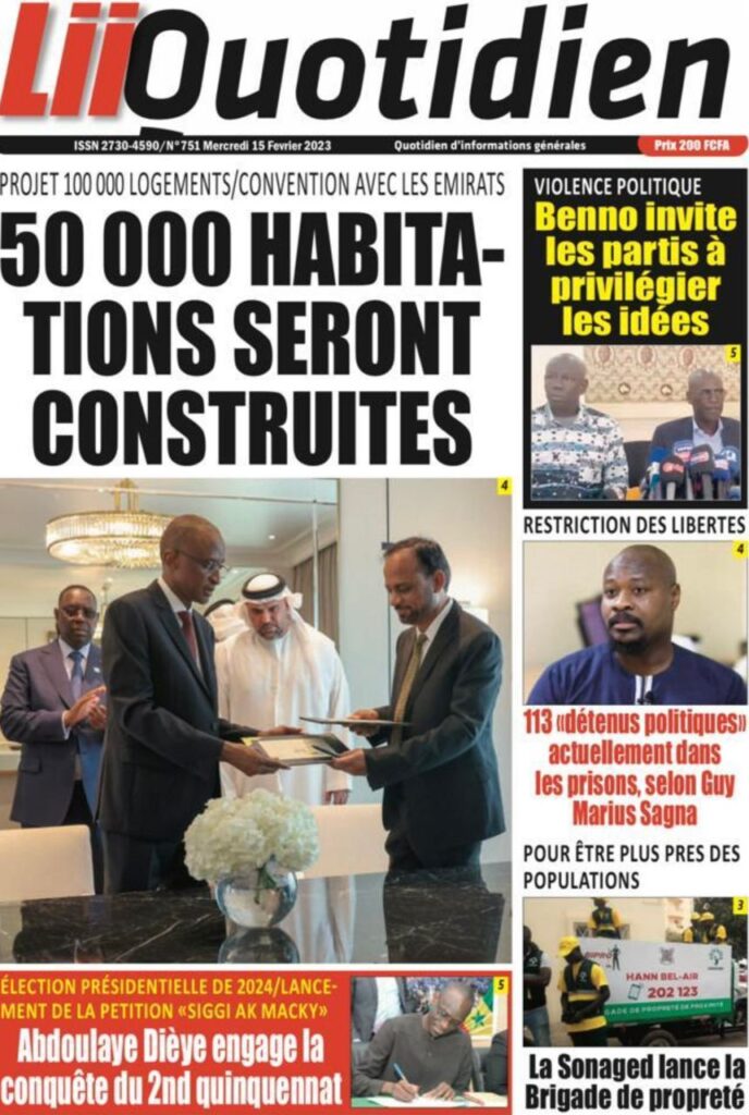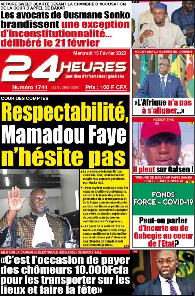 Accueil › Sénégal › Une des journaux du mercredi 15 février 2023 Actualités Une des journaux du mercredi 15 février 2023 Abdou Faty GUEYE 15 Fév 2023, 08:22 1 min Une des journaux du mercredi 15 février 2023 mercredi 15 février 2023 une des journaux Votre avis sera publié et visible par des milliers de lecteurs. Veuillez l’exprimer dans un langage respectueux. Commentaire Nom E-mail (ne sera pas visible) Enregistrer mon nom, mon e-mail et mon site web dans le navigateur pour mon prochain commentaire. Partager Partager Partager 0 Laisser un commentaire Annuler la réponseCommentaireNom E-mail (ne sera pas visible) Enregistrer mon nom, mon e-mail et mon site dans le navigateur pour mon prochain commentaire.