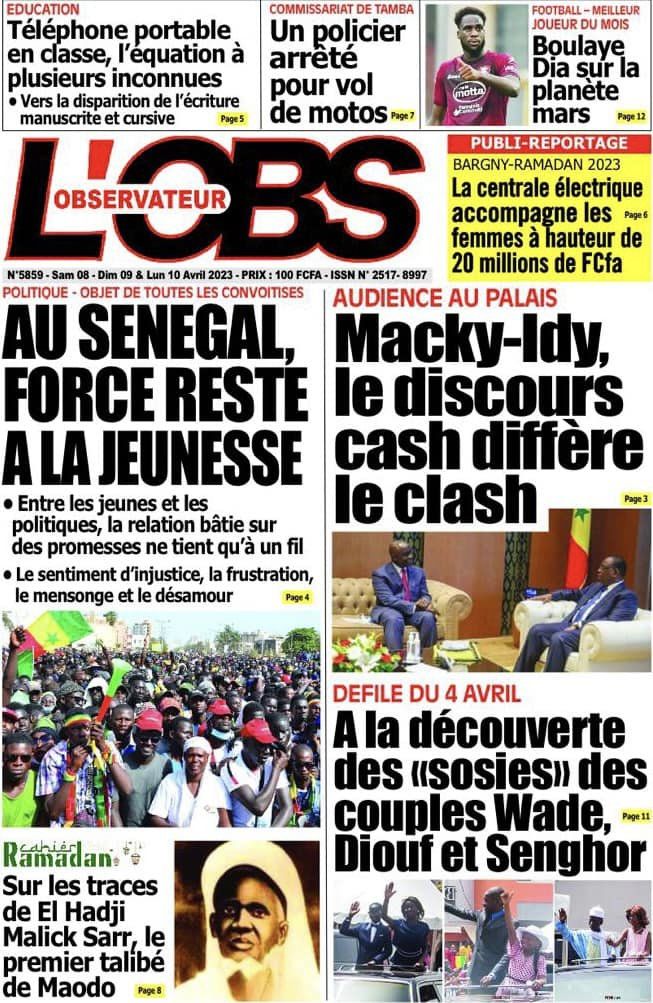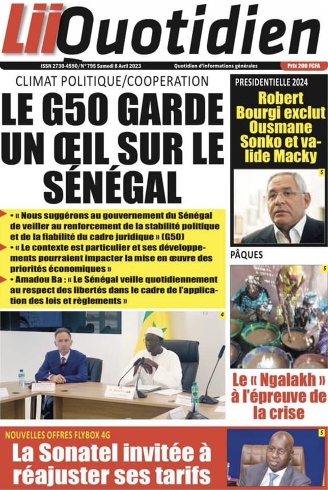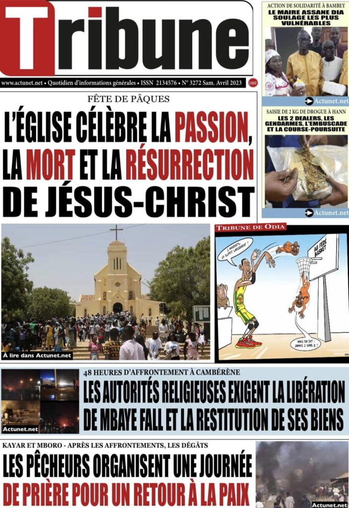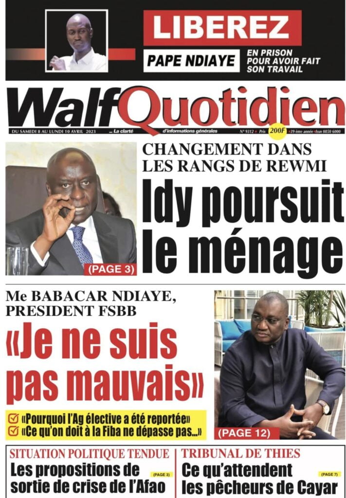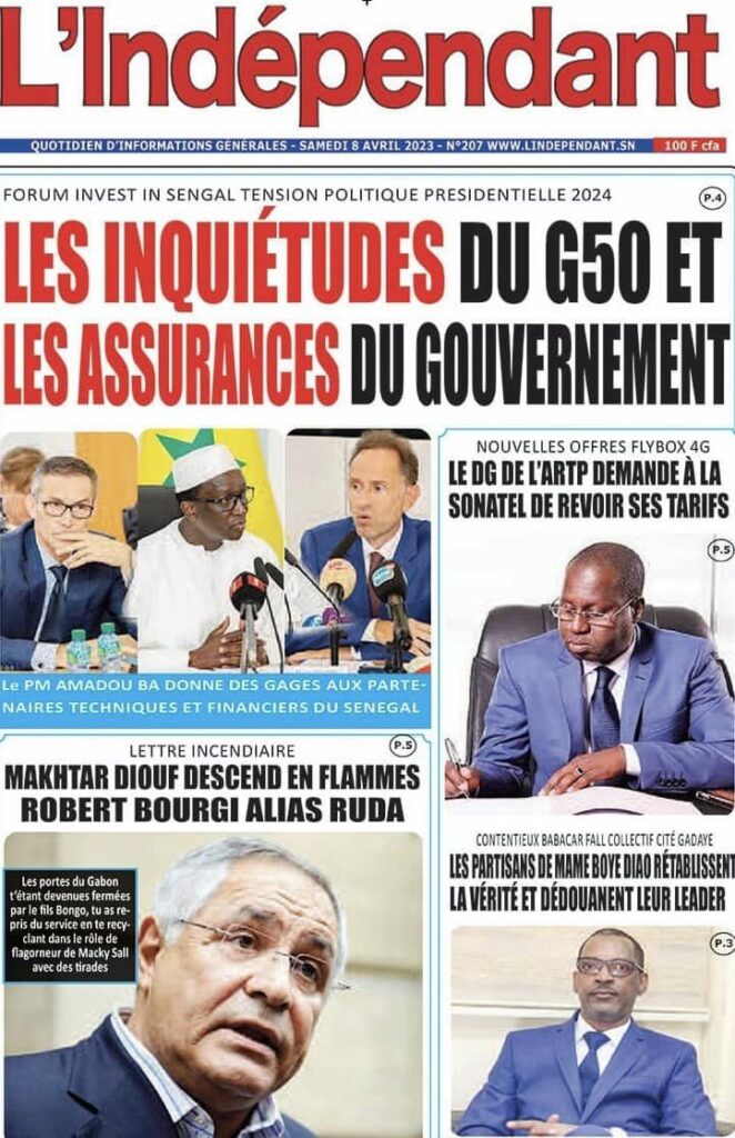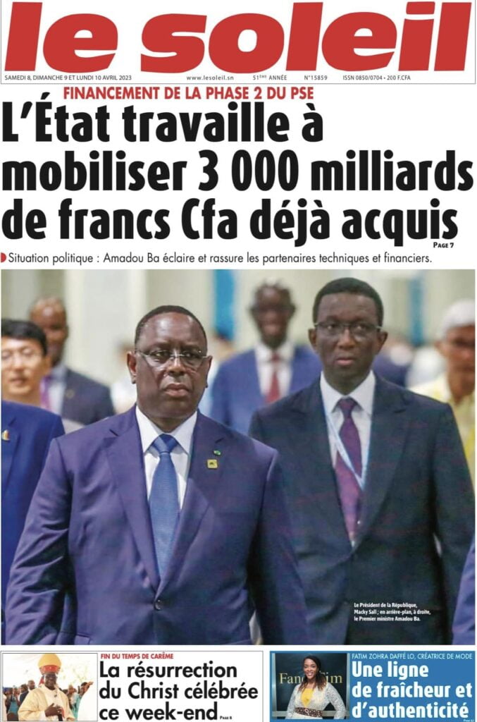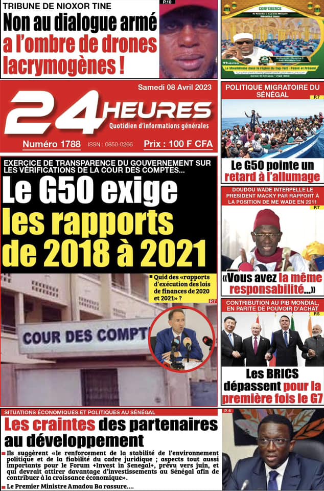 Accueil ›Actualités ›Revue de presse ›Une des journaux du samedi 08 avril 2023Une des journaux du samedi 08 avril 2023 Publié le 8 Avr 2023, à 05:12 par Abdou Faty GUEYE Une des journaux du samedi 08 avril 2023Votre avis sera publié et visible par des milliers de lecteurs. Veuillez l’exprimer dans un langage respectueux. Commentaire Nom E-mail (ne sera pas visible) Enregistrer mon nom, mon e-mail et mon site web dans le navigateur pour mon prochain commentaire. Partager Partager Partager 0 Laisser un commentaire Annuler la réponseCommentaireNom E-mail (ne sera pas visible) Enregistrer mon nom, mon e-mail et mon site dans le navigateur pour mon prochain commentaire.