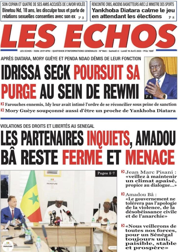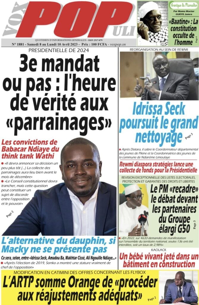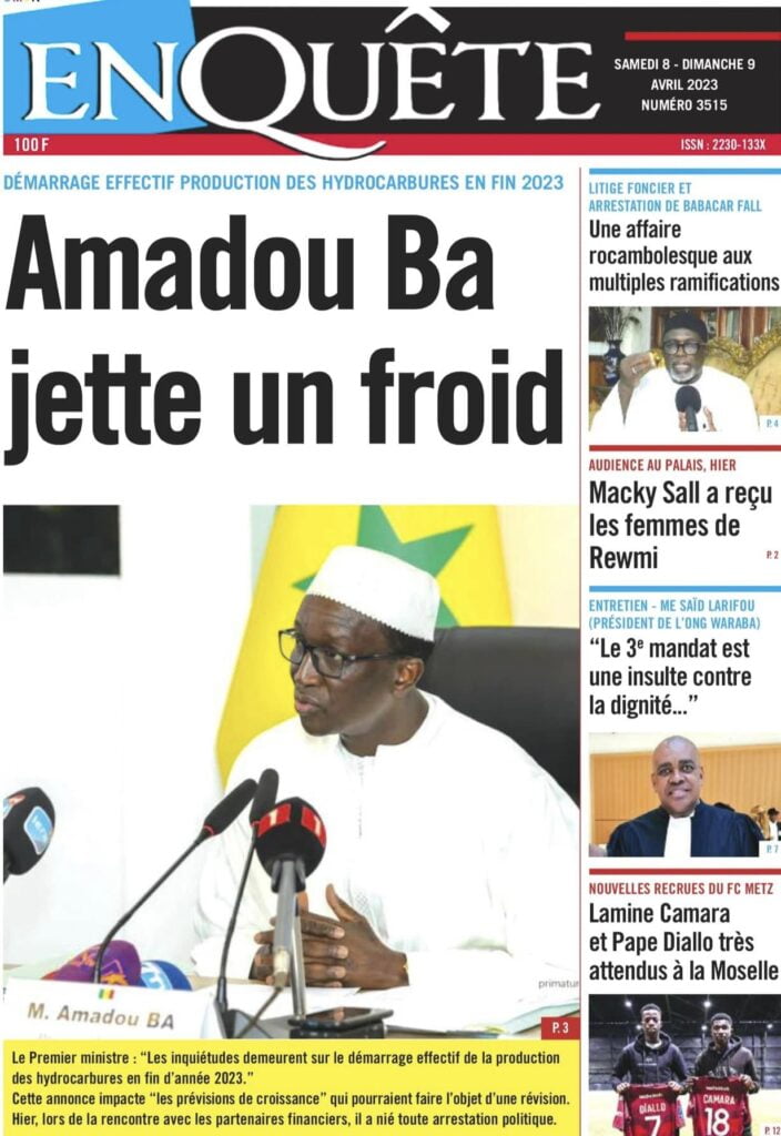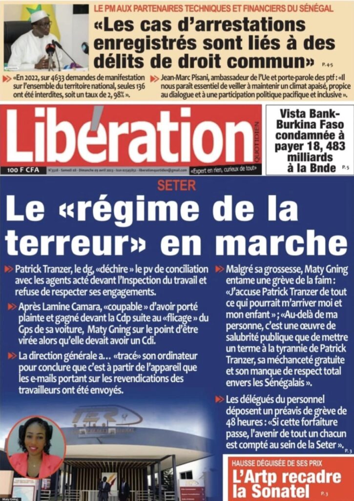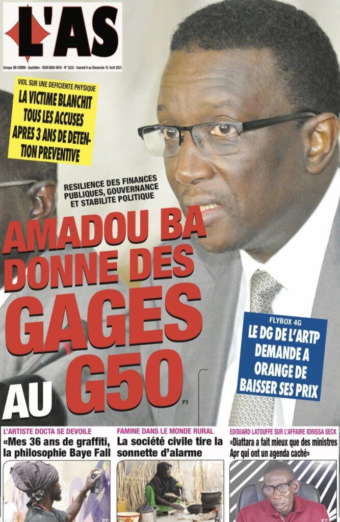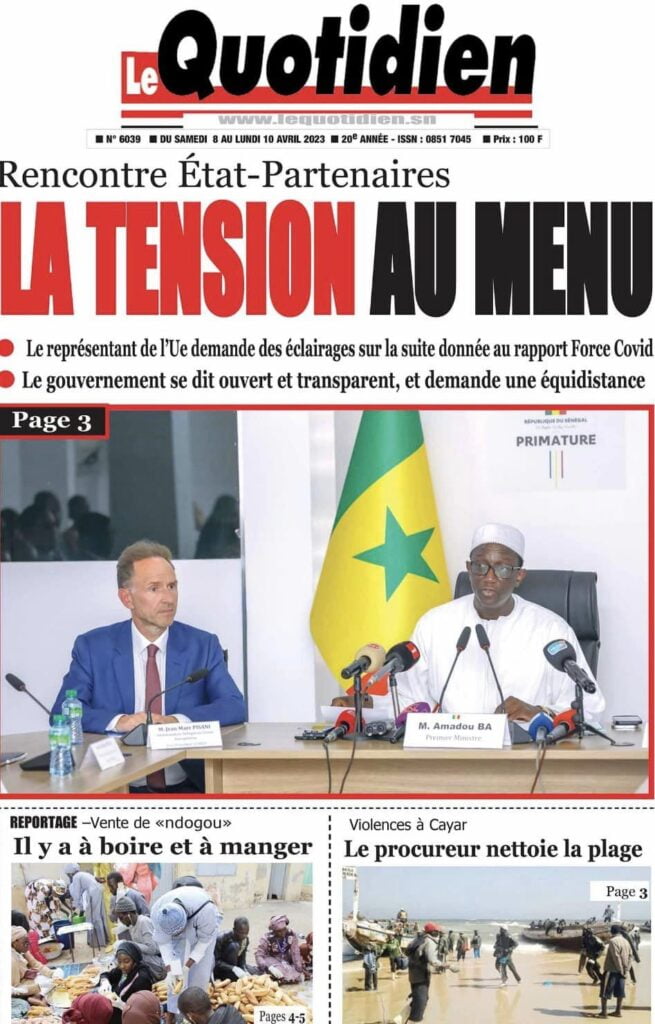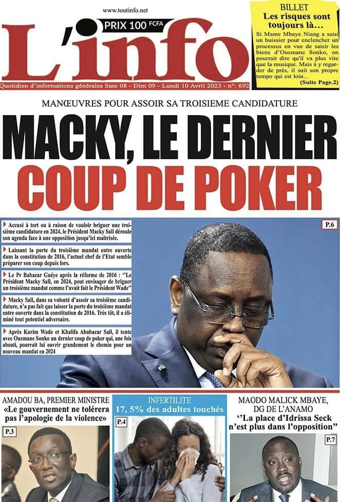 Accueil ›Actualités ›Revue de presse ›Une des journaux du samedi 08 avril 2023Une des journaux du samedi 08 avril 2023 Publié le 8 Avr 2023, à 05:12 par Abdou Faty GUEYE Une des journaux du samedi 08 avril 2023Votre avis sera publié et visible par des milliers de lecteurs. Veuillez l’exprimer dans un langage respectueux. Commentaire Nom E-mail (ne sera pas visible) Enregistrer mon nom, mon e-mail et mon site web dans le navigateur pour mon prochain commentaire. Partager Partager Partager 0 Laisser un commentaire Annuler la réponseCommentaireNom E-mail (ne sera pas visible) Enregistrer mon nom, mon e-mail et mon site dans le navigateur pour mon prochain commentaire.