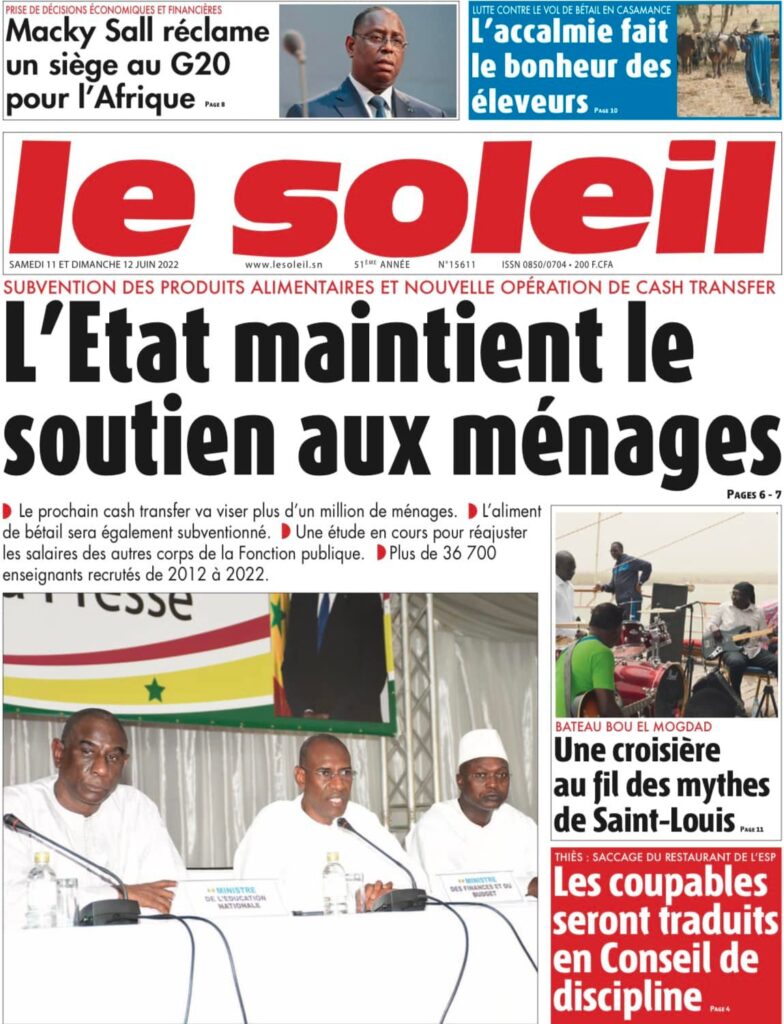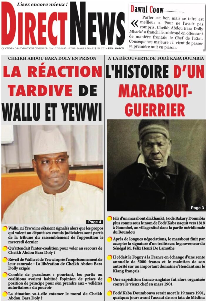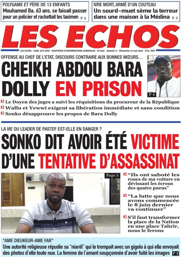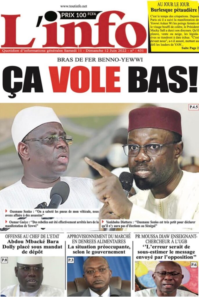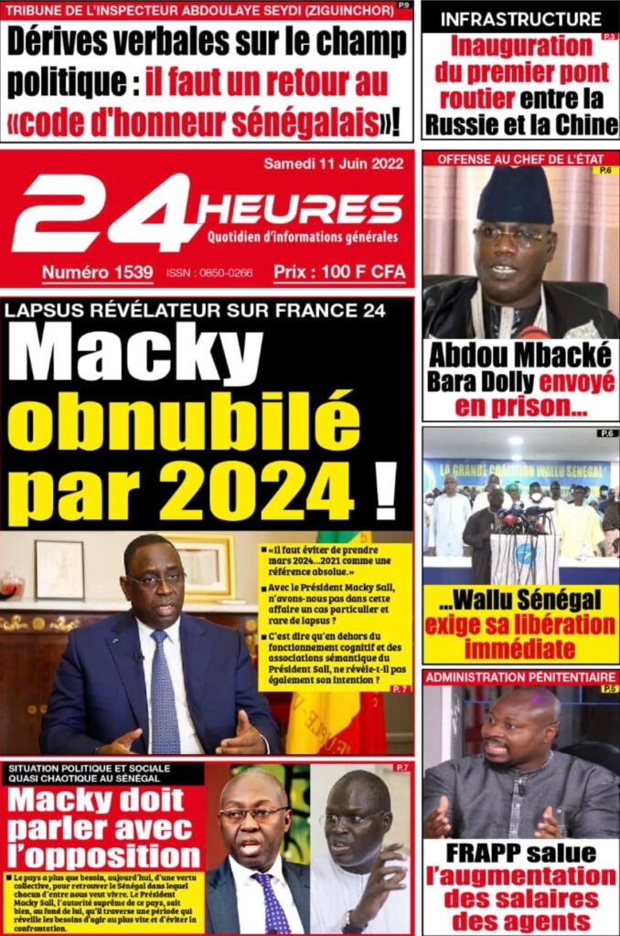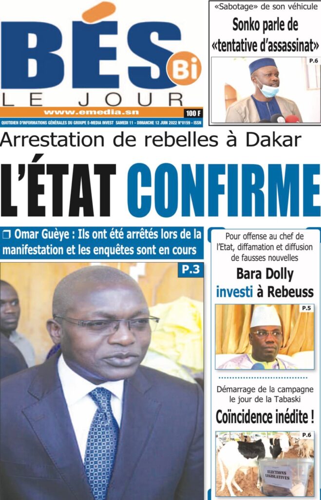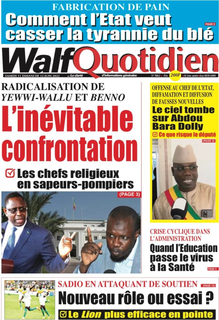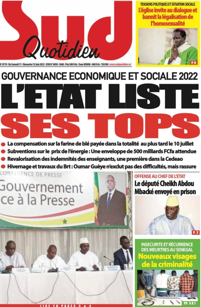 Accueil › Sénégal › Une des journaux du samedi 11 juin 2022 Une des journaux du samedi 11 juin 2022 Publié le 11 Juin 2022, à 08:04 par Abdou Faty GUEYE Une des journaux du samedi 11 juin 2022 Votre avis sera publié et visible par des milliers de lecteurs. Veuillez l’exprimer dans un langage respectueux. Commentaire Nom E-mail (ne sera pas visible) Enregistrer mon nom, mon e-mail et mon site web dans le navigateur pour mon prochain commentaire. Partager Partager Partager 0 Laisser un commentaire Annuler la réponseCommentaireNom E-mail (ne sera pas visible) Enregistrer mon nom, mon e-mail et mon site dans le navigateur pour mon prochain commentaire.