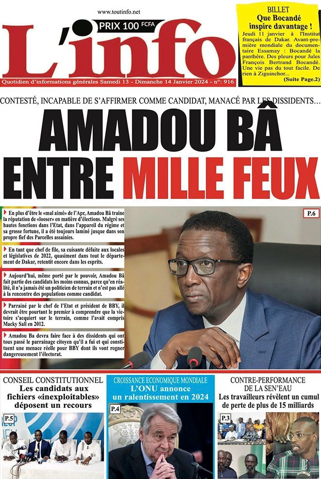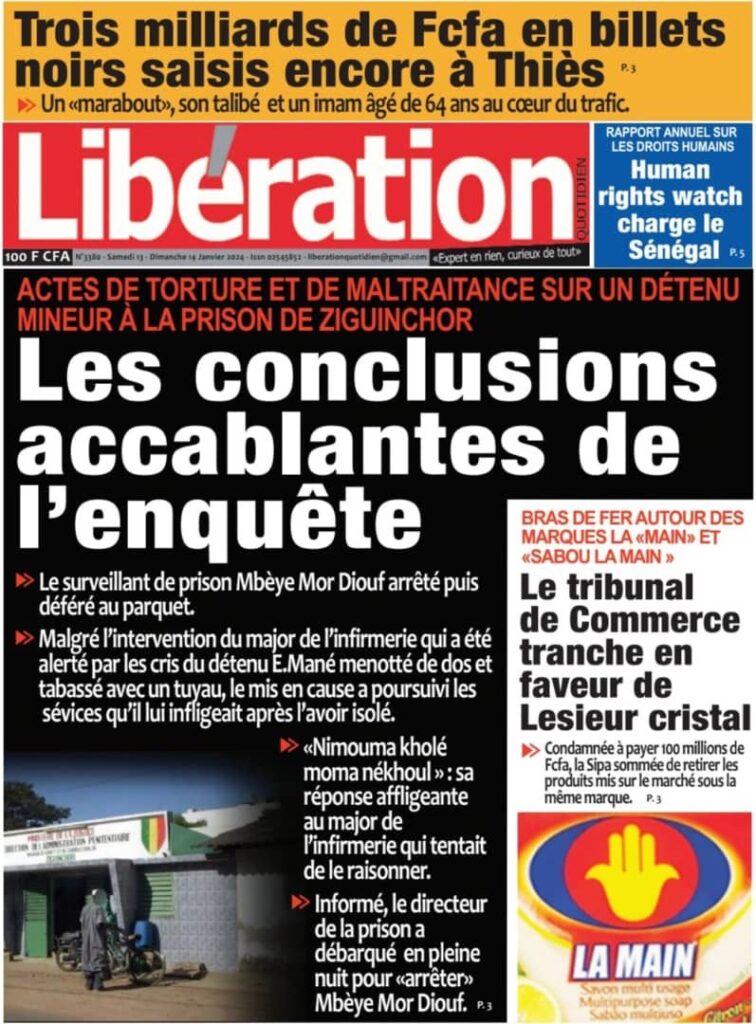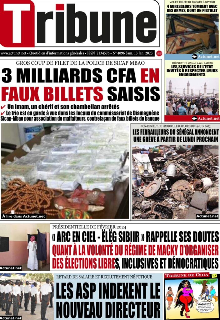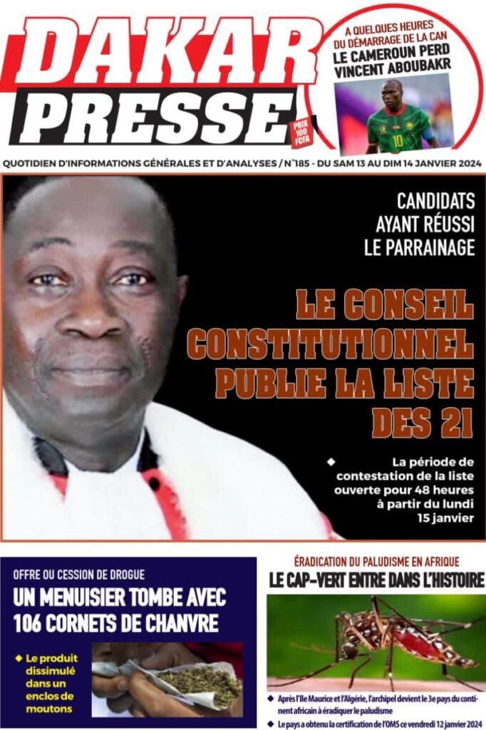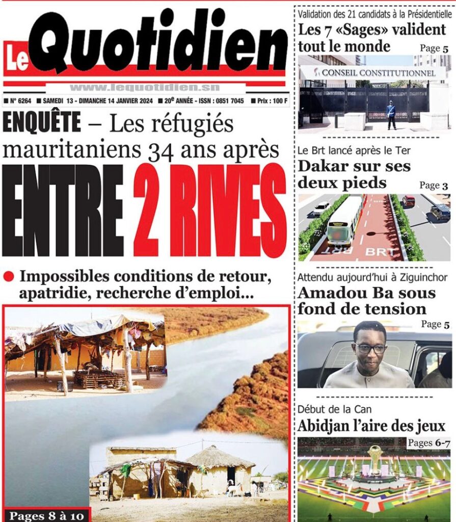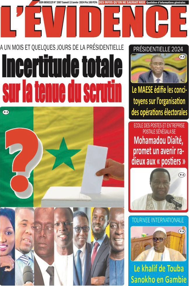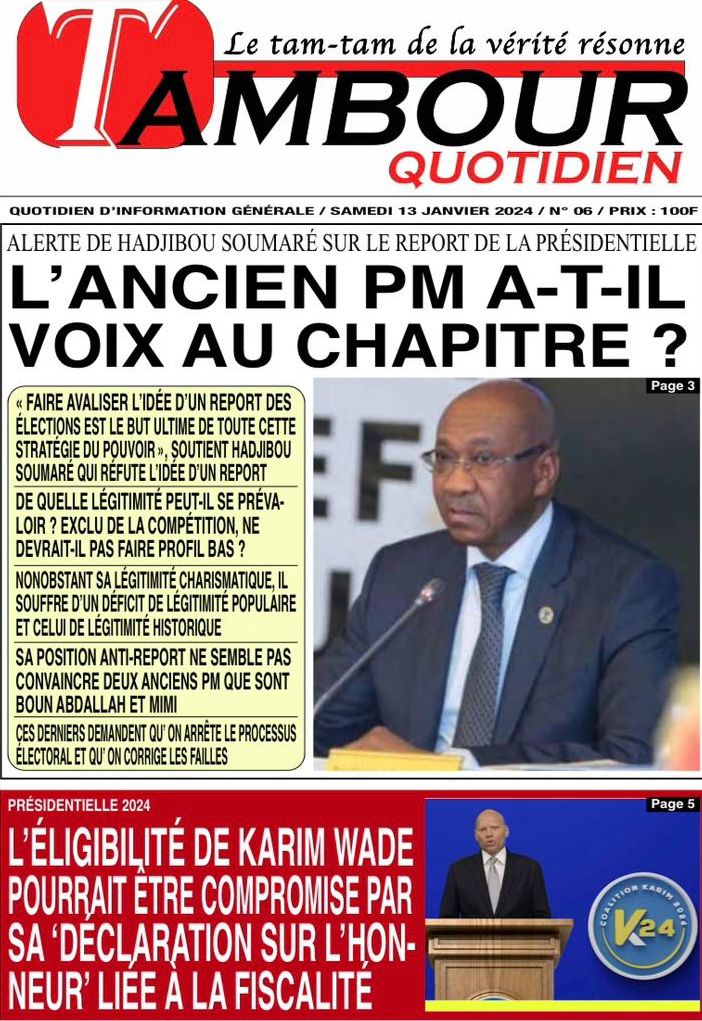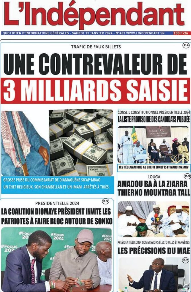 Accueil › Sénégal › Une des journaux du samedi 13 janvier 2024 Une des journaux du samedi 13 janvier 2024 Publié le 13 Jan 2024, à 08:58 par Abdou Faty GUEYE Une des journaux du samedi 13 janvier 2024 Votre avis sera publié et visible par des milliers de lecteurs. Veuillez l’exprimer dans un langage respectueux. Commentaire Nom E-mail (ne sera pas visible) Enregistrer mon nom, mon e-mail et mon site web dans le navigateur pour mon prochain commentaire. Partager Partager Partager 0 Laisser un commentaire Annuler la réponseCommentaireNom E-mail (ne sera pas visible) Enregistrer mon nom, mon e-mail et mon site dans le navigateur pour mon prochain commentaire.