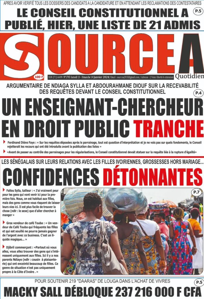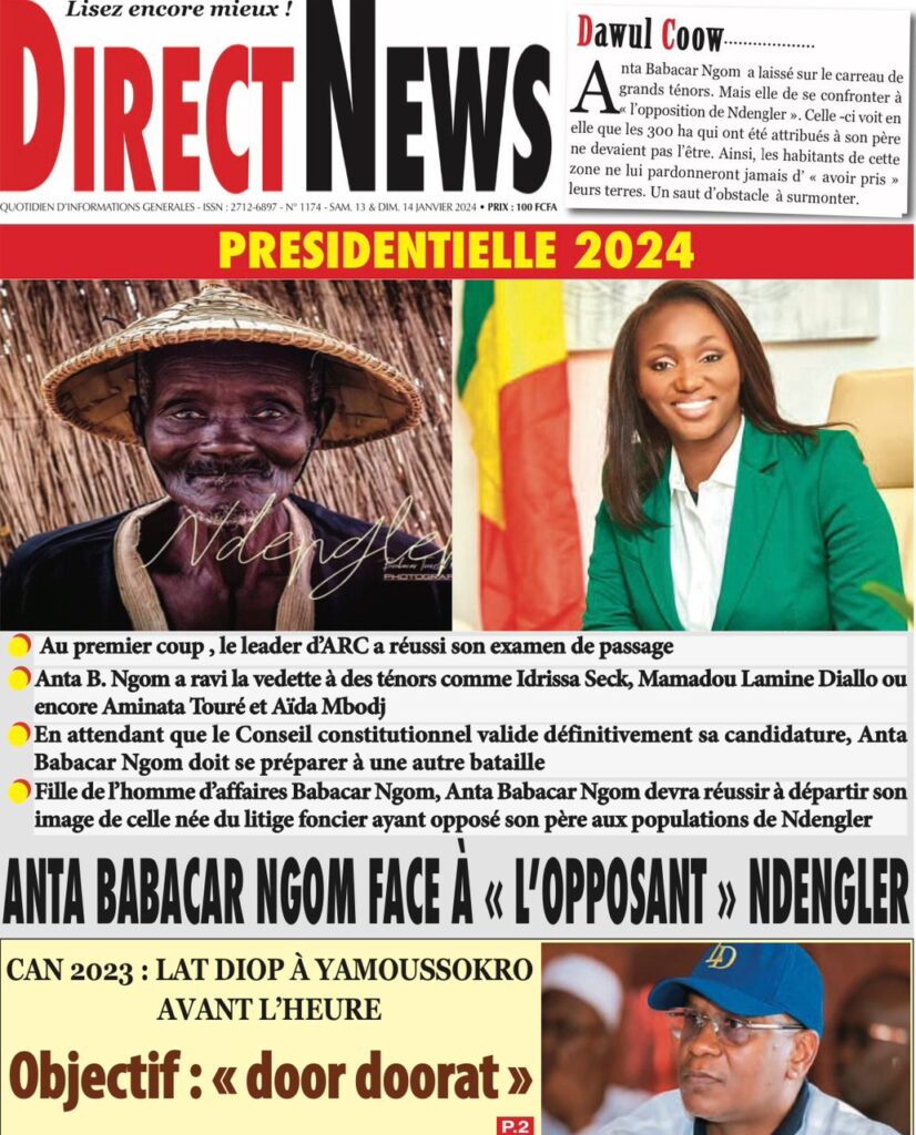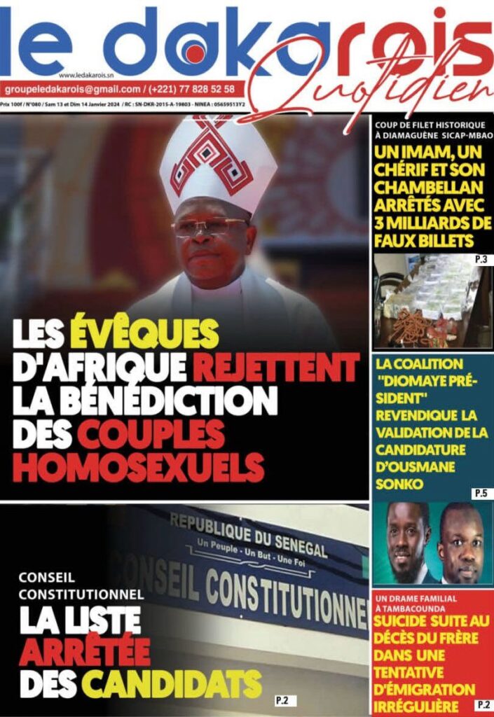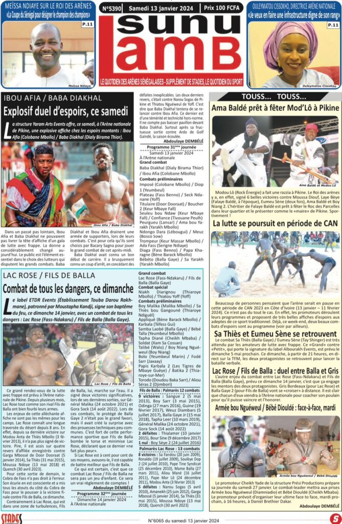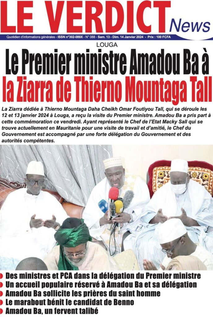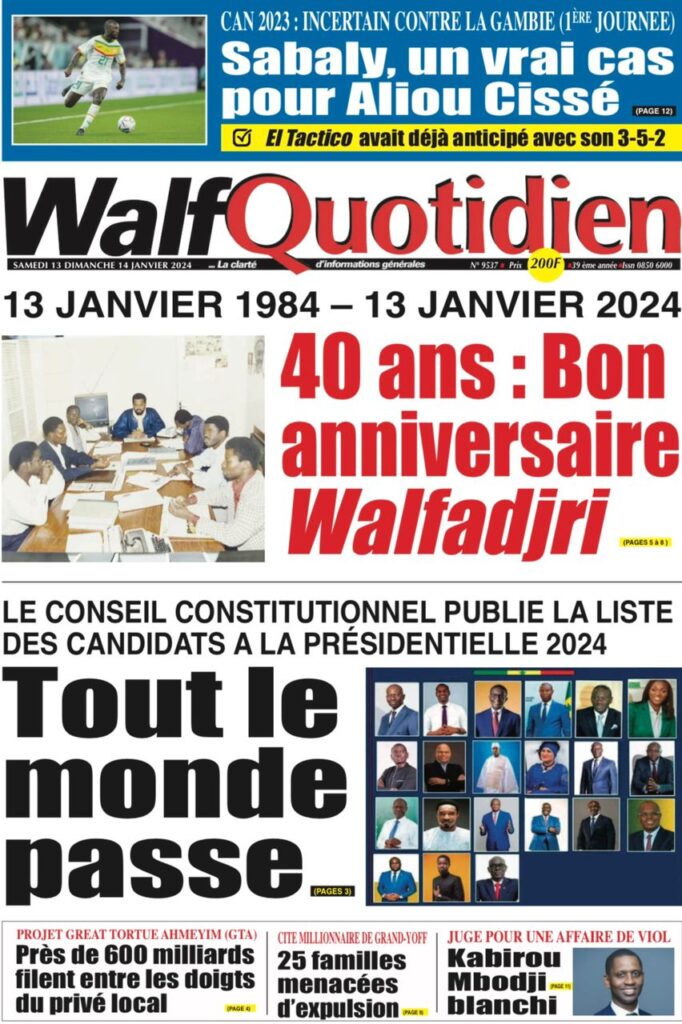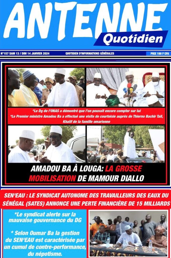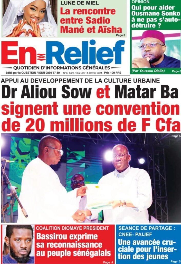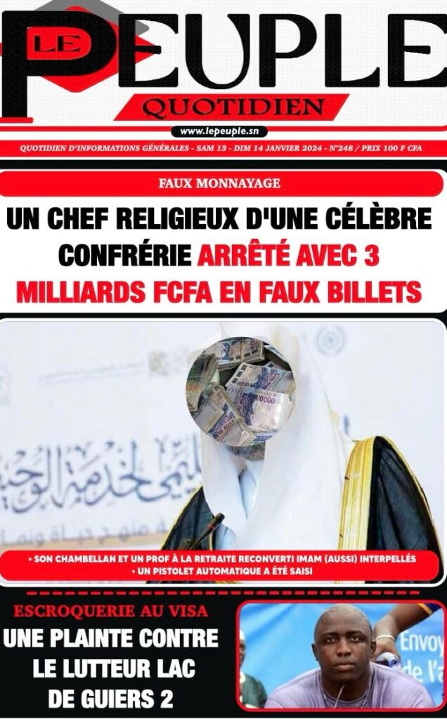 Accueil › Sénégal › Une des journaux du samedi 13 janvier 2024 Une des journaux du samedi 13 janvier 2024 Publié le 13 Jan 2024, à 08:58 par Abdou Faty GUEYE Une des journaux du samedi 13 janvier 2024 Votre avis sera publié et visible par des milliers de lecteurs. Veuillez l’exprimer dans un langage respectueux. Commentaire Nom E-mail (ne sera pas visible) Enregistrer mon nom, mon e-mail et mon site web dans le navigateur pour mon prochain commentaire. Partager Partager Partager 0 Laisser un commentaire Annuler la réponseCommentaireNom E-mail (ne sera pas visible) Enregistrer mon nom, mon e-mail et mon site dans le navigateur pour mon prochain commentaire.
