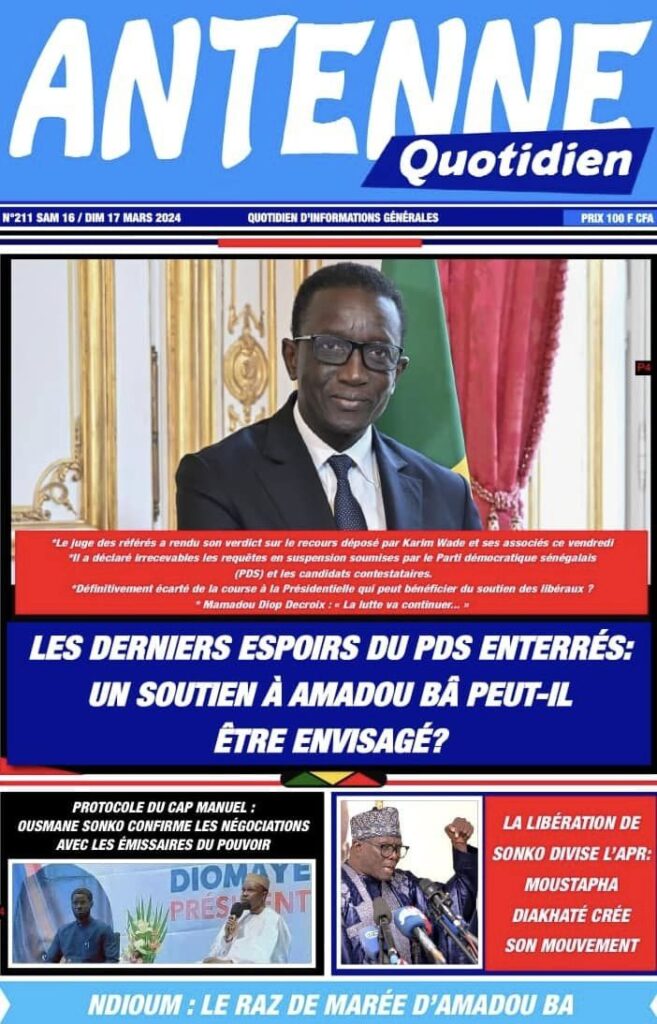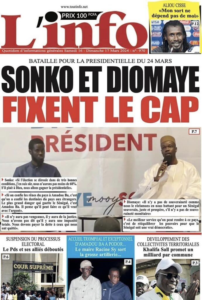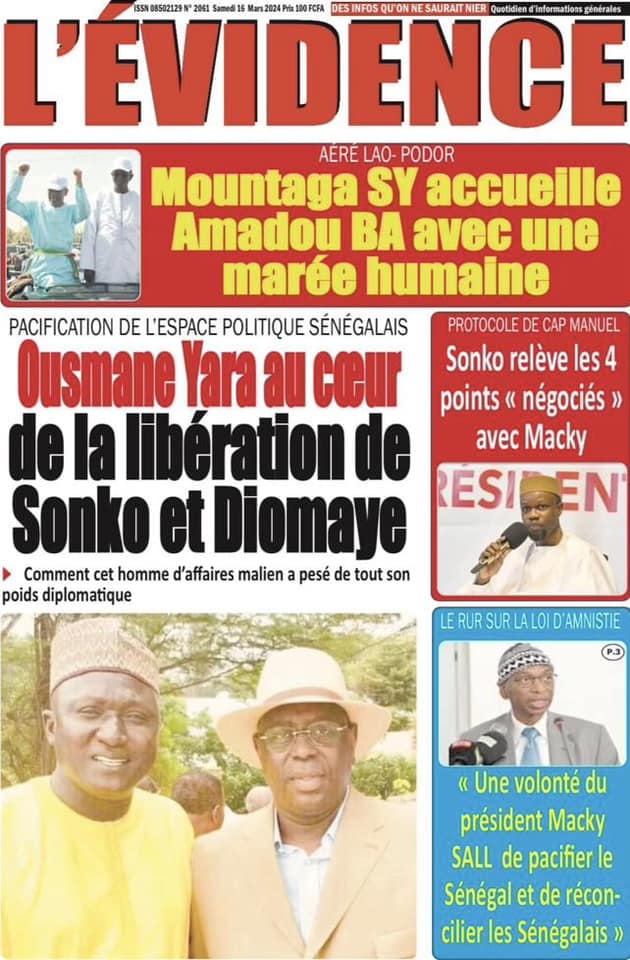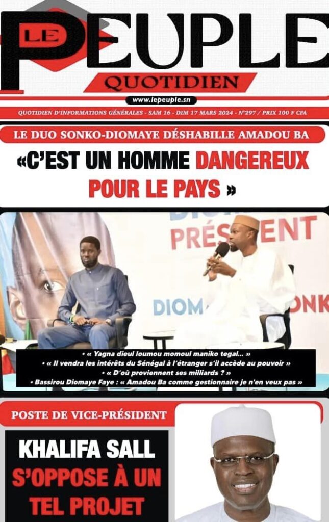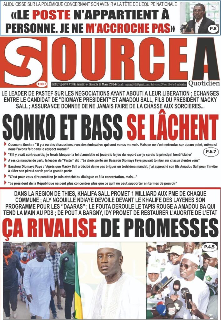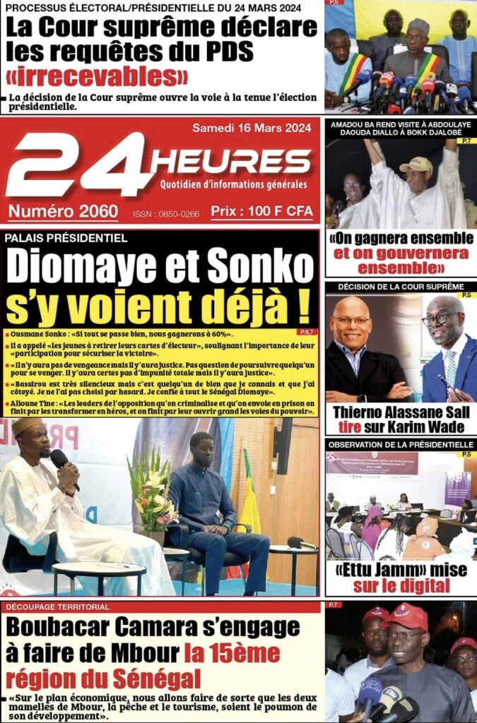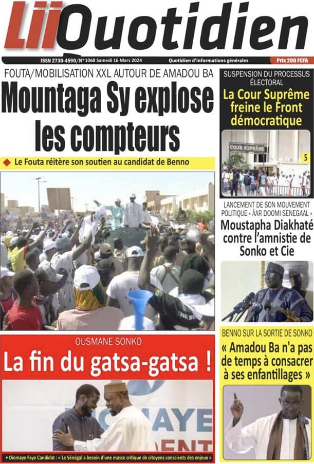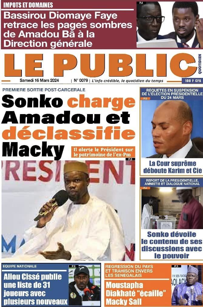 Accueil › Sénégal › Une des journaux du samedi 16 mars 2024 Une des journaux du samedi 16 mars 2024 Publié le 16 Mar 2024, à 05:58 par Abdou Faty GUEYE Une des journaux du samedi 16 mars 2024 Votre avis sera publié et visible par des milliers de lecteurs. Veuillez l’exprimer dans un langage respectueux. Commentaire Nom E-mail (ne sera pas visible) Enregistrer mon nom, mon e-mail et mon site web dans le navigateur pour mon prochain commentaire. Partager Partager Partager 0 Laisser un commentaire Annuler la réponseCommentaireNom E-mail (ne sera pas visible) Enregistrer mon nom, mon e-mail et mon site dans le navigateur pour mon prochain commentaire.